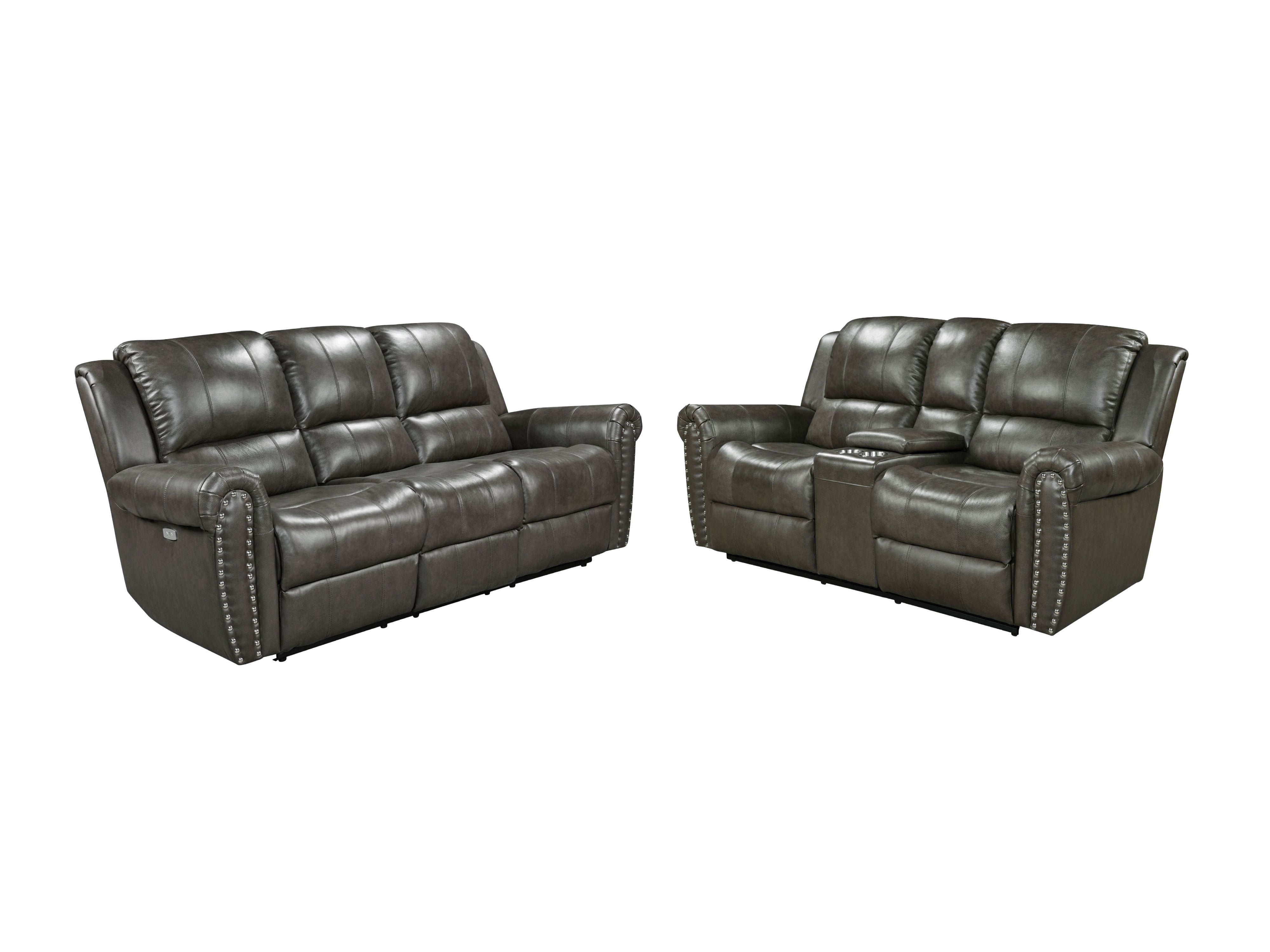 Transform your living space with this luxurious 2-piece living room set, which includes a power reclining sofa and a stationary loveseat. This set boasts modern pub back styling, oversized boxed pad-over-chaise seating with pocketed coils, and power recline for the ultimate comfort. Crafted with top-grain leather and foam cushioning, it combines elegance with durability. The set is finished in a sophisticated grey color that effortlessly complements any room decor. Easily adjust the recline angle of the sofa with the power button control, while the stationary loveseat adds a touch of refinement. The set features a USB console, round armrests with extra cushions, and ventilated backrest cushions to keep you cool. This stylish and comfortable addition to any home will allow you to relax and recharge your electronic devices.
