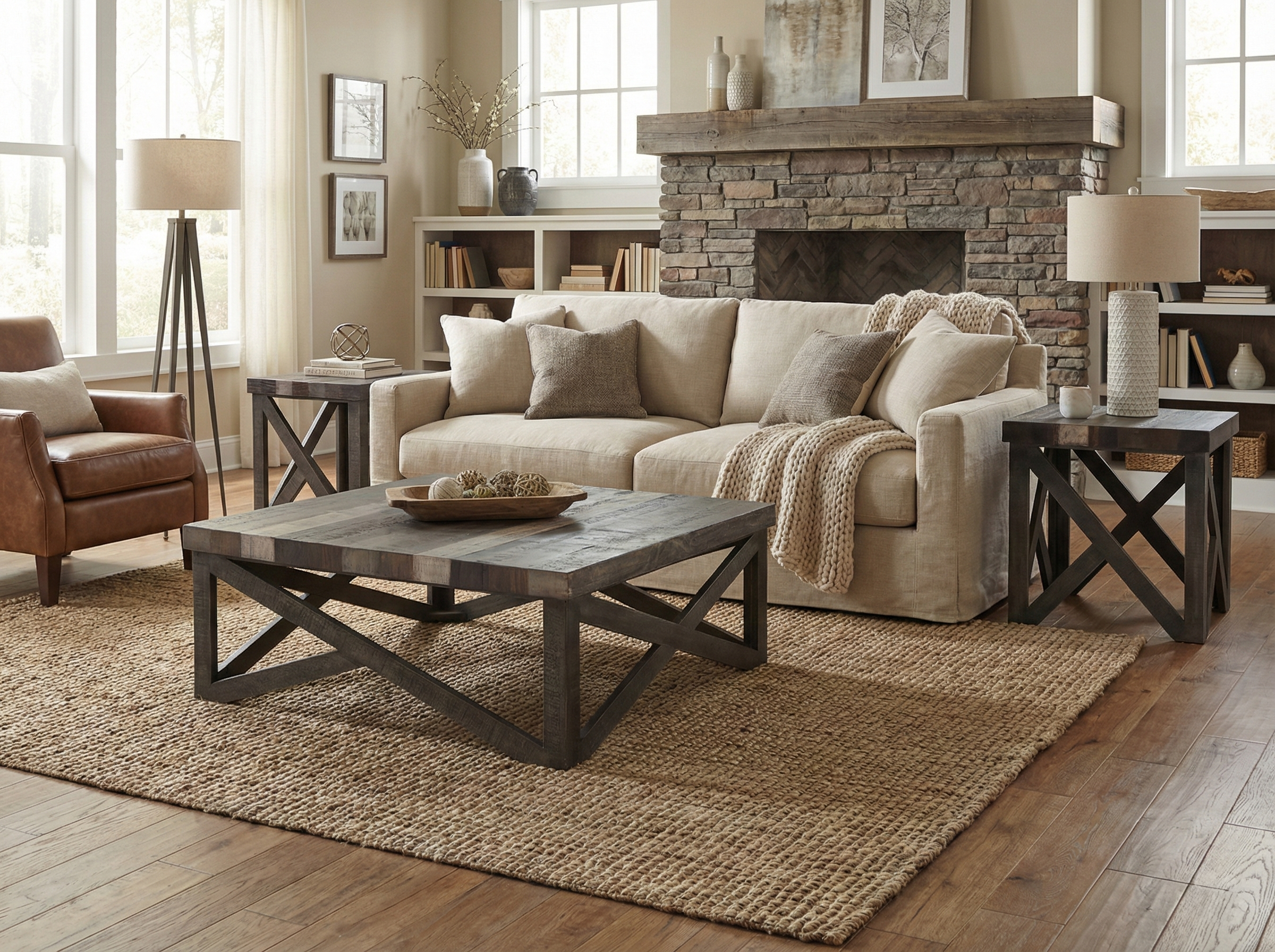 A great table group for the modern colorful lovers. The trestle design is classic and the combination oak and multicolored finish is not only stylish but eclectic enough to be used in almost any setting. This 3 piece coffee table set adds a rustic flair to your living room with its sophisticated X design.