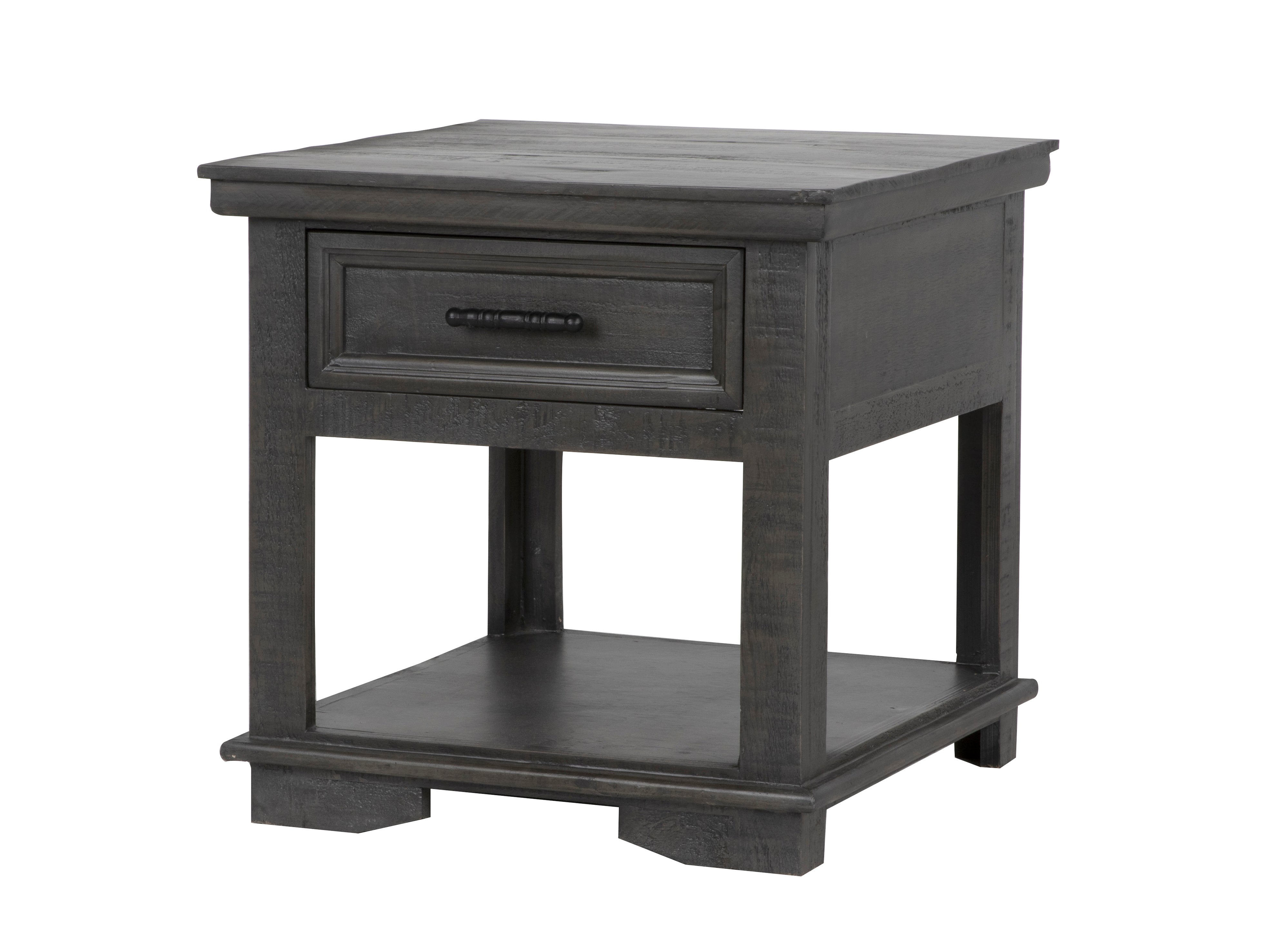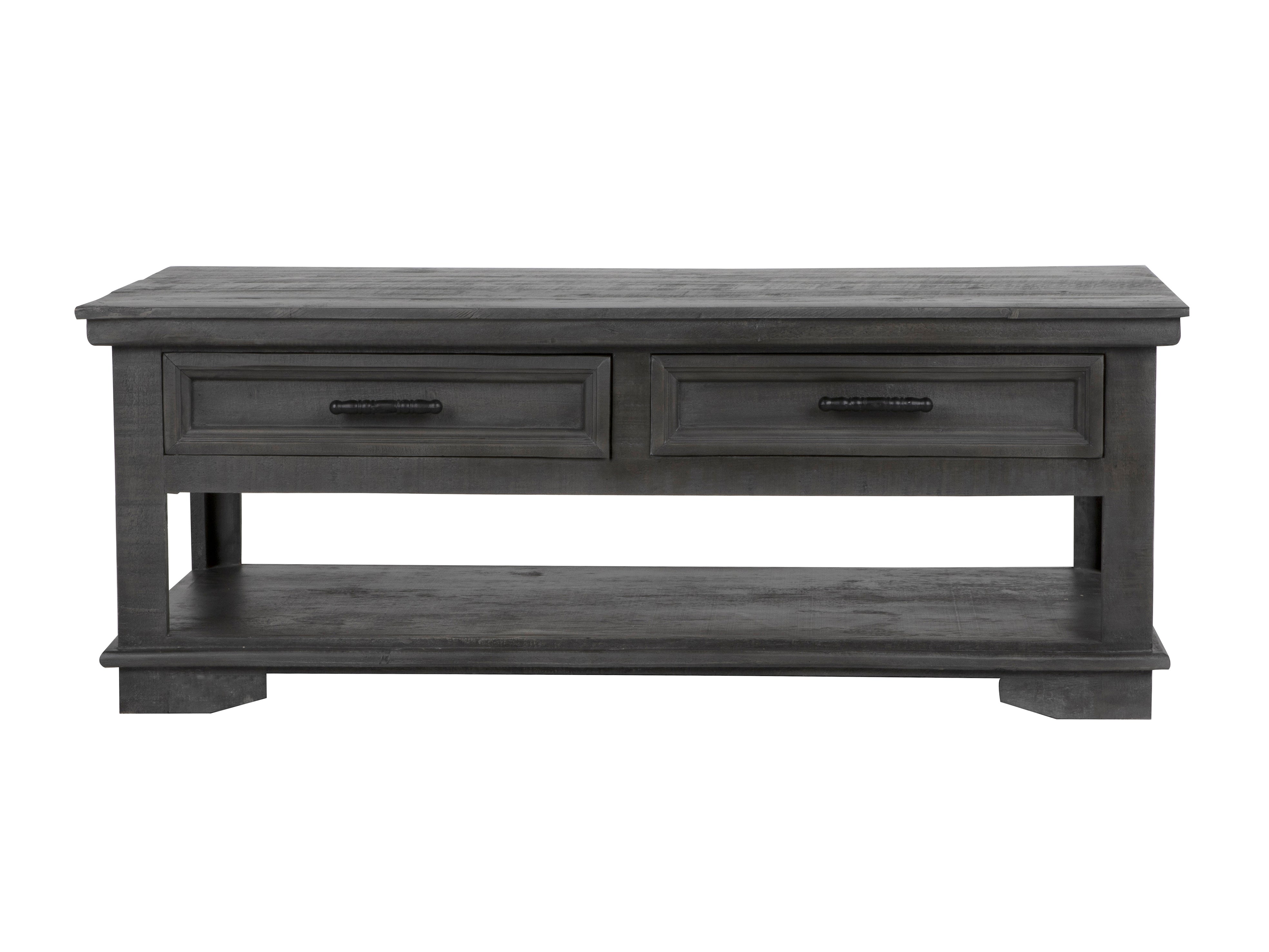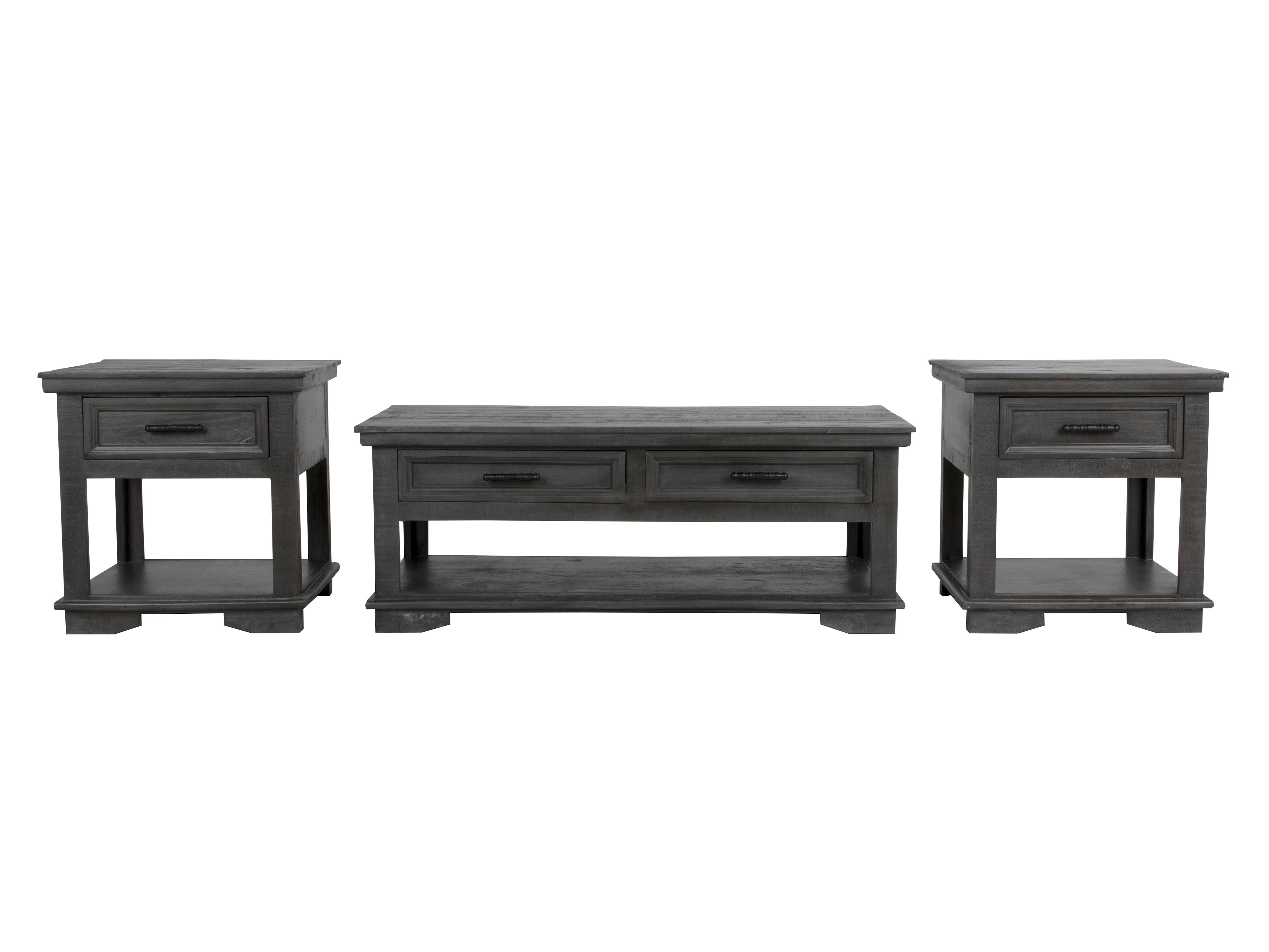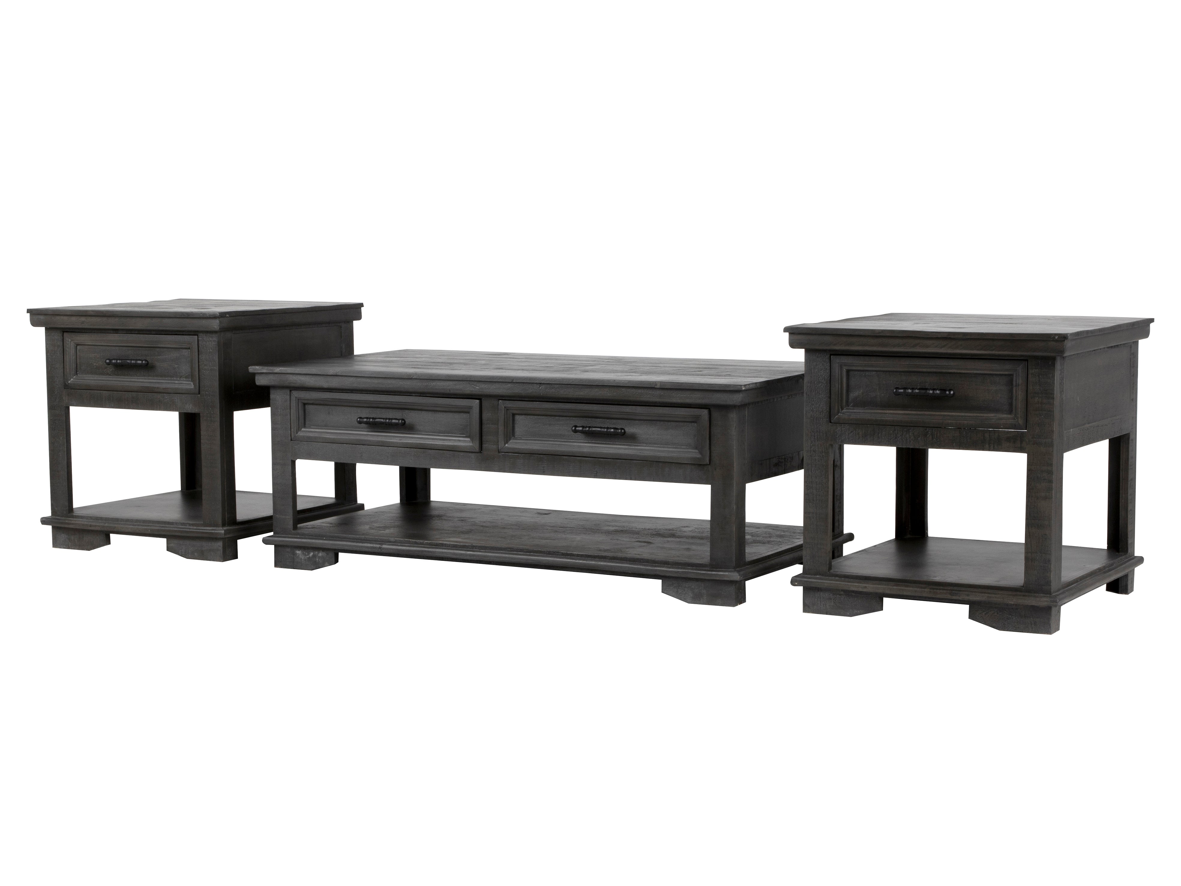 This 3 piece coffee table set has a gorgeous rustic style. Constructed of solid wood that offers just the right amount of distressing that can blend easily with rustic, distressed, or farmhouse looks. The coffee table features four drawers that pull all the way through allowing for access on both sides. The drawers offer plenty of space for storing tv controllers, magazines, board games and other items. A bottom shelf is offered for additional storage. Pair of end tables make a clean-lined complement.