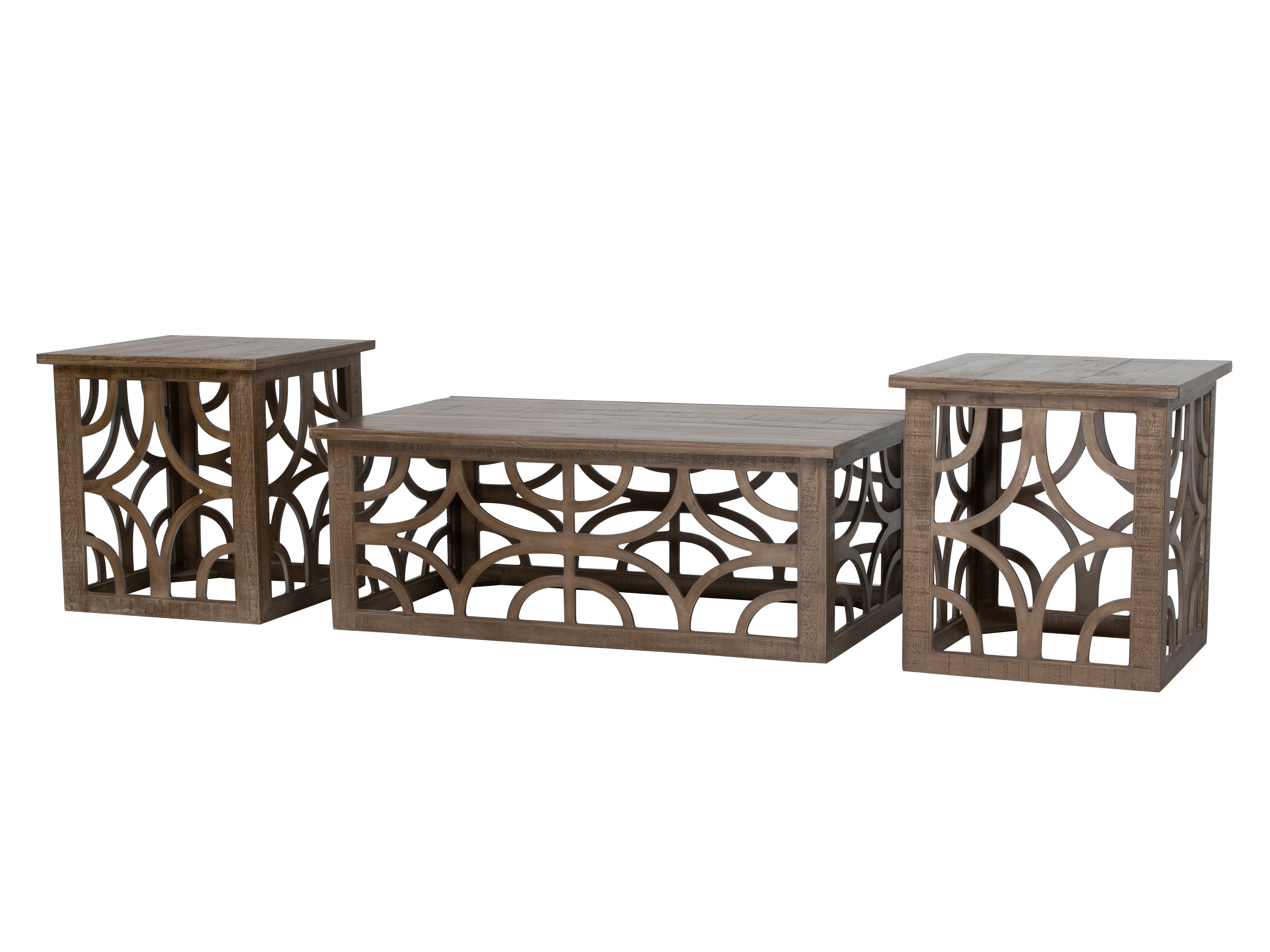 Bring a touch of country chic into your living room or den with this 3 piece coffee table set. This table set has a charming and rustic design with a distressed finish and includes wooden lattice style grilles. The generous rectangle shape provides plenty of space for game nights, books near at hand, or even casual snacking. Its sophisticated architectural design perfectly complements any style, from farmhouse to country cottage to laid-back traditional.