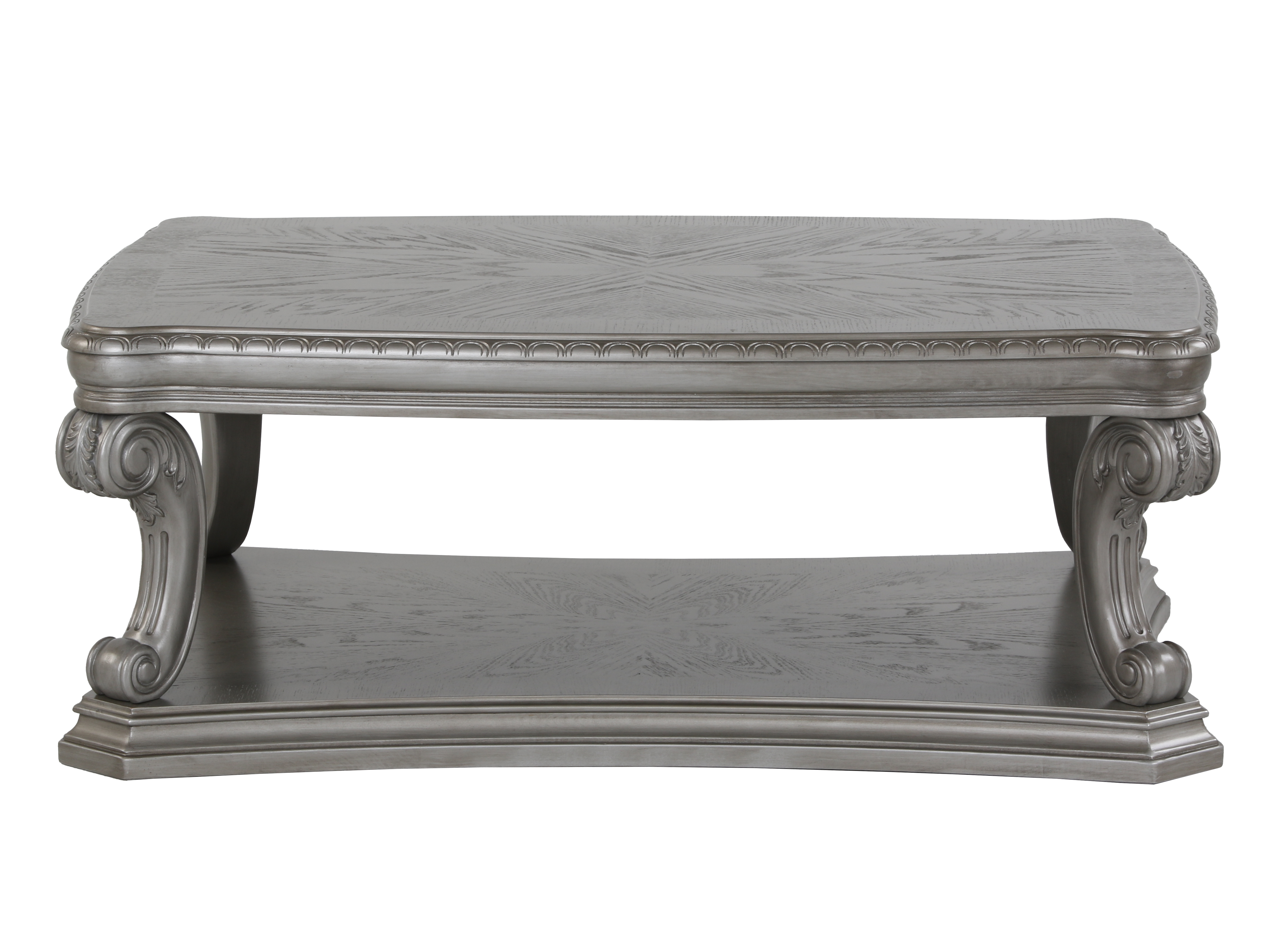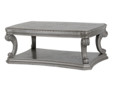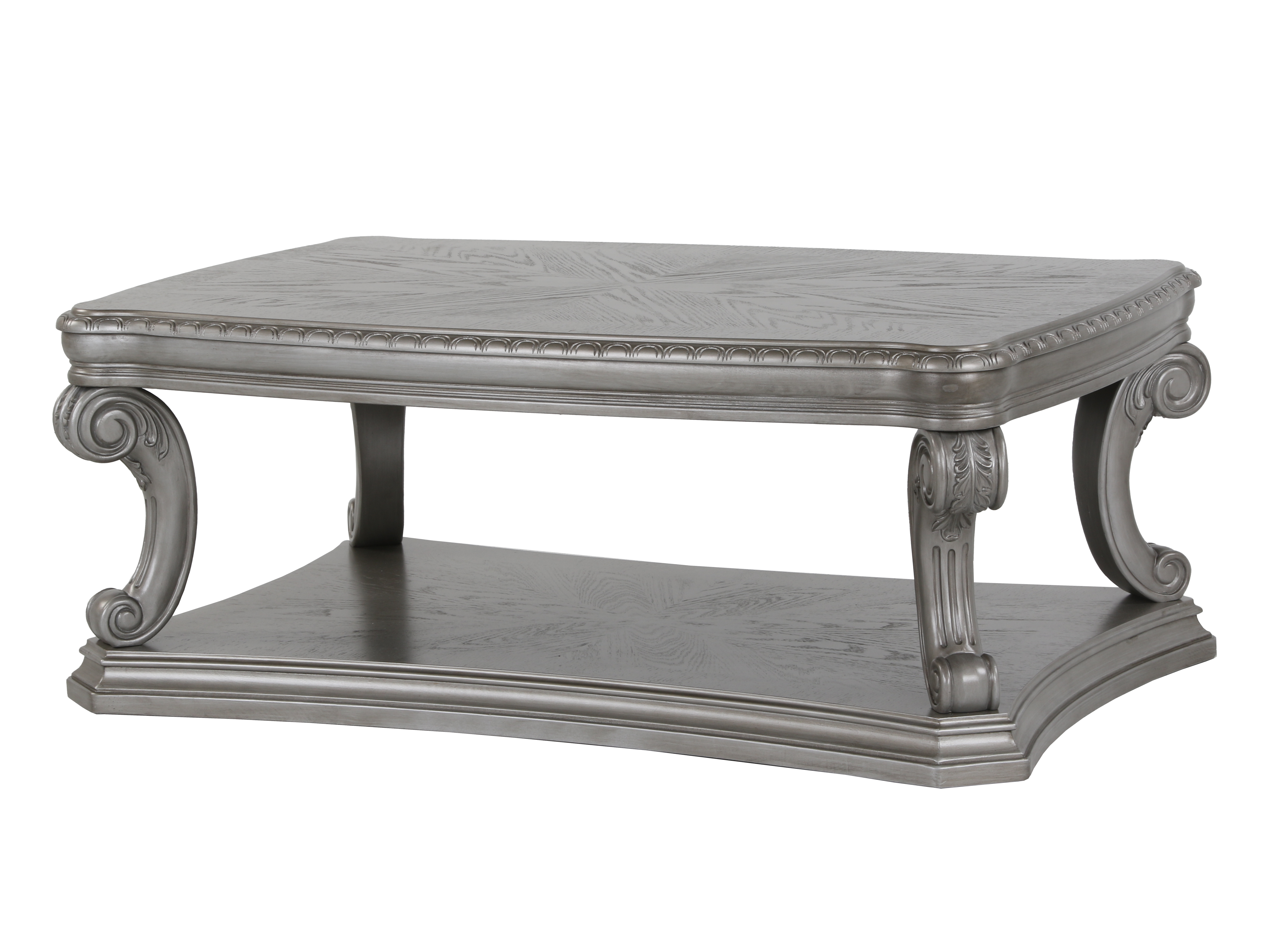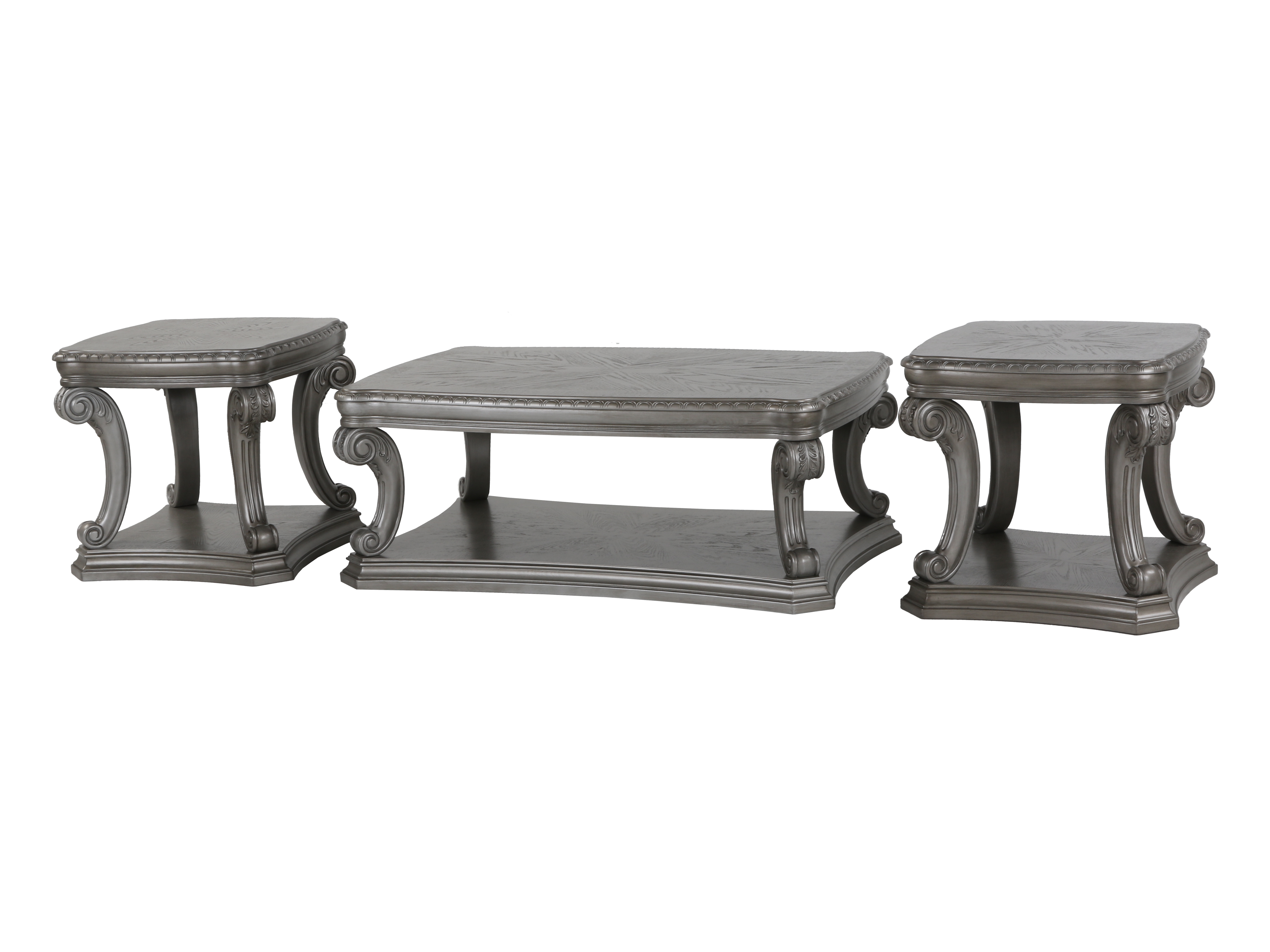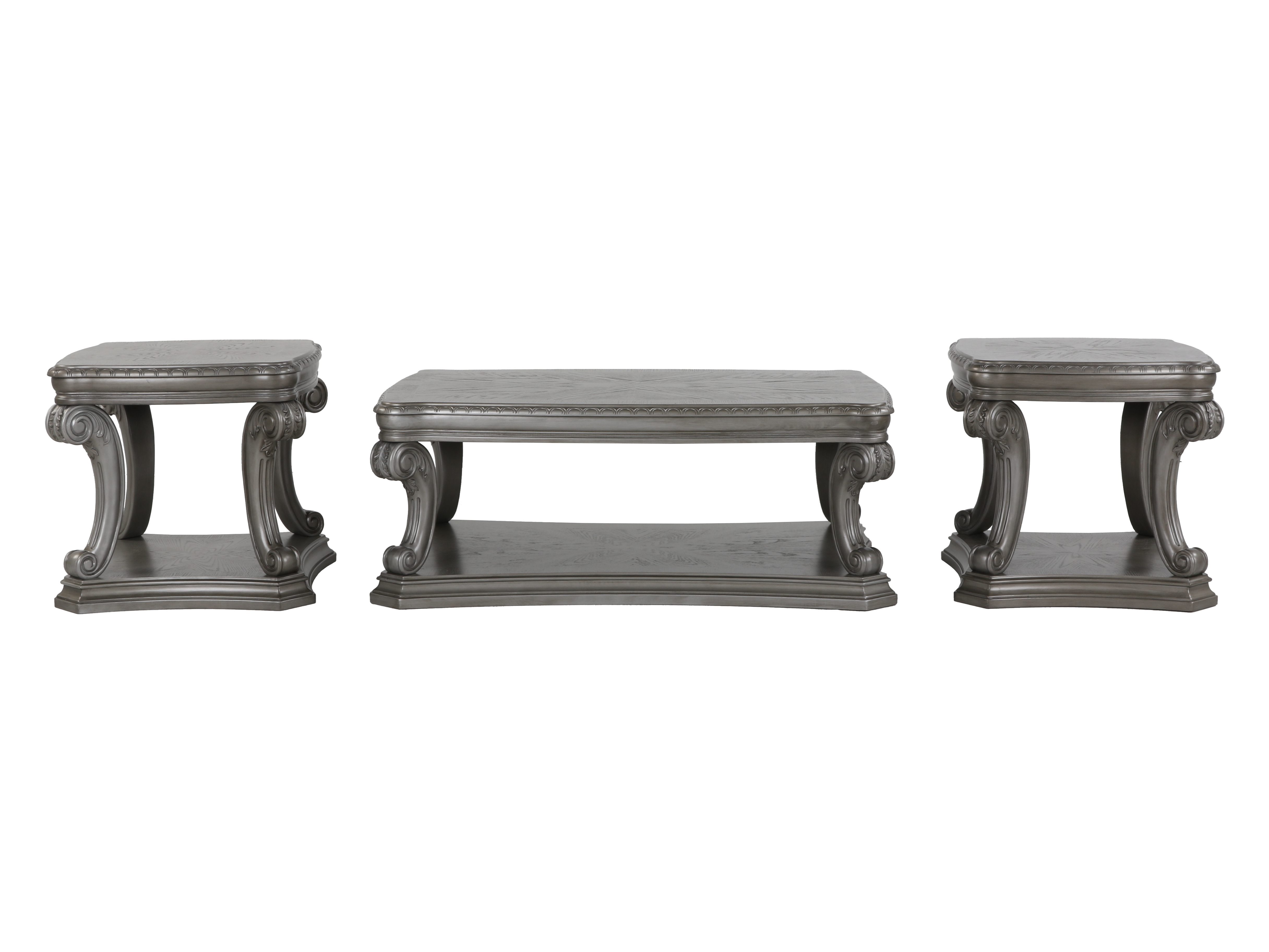Transform your living space with an exquisite 3-piece coffee table set that includes a coffee table and 2 end tables. The coffee table boasts a beautiful wood top and elegant floral scrolled legs in a classic rectangular design. Meanwhile, the square end tables feature an open bottom shelf for storage and a platinum color finish that exudes a regal aura. Get ready to elevate your home décor with this luxurious set.