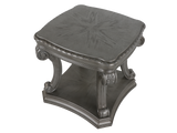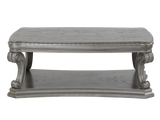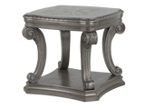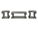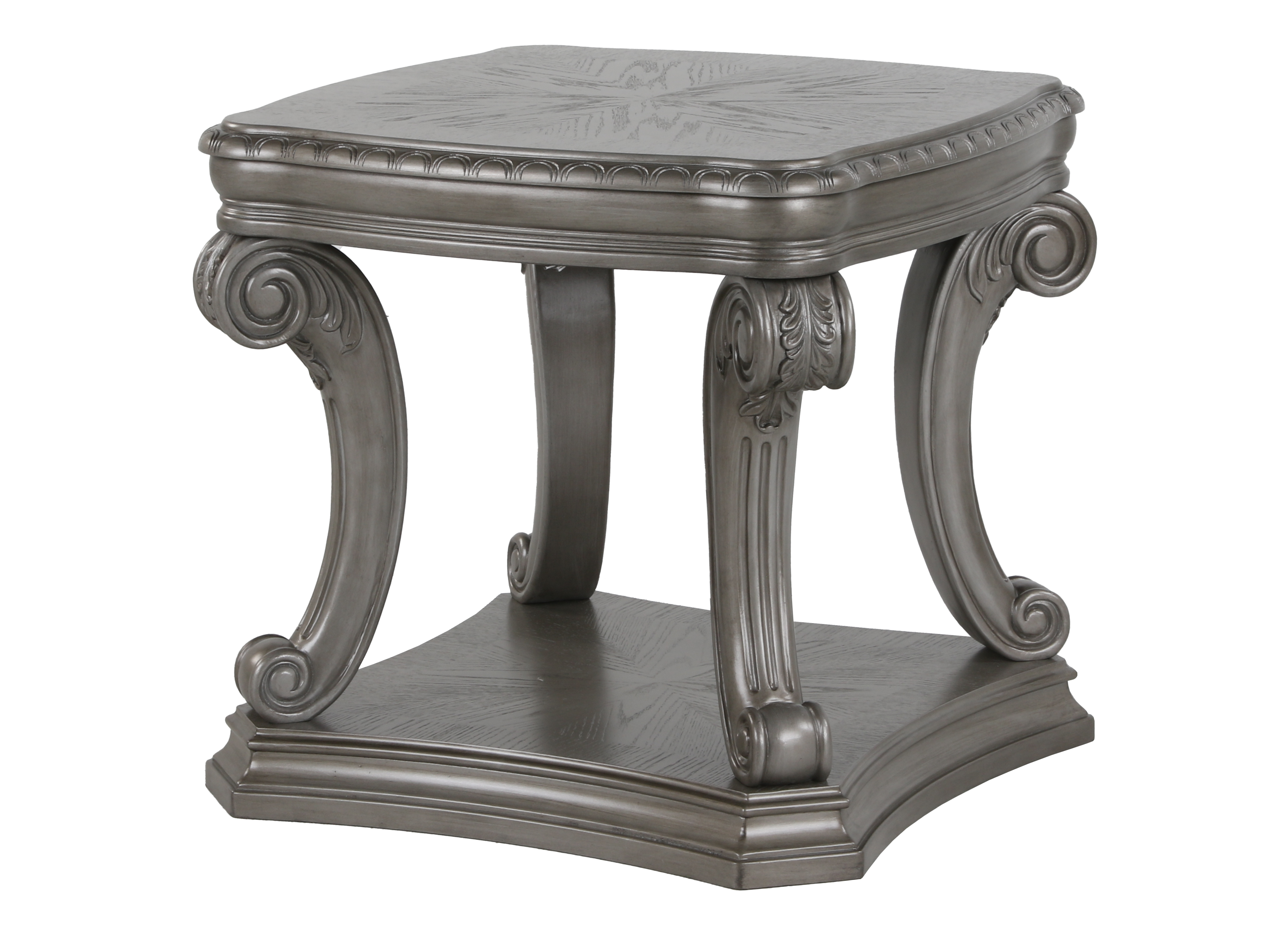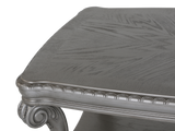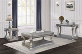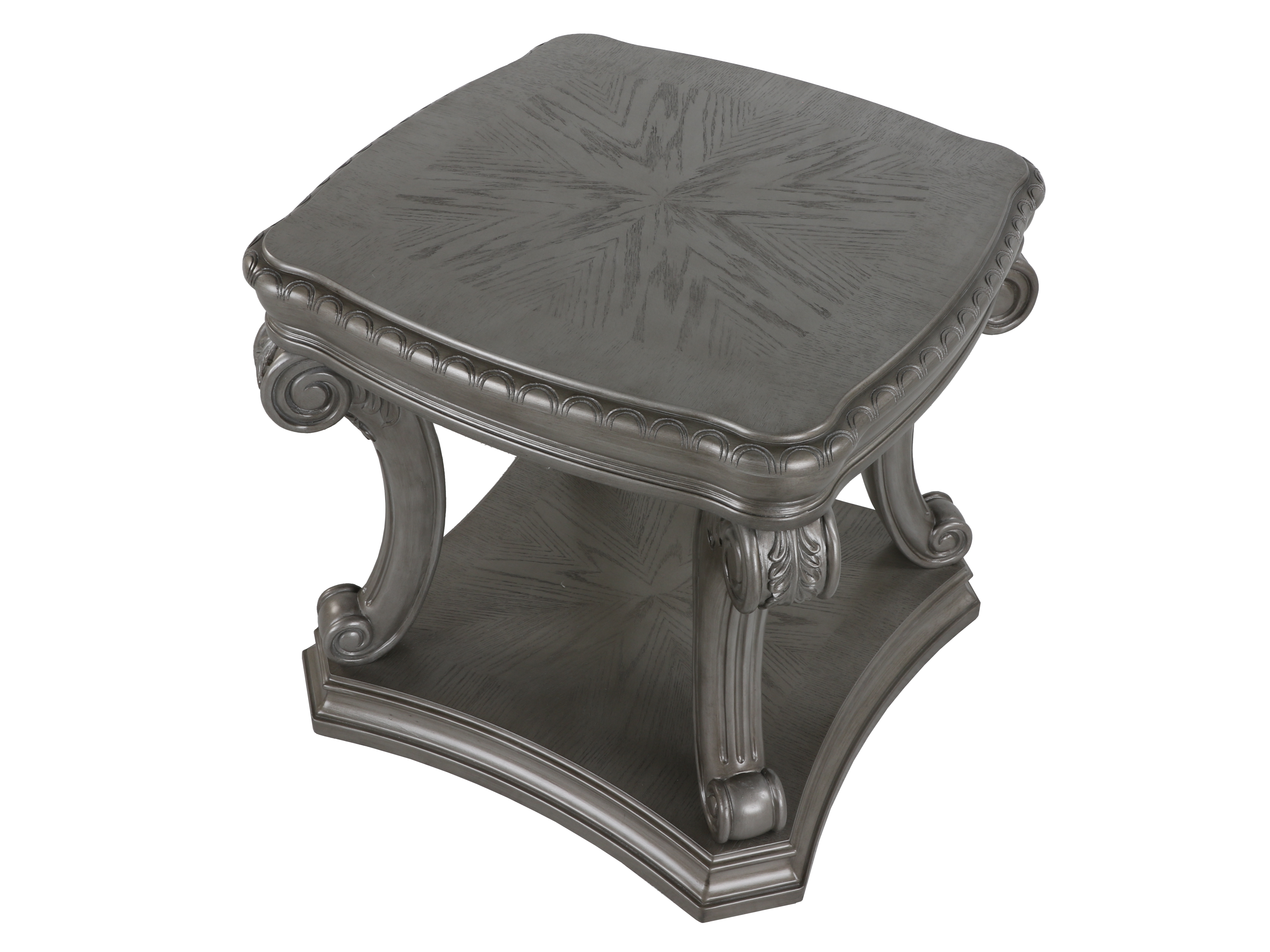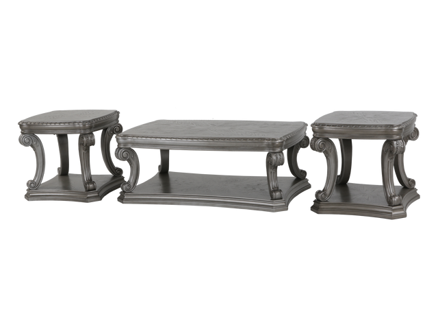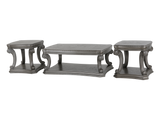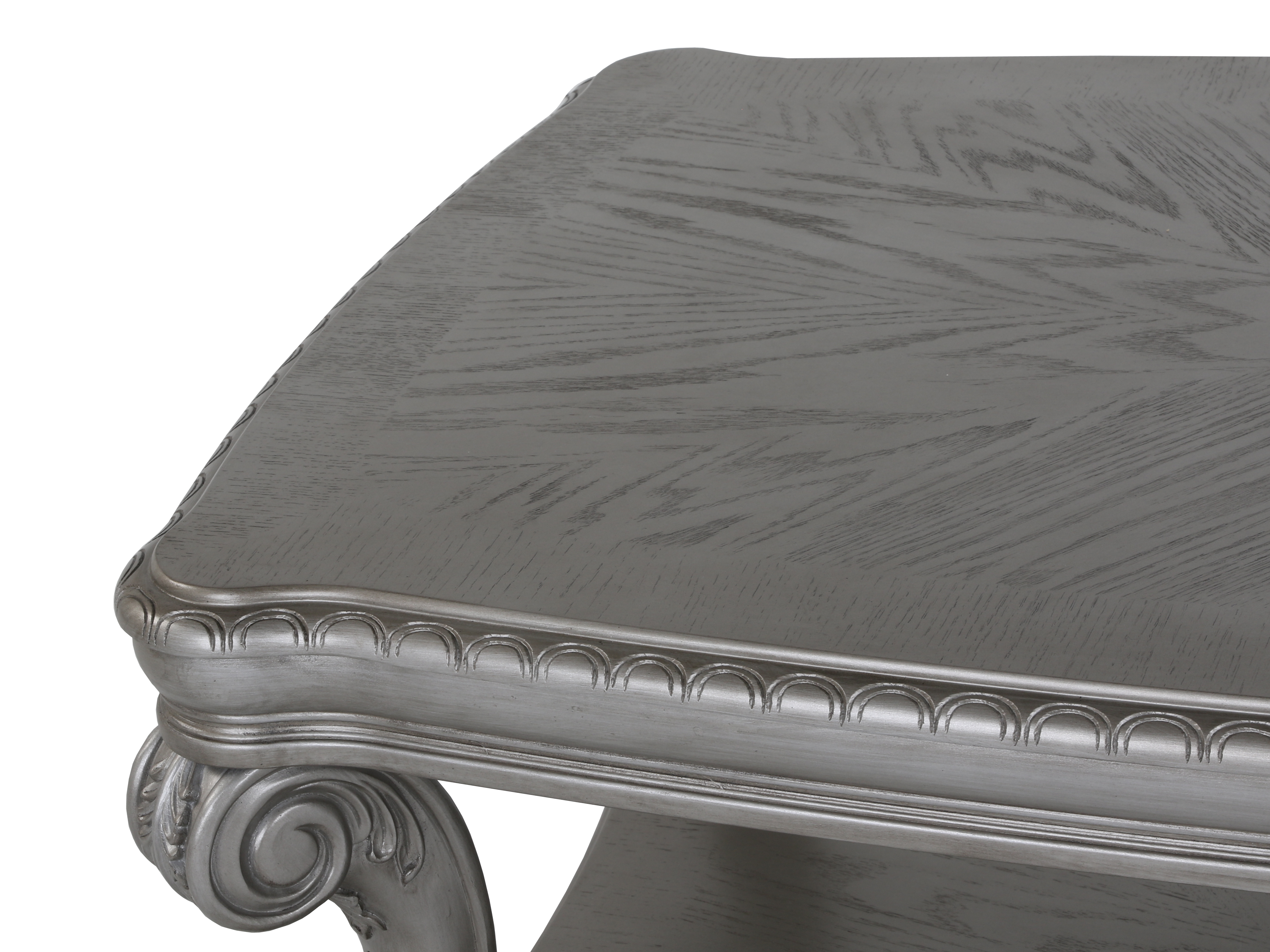 Transform your living space with an exquisite 3-piece coffee table set that includes a coffee table and 2 end tables. The coffee table boasts a beautiful wood top and elegant floral scrolled legs in a classic rectangular design. Meanwhile, the square end tables feature an open bottom shelf for storage and a platinum color finish that exudes a regal aura. Get ready to elevate your home décor with this luxurious set.