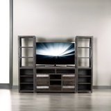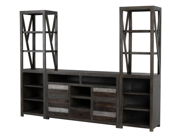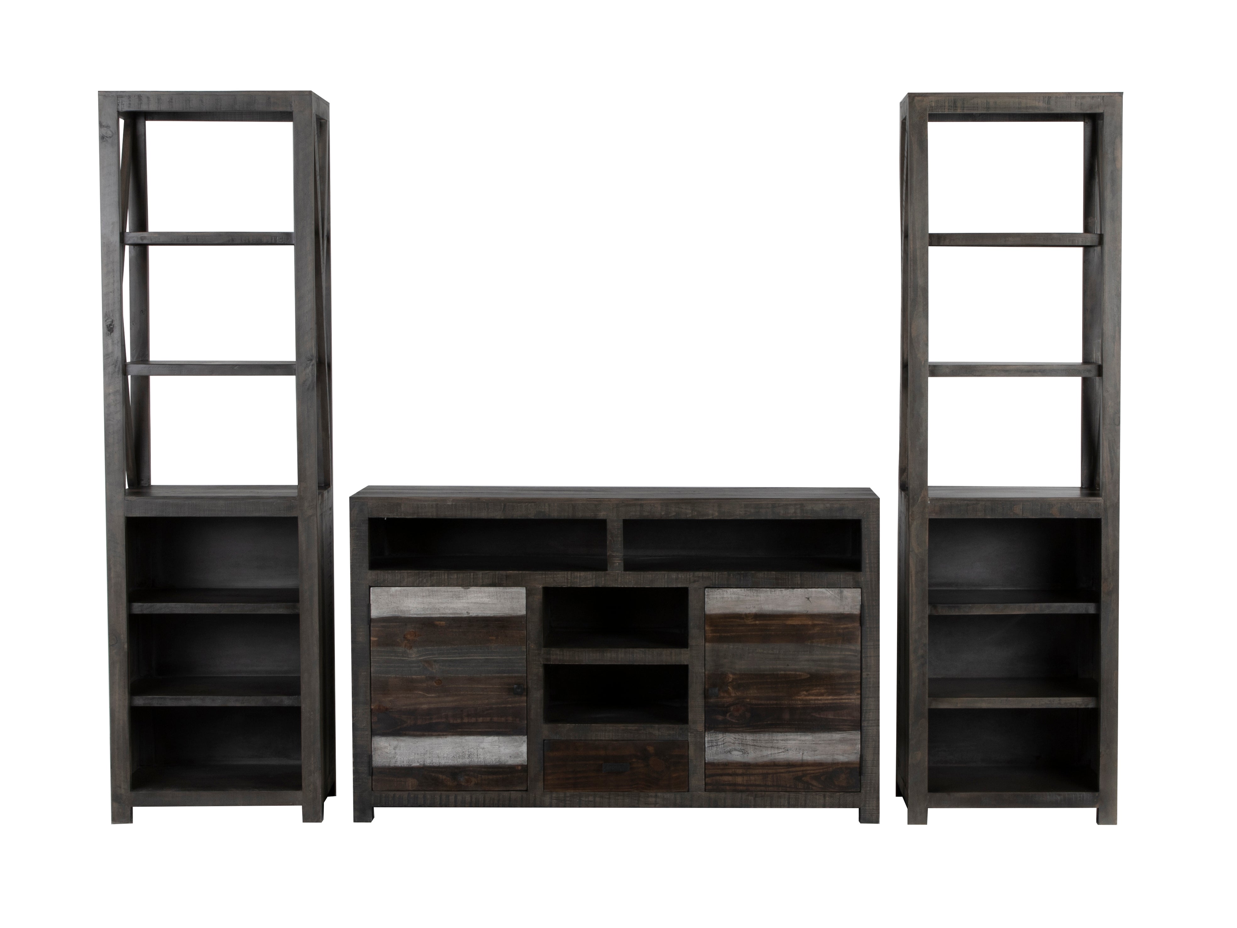 This 3-piece entertainment center is the essence of rustic country style with distressed solid wood handcrafted into spectacular furniture perfect for your entertainment area. Each piece is unique with subtle distressing that brings out the beauty of the natural wood. It includes two bookcases and a TV stand. Each piece is made from solid wood with a multicolor in grey hue. The stand has four open shelves and two pull-out drawers that are just right for entertainment accessories, cable boxes, and a game console.