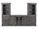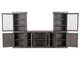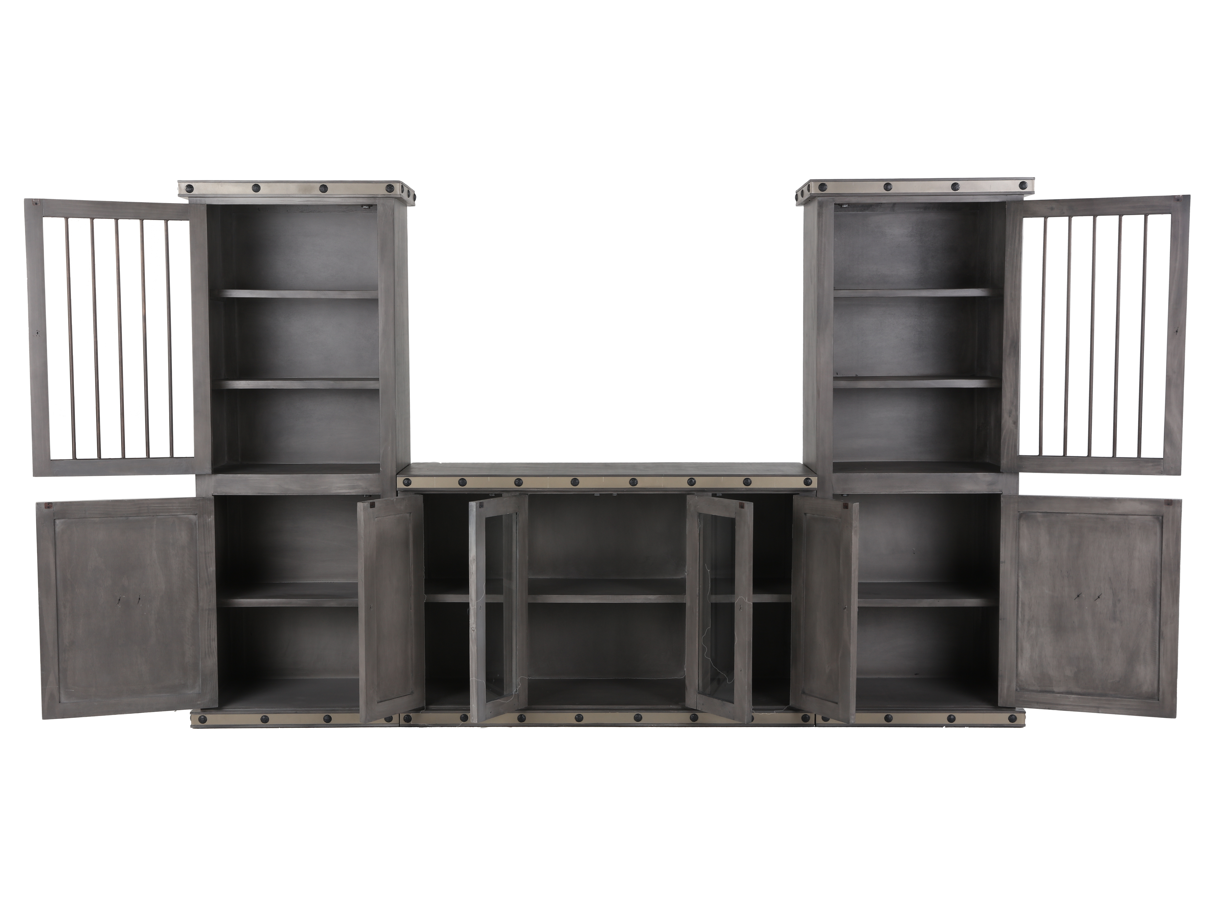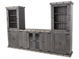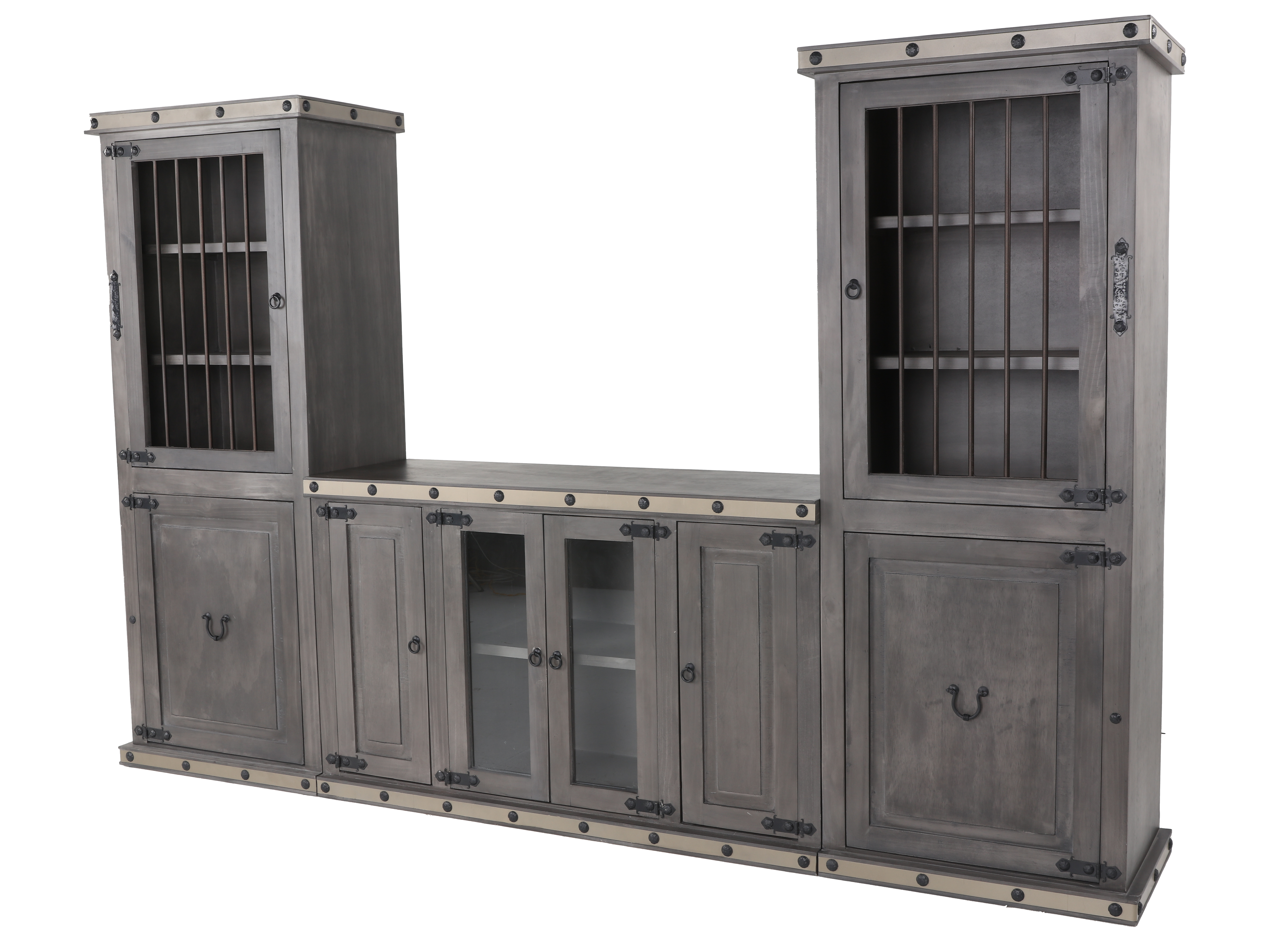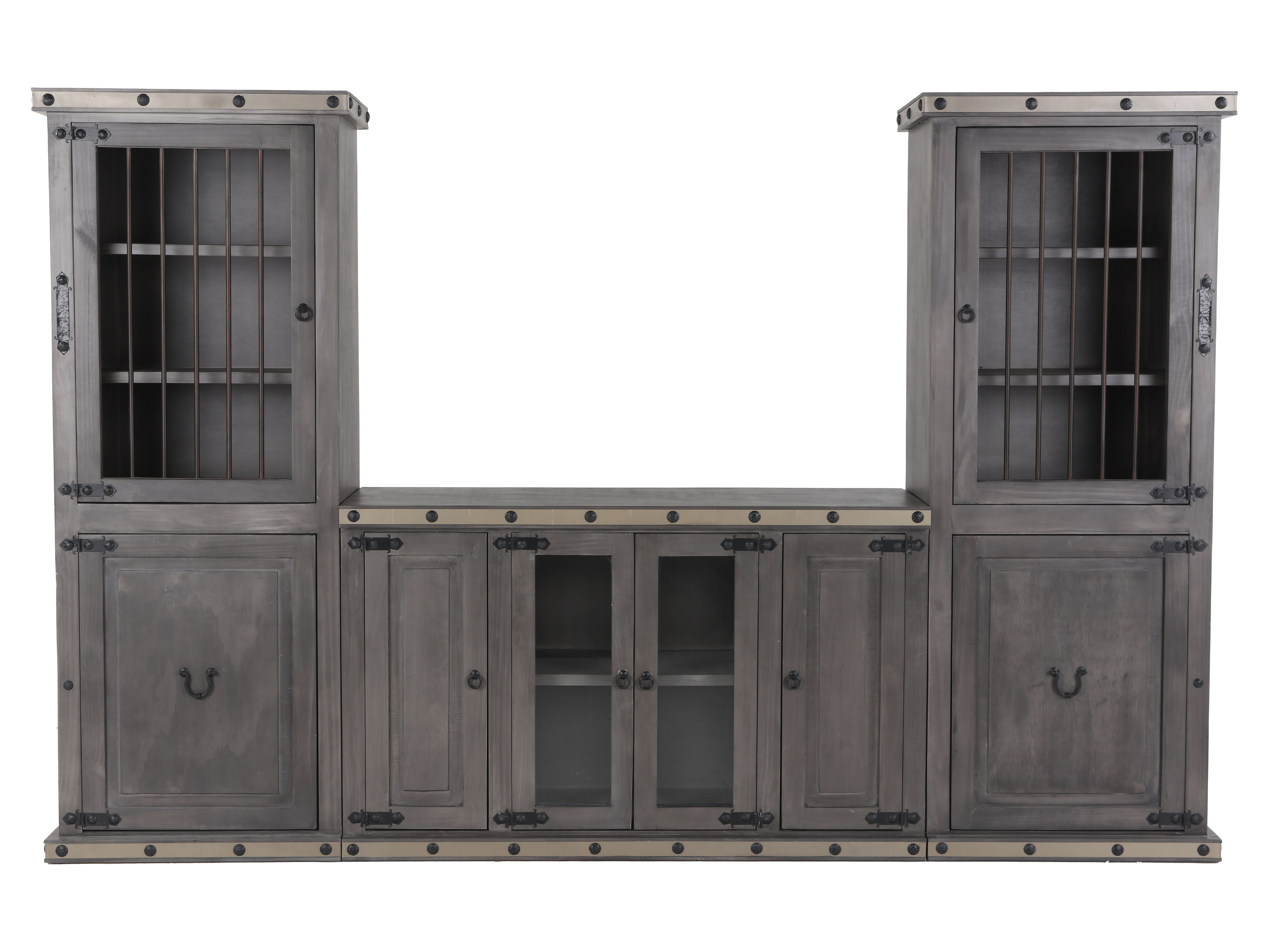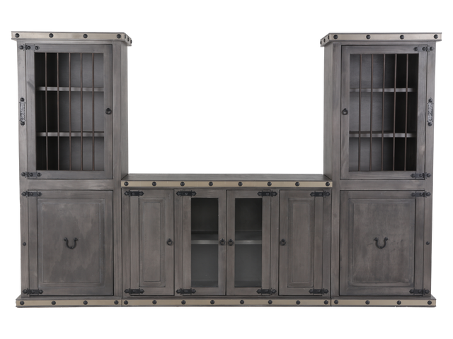 This industrial-style entertainment center offers a perfect blend of rugged charm and functional storage. Crafted with a solid wood frame and accented with metal details, it features a distressed gray finish for a bold, modern aesthetic. The unit consists of two tall side cabinets, each equipped with upper metal-barred doors that open to reveal three spacious shelves, ideal for displaying books, décor, or collectibles. Below, enclosed lower cabinets provide concealed storage for larger items. The central console includes two glass-paneled doors, offering easy access to electronic devices, while two flanking cabinets with solid doors provide additional storage. Rivet detailing and black iron hardware enhance the unit’s industrial character, making it a striking yet practical addition to any living space.