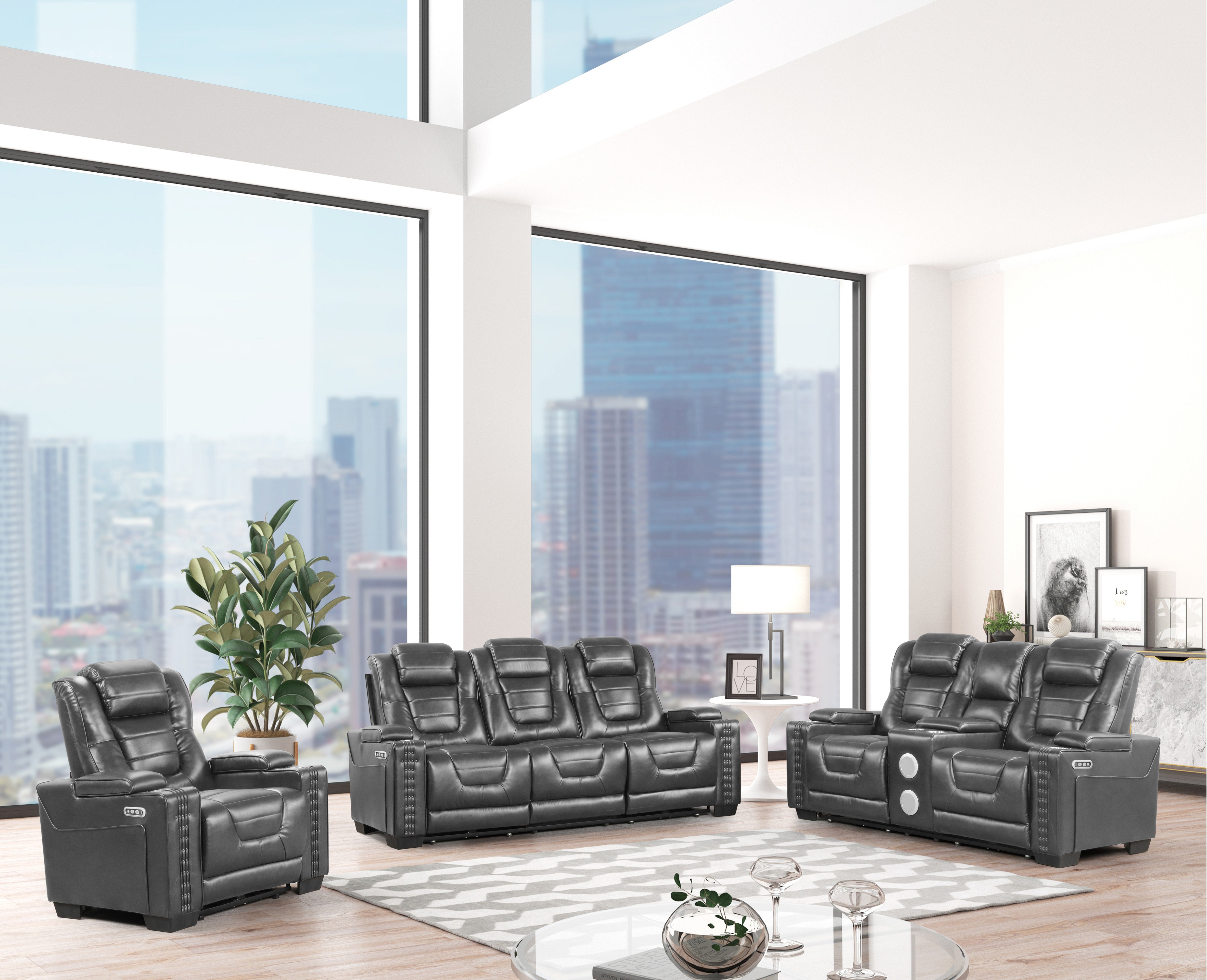 This 3 piece power reclining living room set is designed for ultimate comfort and convenience. Made with durable and stylish faux leather in a trendy grey color, it includes a power reclining sofa, a power reclining loveseat, and a power reclining chair. Enjoy relaxation at your fingertips with power button control, USB charging ports, and power-adjustable headrests. Plus, you'll have extra storage, cup holders, and even Bluetooth speakers to let you relax in style.