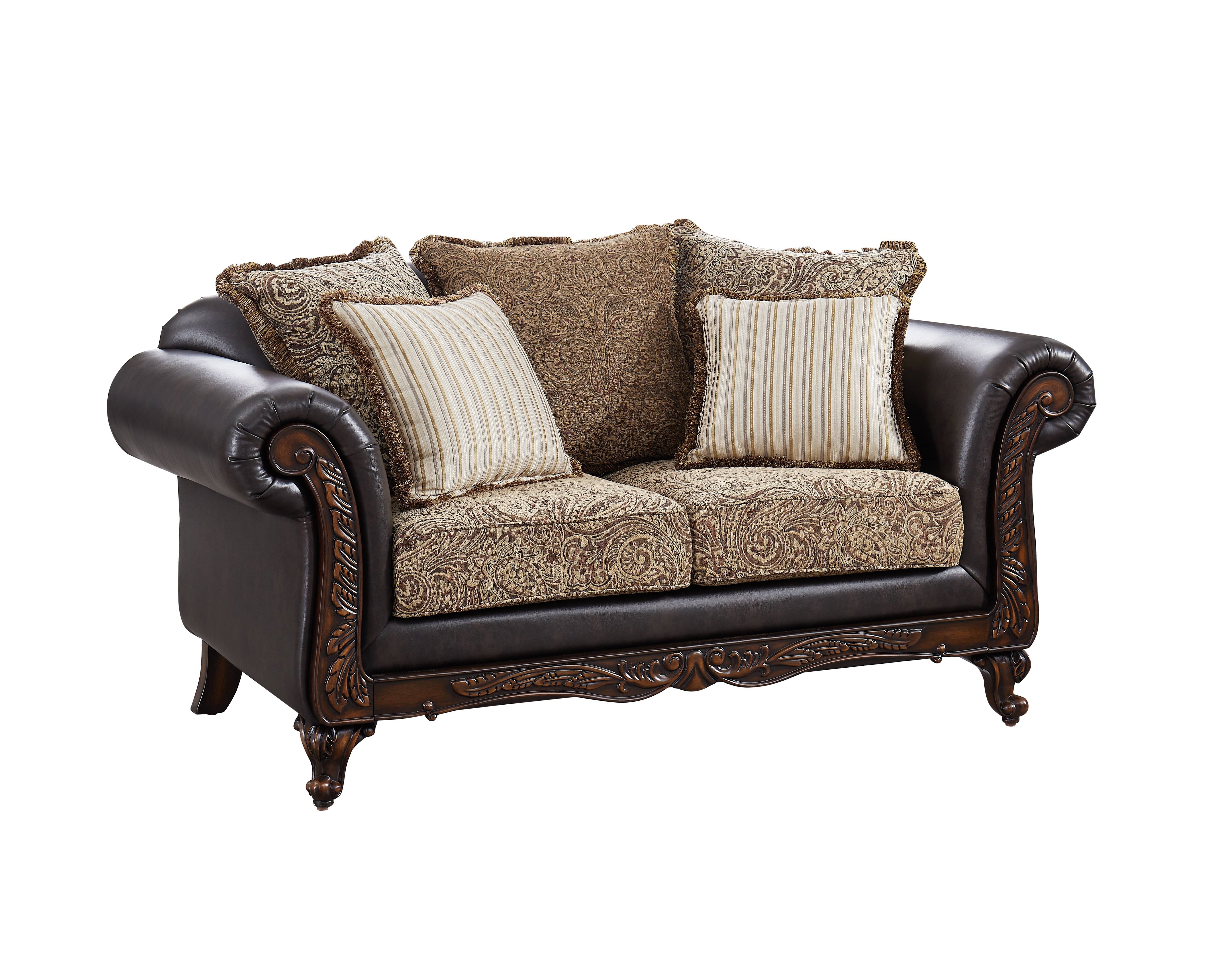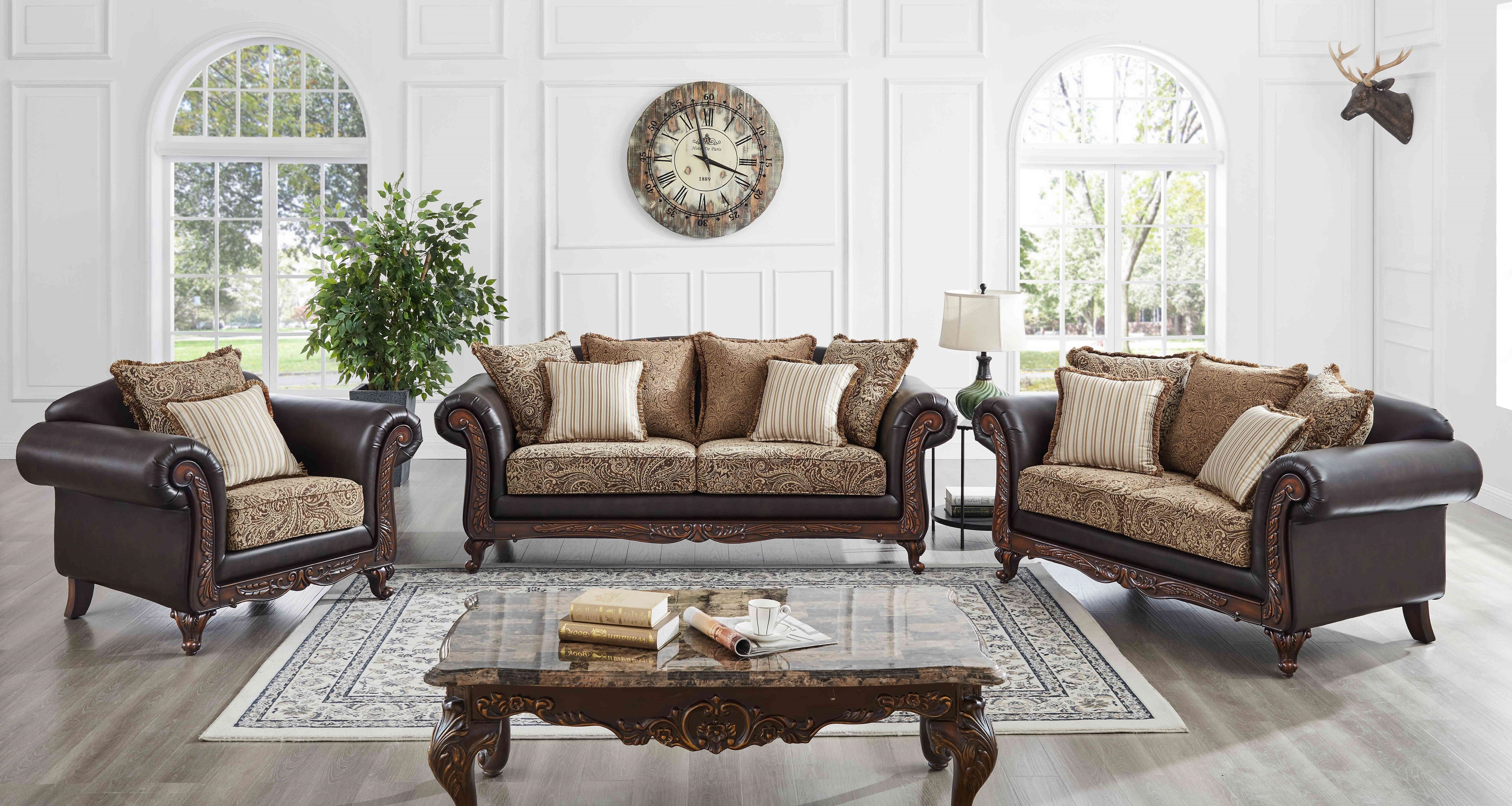 This 3-piece living room set exudes timeless traditional appeal, consisting of a sofa, loveseat, and chair. Each piece showcases dark brown faux leather upholstery, rolled arms, and detailed wooden trims, with plush backrests adorned in durable patterned fabric for added style and relaxation. The intricate woodwork adds sophistication, while the plush cushions provide ultimate comfort. Matching throw pillows complete the set for additional coziness.