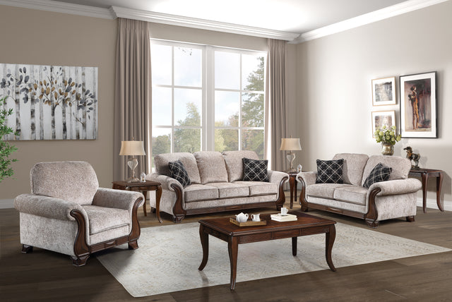 Elevate your living space with this exquisite 3-piece living room set, a perfect blend of timeless elegance and modern comfort. This set includes a sofa, loveseat, and armchair, all upholstered in a soft, textured fabric that beautifully complements warm, neutral tones. Designed with classic rolled arms featuring subtle wooden accents and supported by sturdy wooden legs, each piece offers a touch of sophistication and durability.