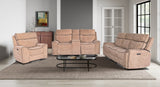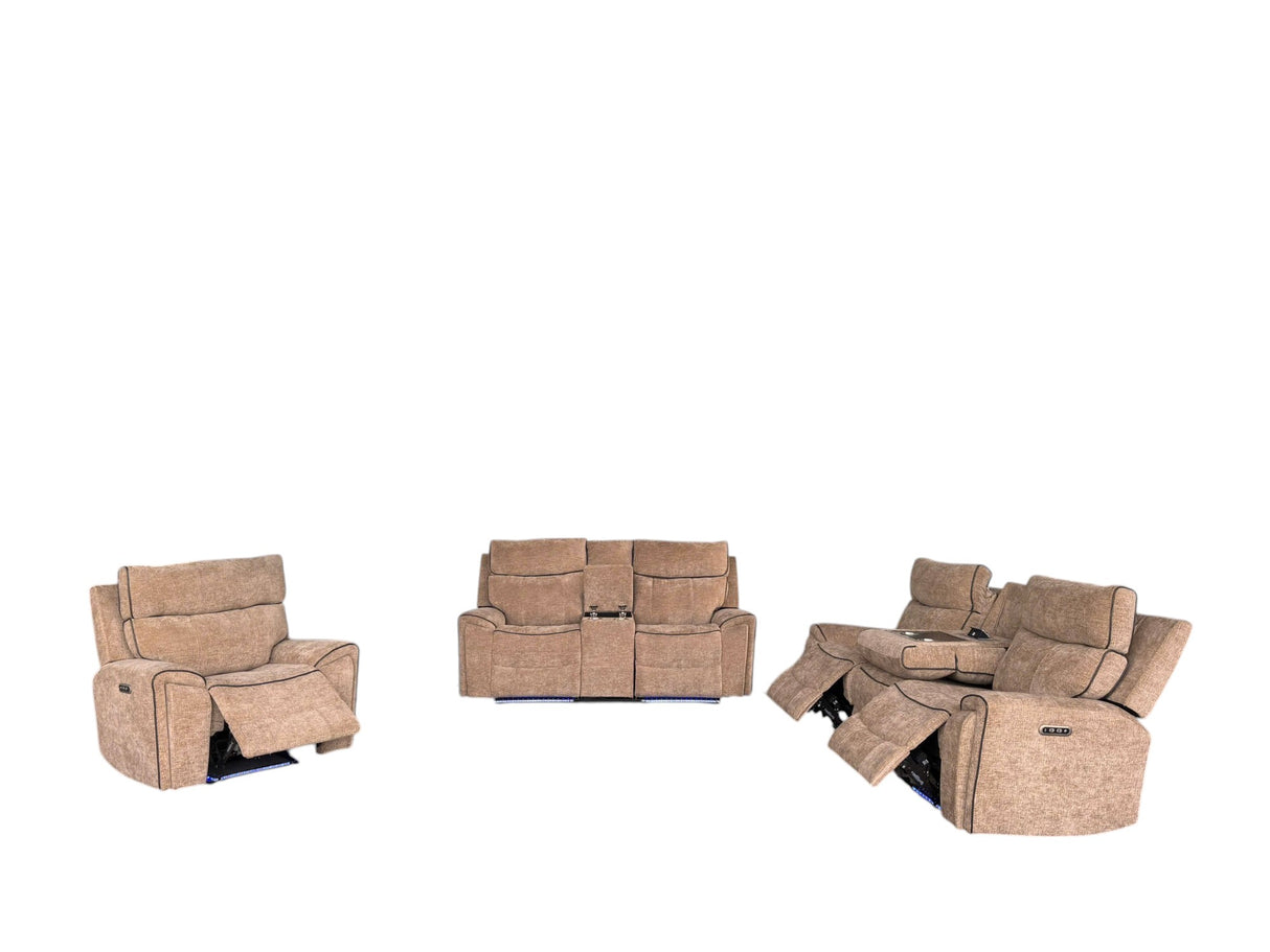 Bring luxury and convenience to your living space with this power reclining living room set, thoughtfully designed to combine style, comfort, and innovative features. With light brown upholstery and elegant stitching, this set combines contemporary aesthetics with cutting-edge features. This three-piece set includes a power reclining sofa, a stationary loveseat, and a power recliner armchair, each tailored to elevate your relaxation experience.