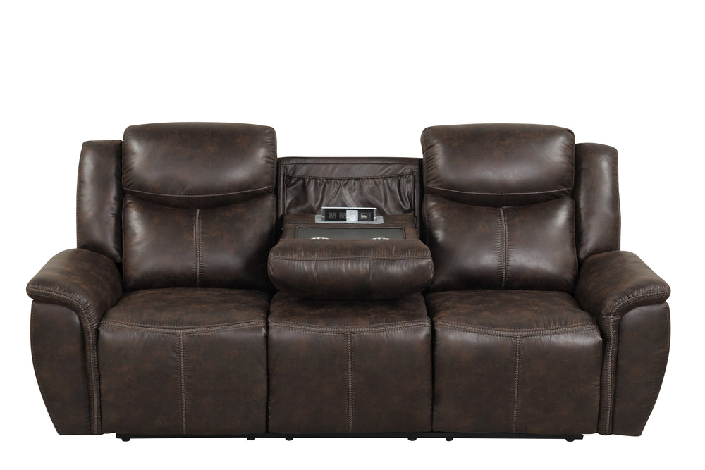 This 3 Piece Power Reclining Living Room Set is the perfect combination of style and comfort. Featuring an ultra-durable faux leather material in a luxurious dark brown color, this set comes with a power reclining sofa, a power reclining chair, and a non-reclining loveseat. The sofa also features a drop-down table with a pop-up power outlet, making it easy to charge your digital device. Plus, the loveseat comes with two cup holders, while the seat and back cushions provide extra comfort.
