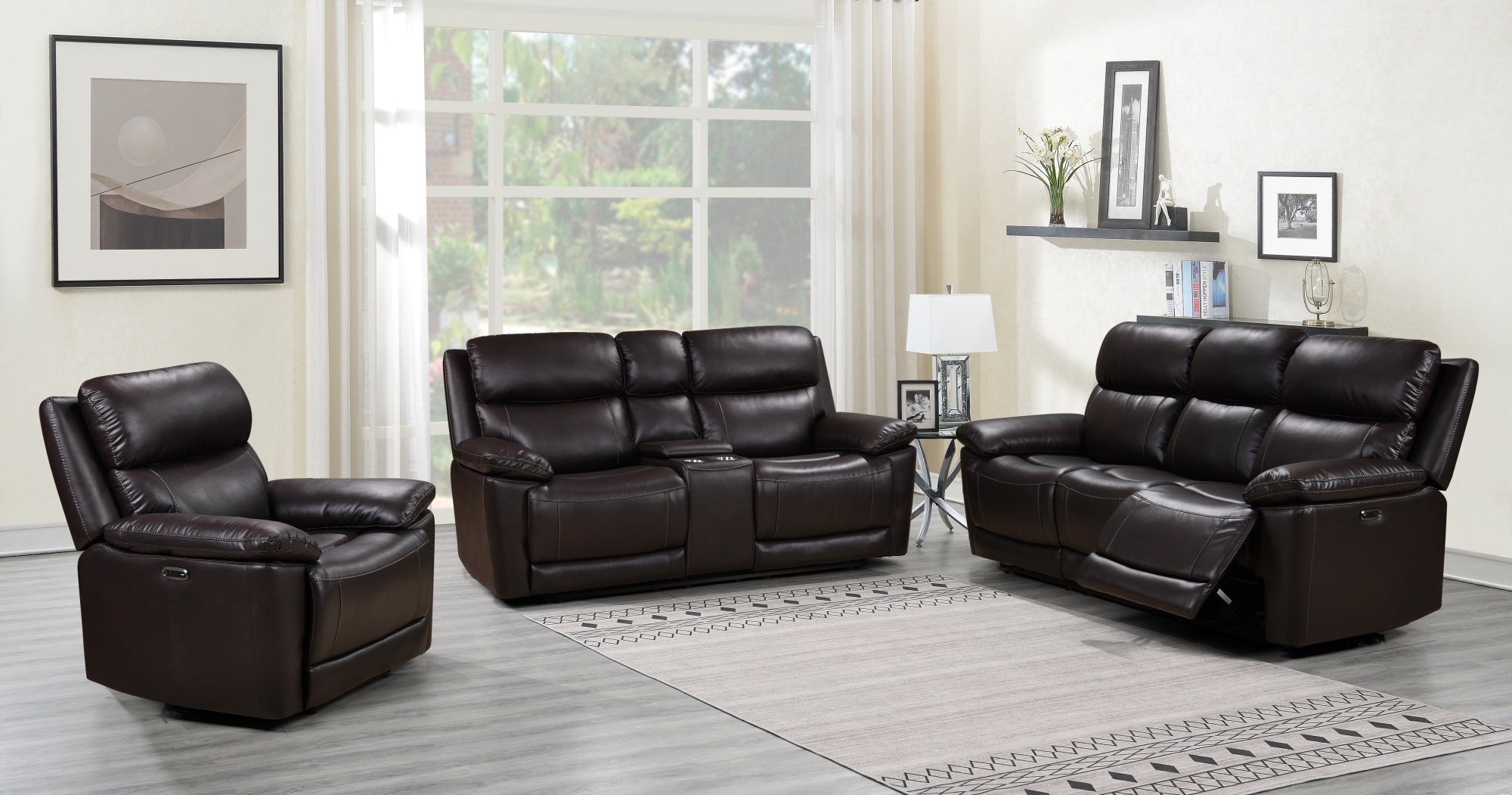Includes: Power reclining sofa, Power reclining chair, Stationary loveseat.