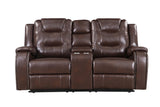 This 3-piece living room set comprises a power reclining sofa, a power reclining chair, and a stationary loveseat. It is made of high-quality faux leather that is soft to the touch and durable and will not peel off. The set comes in brown and features a USB charging port for convenient use. The chair and sofa have a touch button that allows them to recline easily. Each piece has a thick back cushion that is over-tufted to ensure maximum comfort while relaxing on the sofa set. The most noteworthy feature of this set is the hidden compartment where you can store cup holders. The sofa has a drop-down table with an electric pop-up outlet and two USB charging ports. The loveseat does not have a reclining function, but it does have storage and two cup holders.