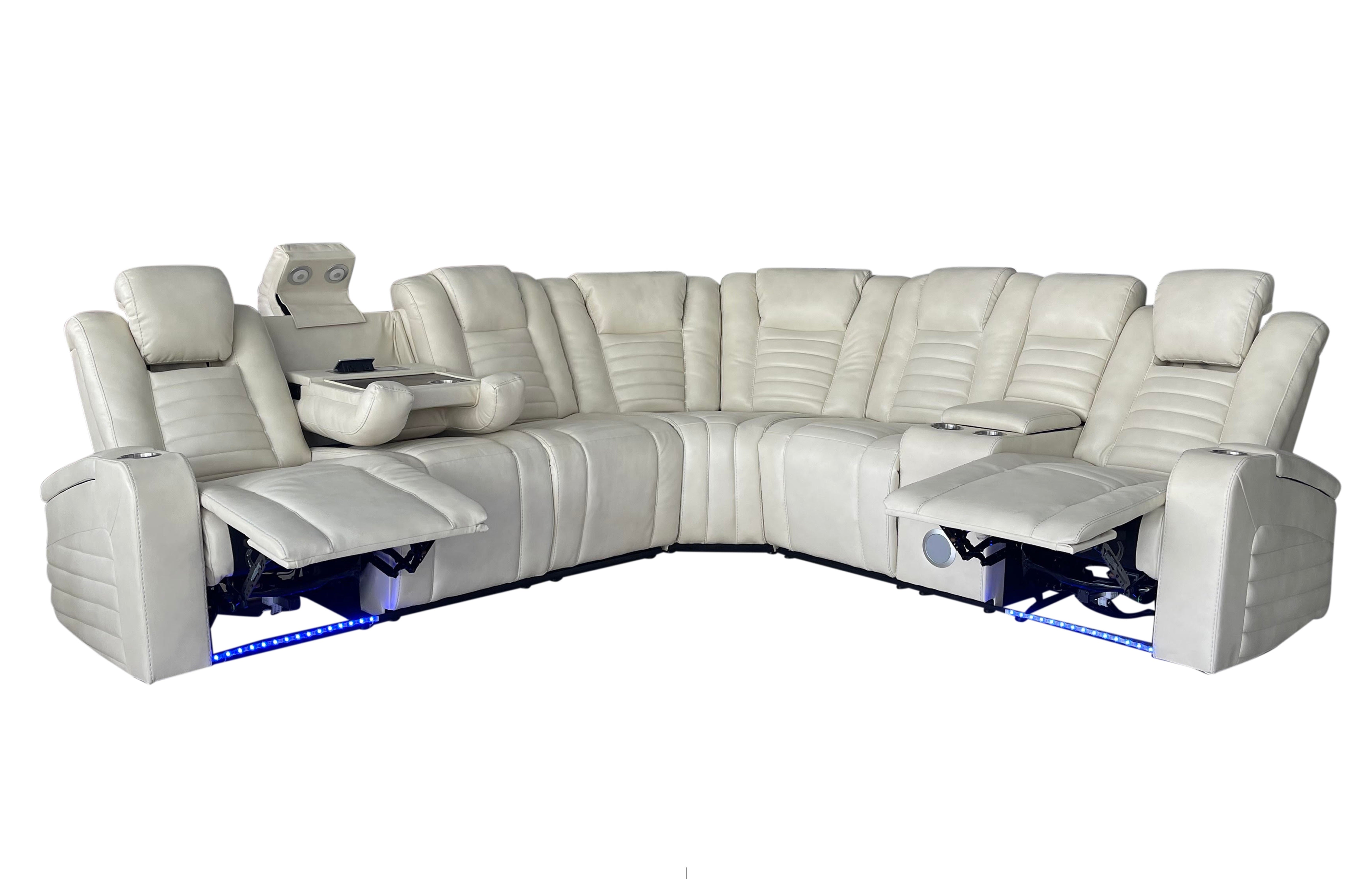 Enhance your relaxation space with this elegant 3-piece Power Reclining Sectional. Crafted from soft and durable air leather, this sectional boasts a luxurious cream color that adds a touch of sophistication to any room. On the left-arm-facing side, a convenient cup holder, power adjustable headrest with reading lights, and a drop-down table with electric outlet and wireless USB charging await you. The right arm-facing side features a console with Bluetooth speakers, power adjustable headrests, and storage. Plus, LED strip lights adds an exclusive touch to this premium sectional.