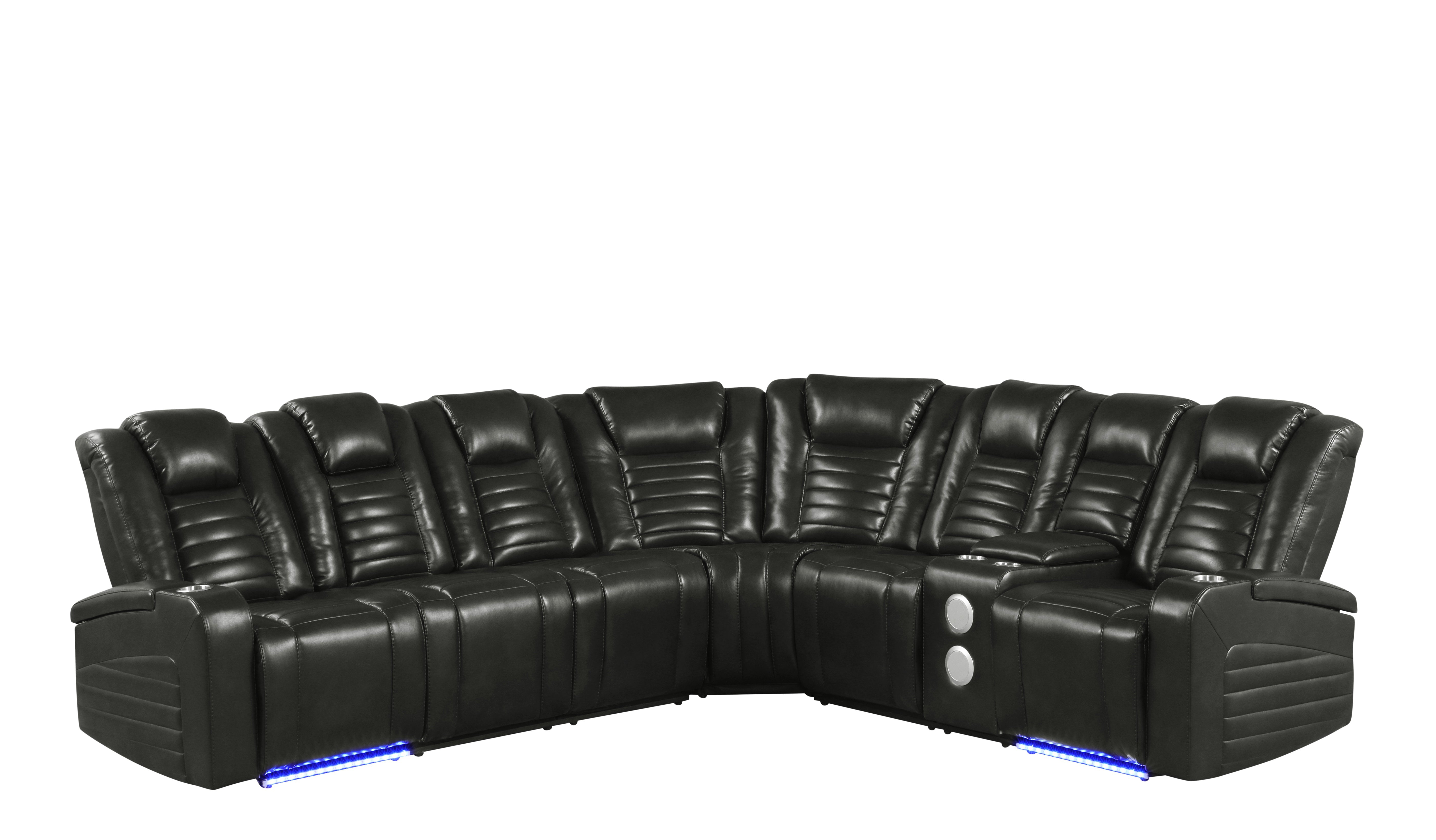 Elevate your living experience with our 3-piece Power Reclining Sectional. Made of luxurious air leather (faux leather) in Black color, it boasts a sectional design for ultimate relaxation. The power adjustable headrest, drop-down table with electric outlet and USB charging, and LED lighting add convenience and style. Plus, the storage console and Bluetooth speakers on the right arm-facing sectional enhance your entertainment.
