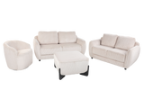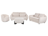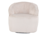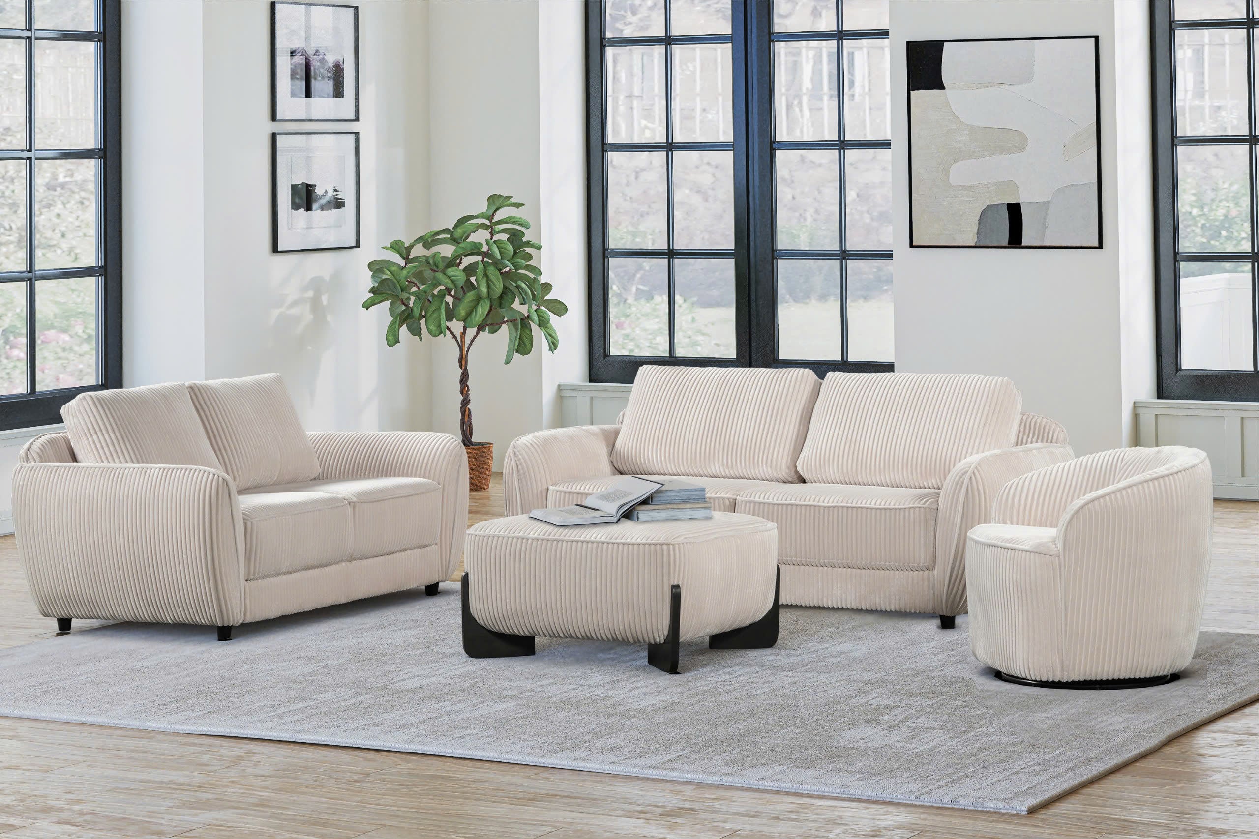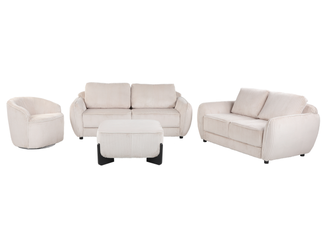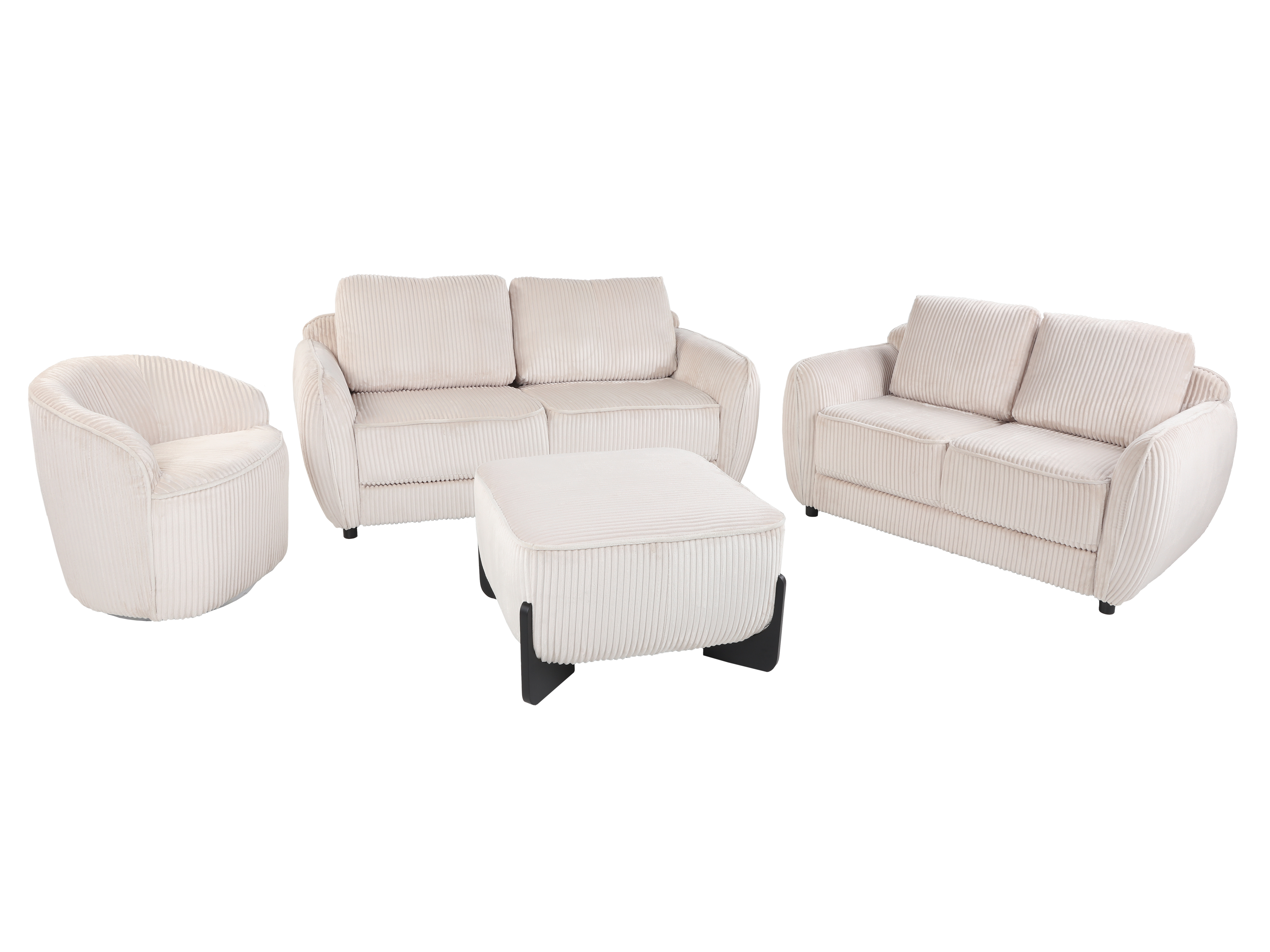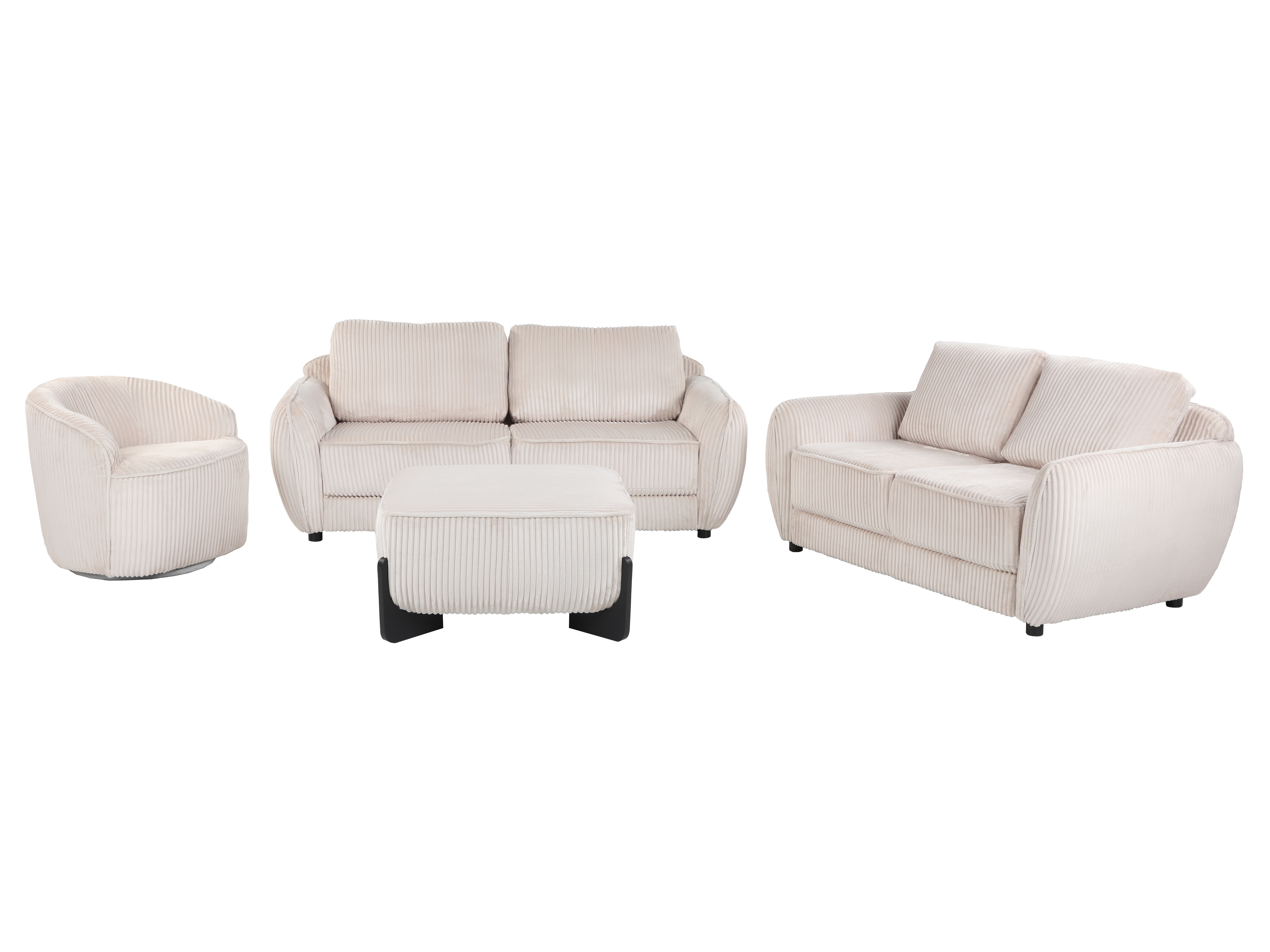 Create a cozy and stylish retreat in your home with this elegant living room set. Designed with comfort and modern aesthetics in mind, the set features a plush sofa, loveseat, swivel chair, and matching ottoman. Upholstered in soft, textured corduroy fabric in a beige hue, this set effortlessly blends comfort with contemporary charm. The spacious sofa and loveseat offer deep seating with generously padded cushions, perfect for relaxing or entertaining. The swivel chair adds a functional and fun element, allowing you to rotate smoothly while enjoying your surroundings. The versatile ottoman doubles as extra seating or a place to rest your feet, with sturdy wood legs providing reliable support.