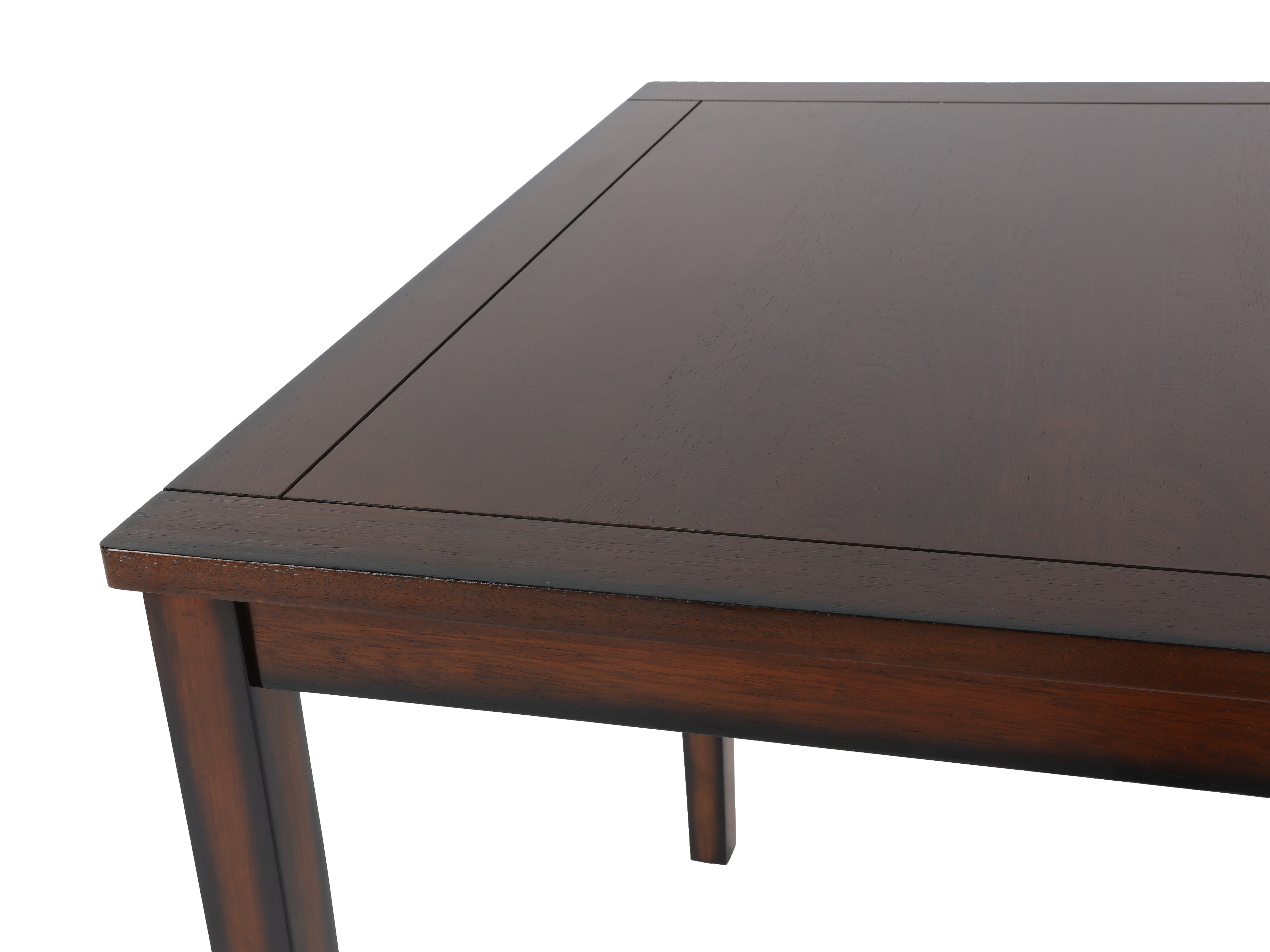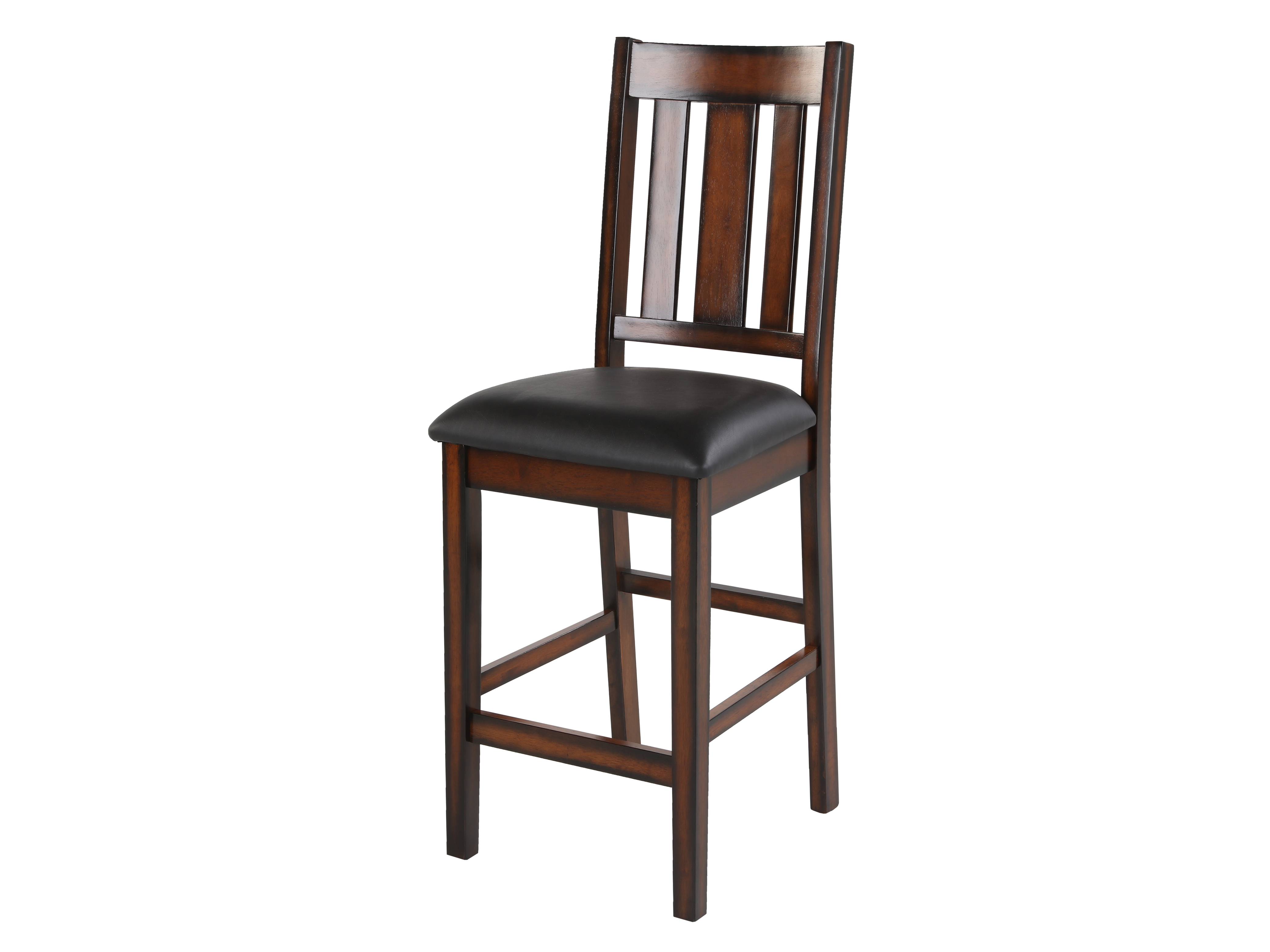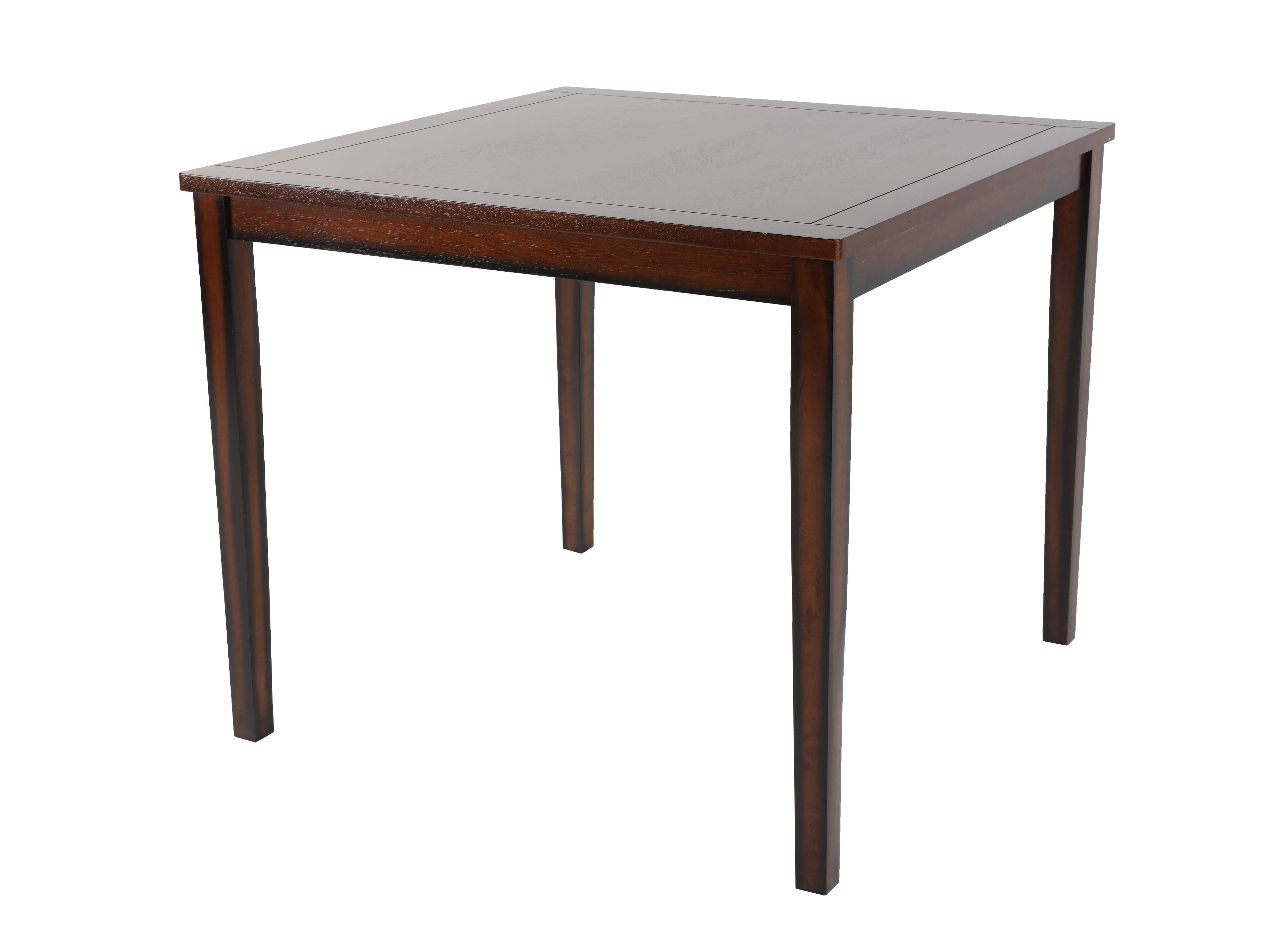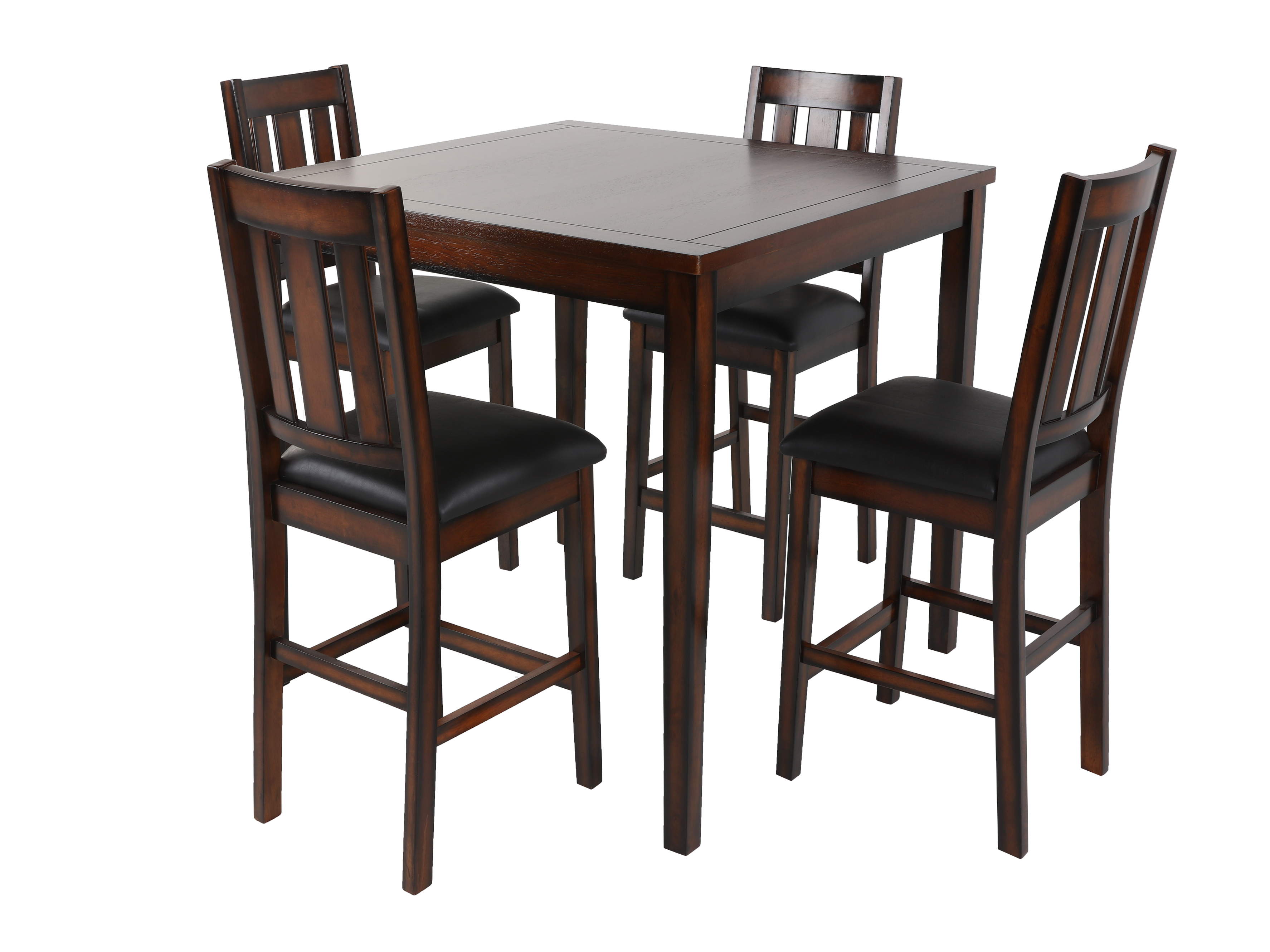 This 5-piece counter height dining room set features a classic yet modern design, combining a warm, wood finish with sleek black cushioned seats for optimal comfort. The set includes a square table and four high-back chairs, all crafted from manufactured wood with a rich walnut stain. The chairs have vertical slats and upholstered seats, blending a timeless aesthetic with everyday practicality. Ideal for intimate family dinners or casual gatherings, the set offers both style and functionality, fitting seamlessly into various home décors. The neutral tones and clean lines create a welcoming and elegant dining atmosphere.
