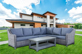 Elevate your outdoor space with this stylish and durable sectional set, designed for comfort and contemporary elegance. Featuring a spacious L-shaped wicker sectional with plush, weather-resistant cushions in a sophisticated gray hue, this set is perfect for relaxing and entertaining. Built with a sturdy steel frame, it ensures long-lasting durability, while the matching coffee table provides a convenient surface for drinks, snacks, or décor.