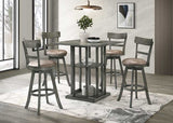 Elevate your dining experience with this sophisticated pub dining set. This set features a sleek, modern design with a sturdy square table and four matching swivel stools. The table boasts a unique open-shelf base, perfect for storing dining essentials or displaying decorative items. Each stool is crafted with a comfortable cushioned seat and a supportive backrest, ensuring a pleasant seating experience. The swivel mechanism adds an extra layer of convenience and flexibility, allowing you to rotate easily. The set is finished in a chic gray tone, blending seamlessly with contemporary or industrial decor. Ideal for casual meals or entertaining guests, this dining set combines functionality with style, making it a perfect addition to any home.