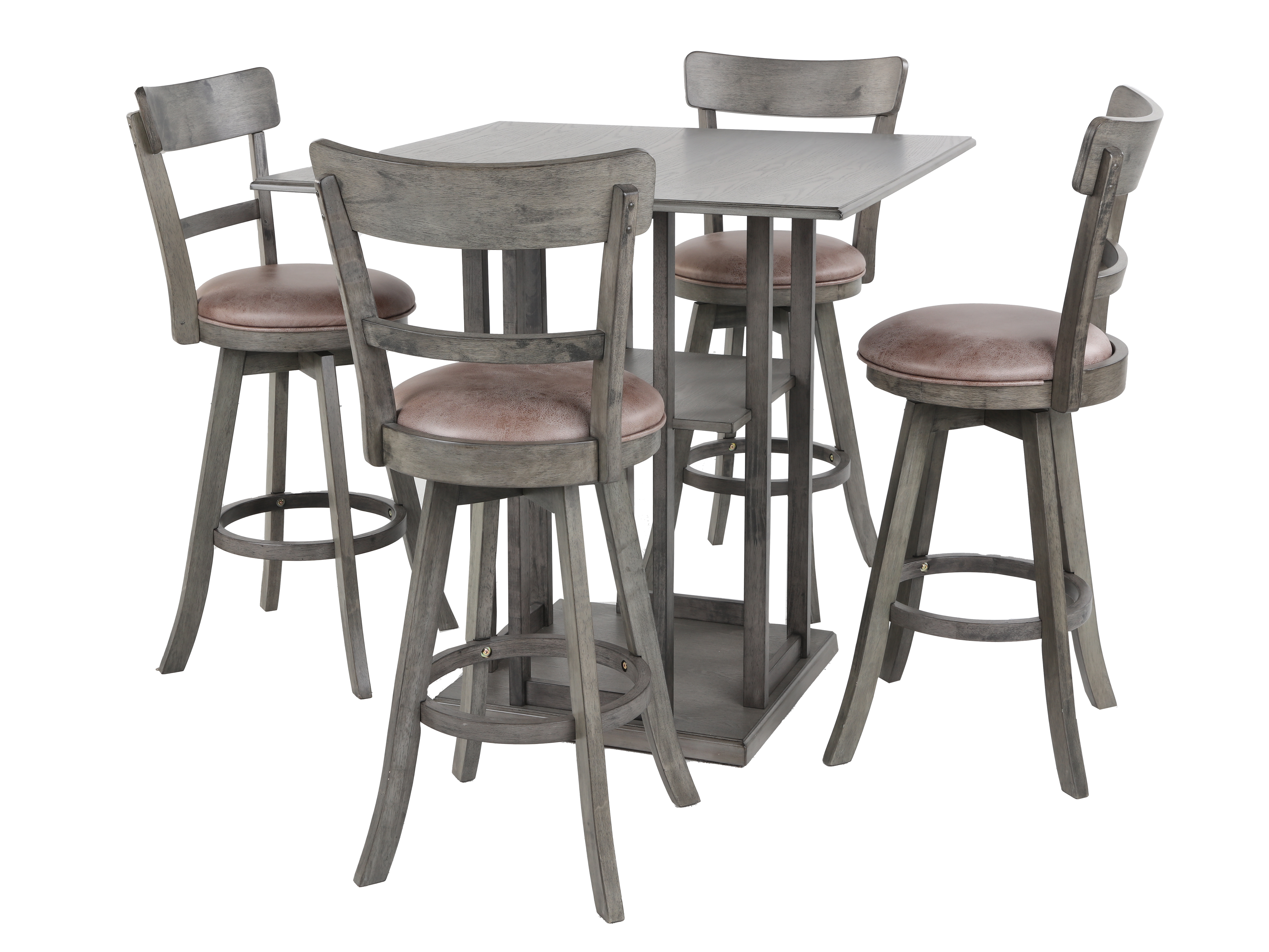Elevate your dining experience with this sophisticated pub dining set. This set features a sleek, modern design with a sturdy square table and four matching swivel stools. The table boasts a unique open-shelf base, perfect for storing dining essentials or displaying decorative items. Each stool is crafted with a comfortable cushioned seat and a supportive backrest, ensuring a pleasant seating experience. The swivel mechanism adds an extra layer of convenience and flexibility, allowing you to rotate easily. The set is finished in a chic gray tone, blending seamlessly with contemporary or industrial decor. Ideal for casual meals or entertaining guests, this dining set combines functionality with style, making it a perfect addition to any home.