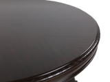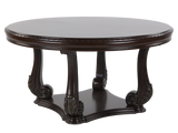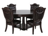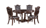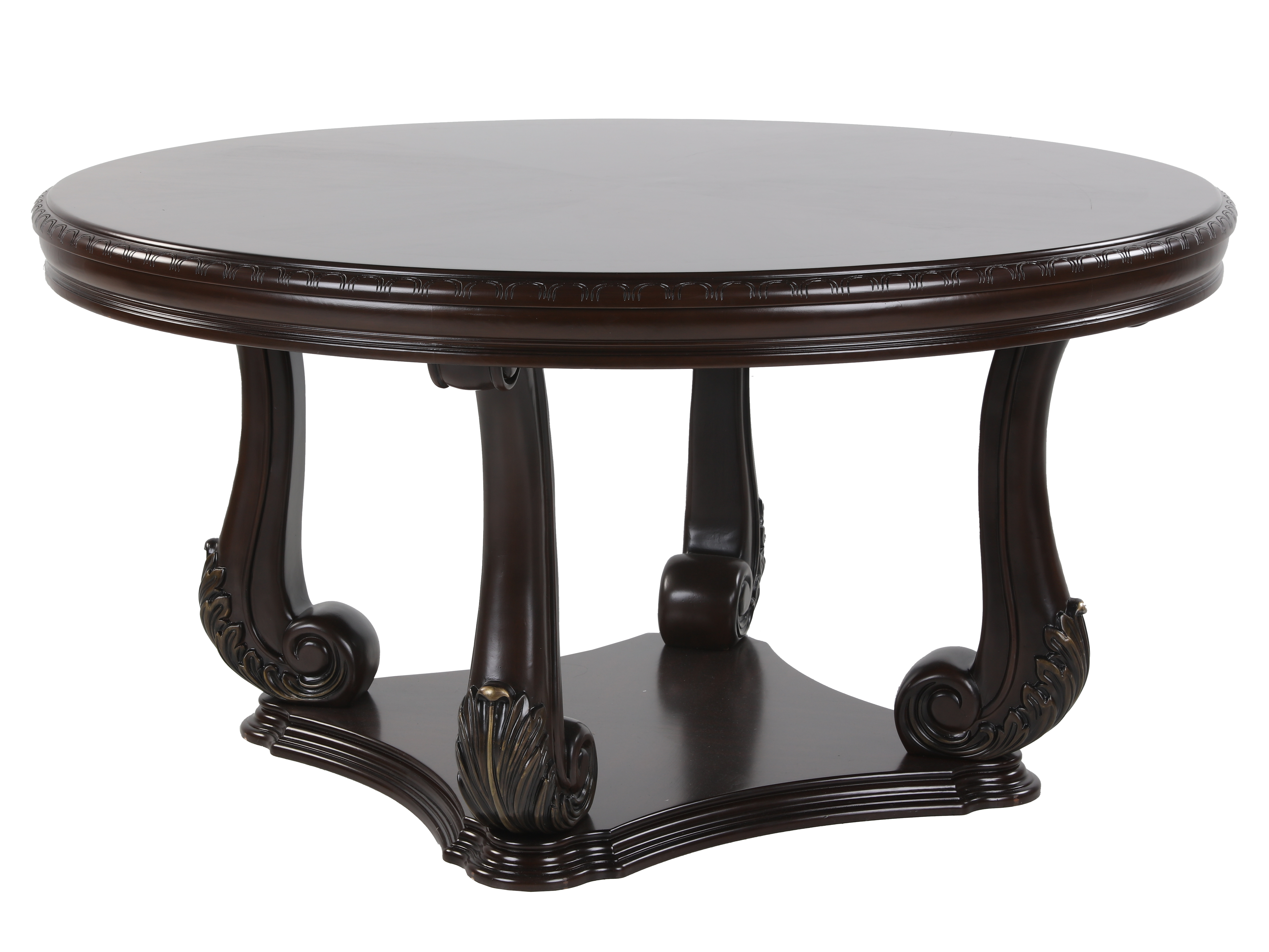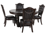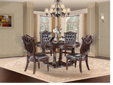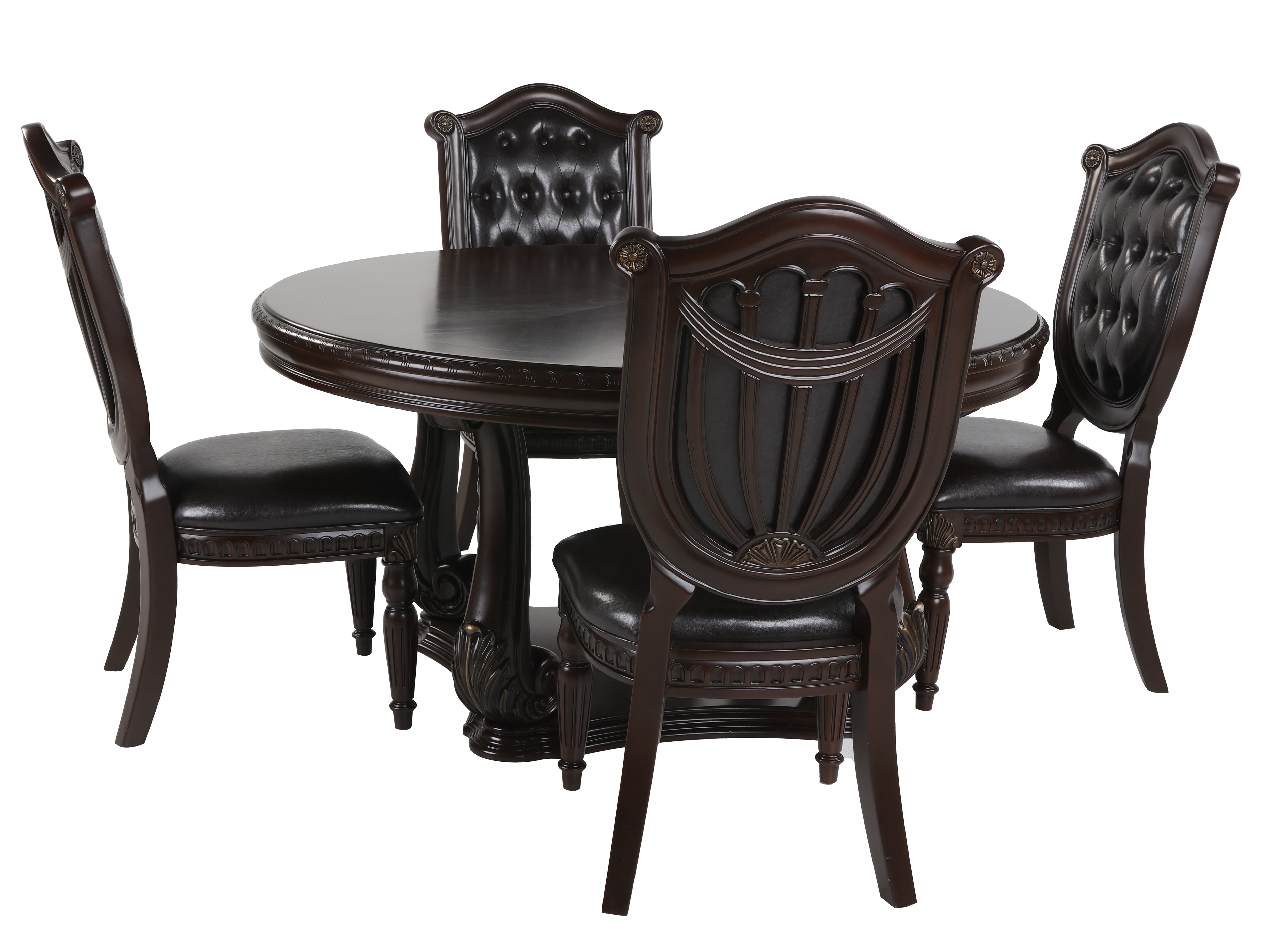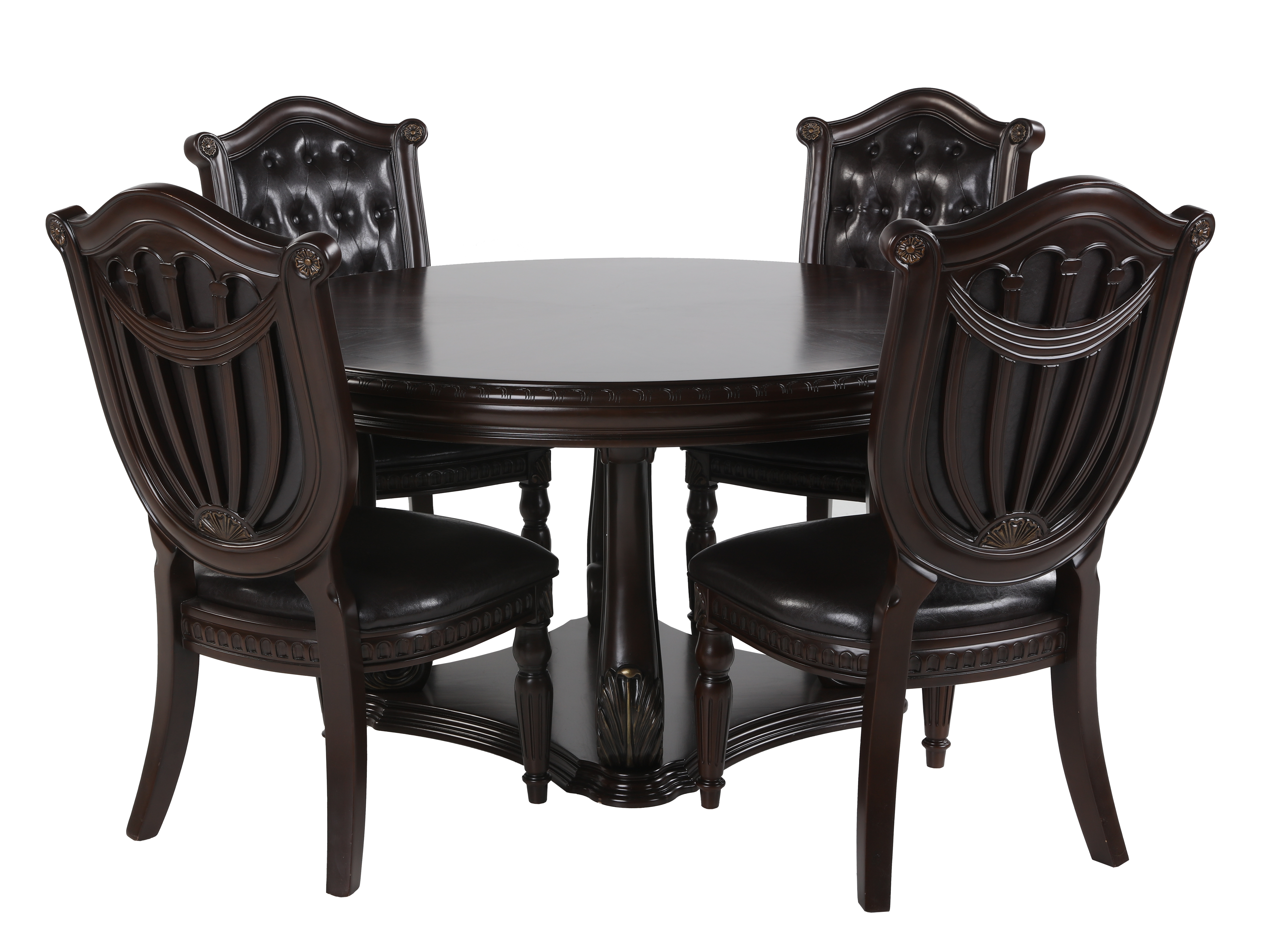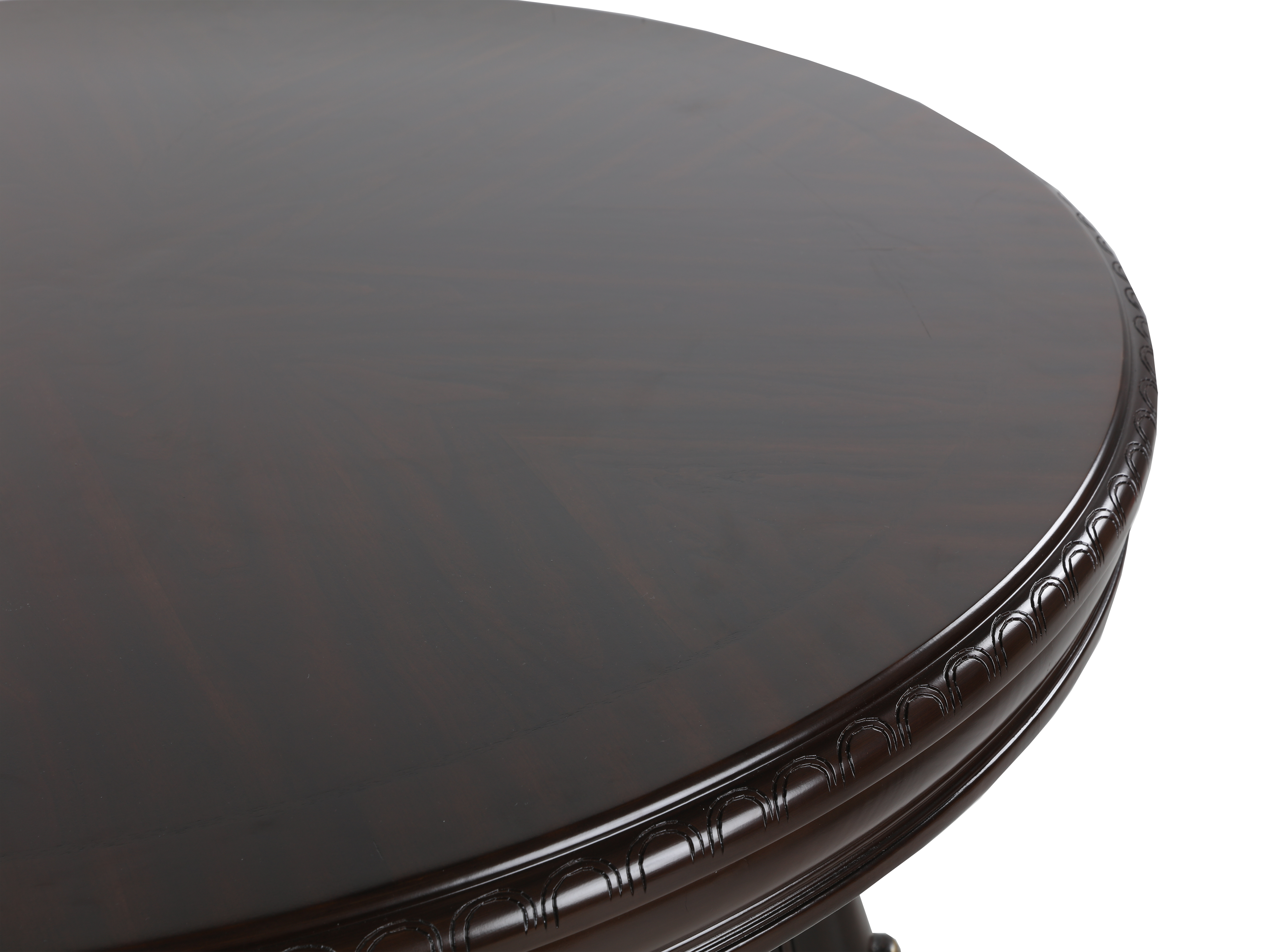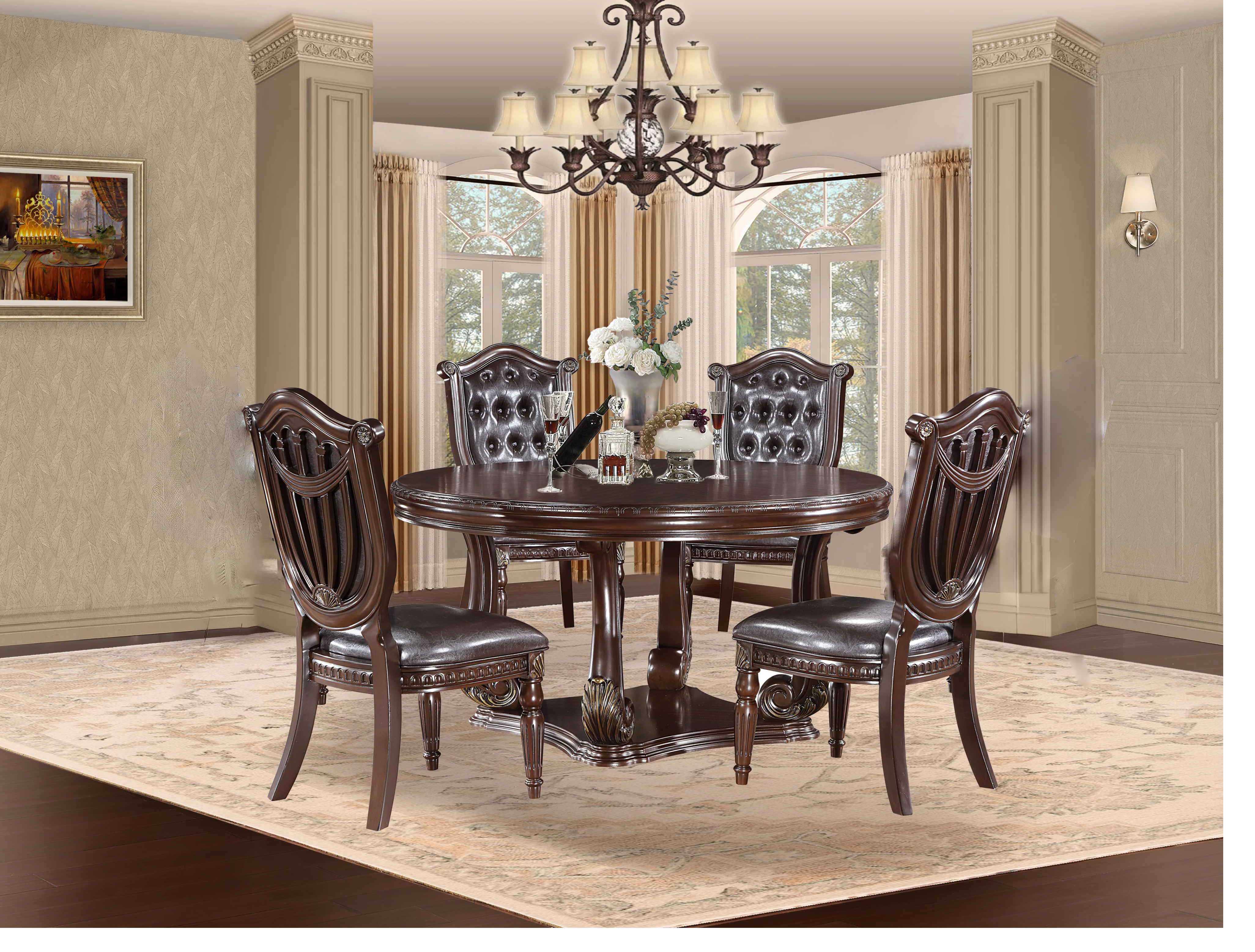 Bring rich traditional style to a smaller dining space with this 5-piece dark cherry round dining set. The round table features a smooth, thick top with decorative edge molding and a sculpted pedestal base accented with scrollwork and shell carvings. Its compact footprint is perfect for breakfast nooks, eat-in kitchens, or cozy formal dining rooms while still feeling grand and substantial.
