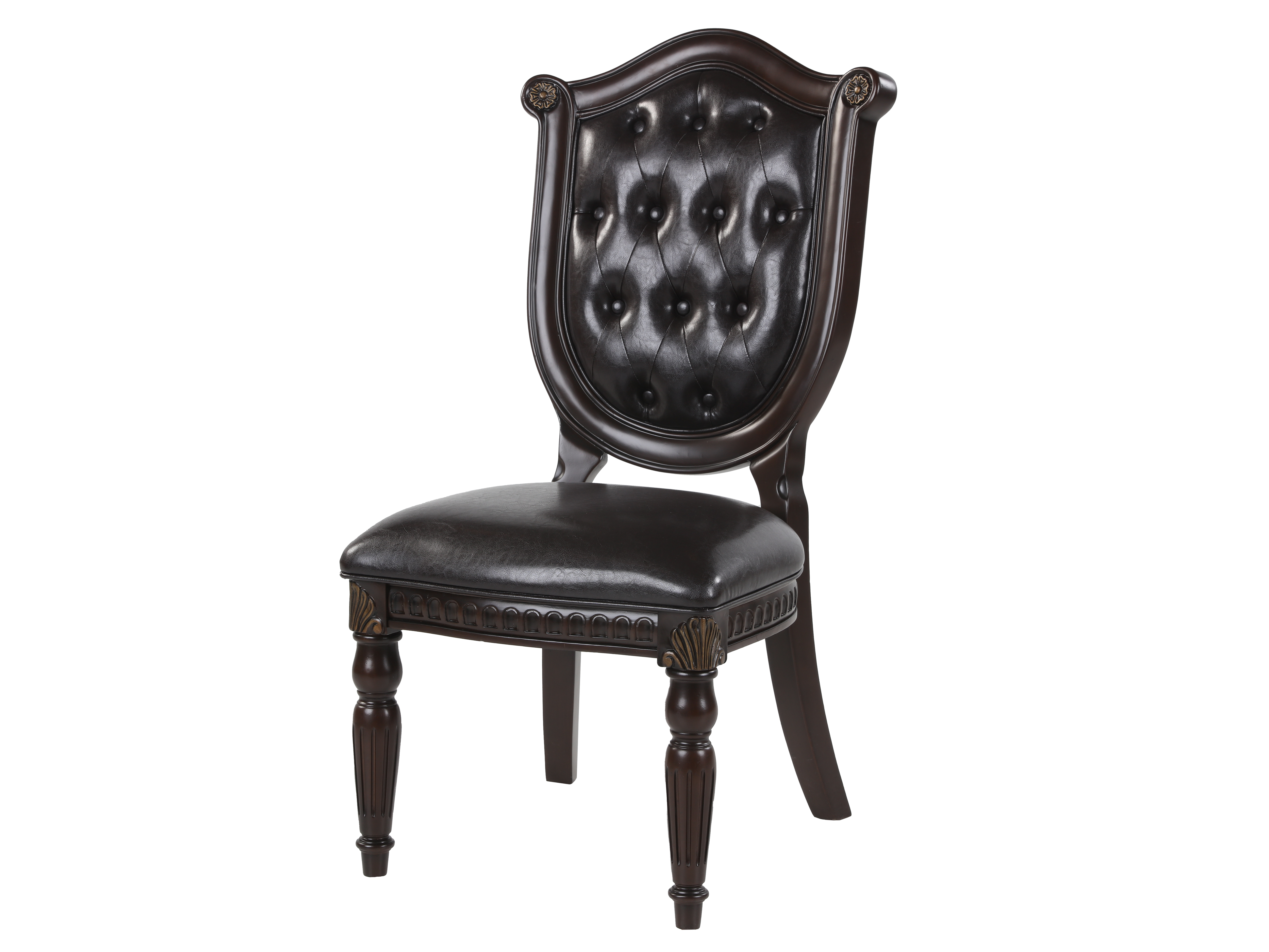 Four matching side chairs echo the same classic European look, with shield-shaped backs, deep button-tufted faux-leather upholstery, and turned front legs. The cushioned seats provide lasting comfort for long meals and conversation, and the easy-care PU upholstery wipes clean in seconds.