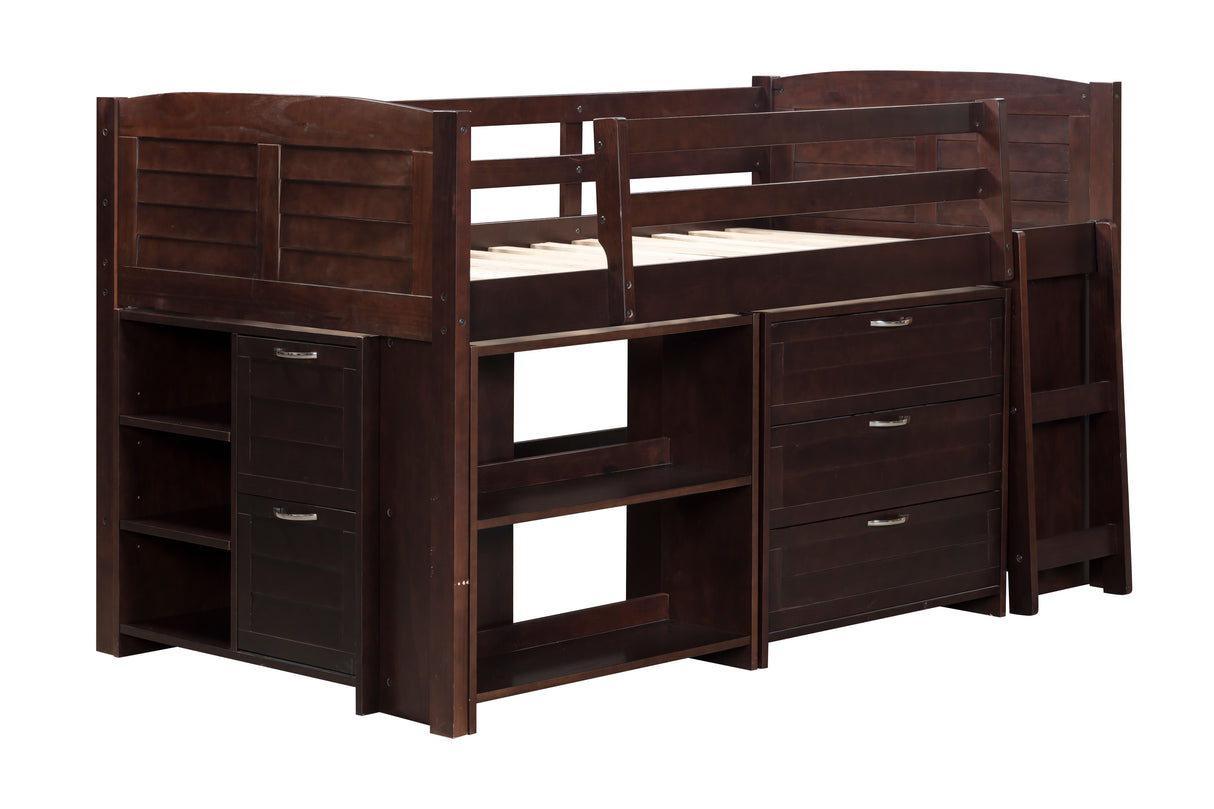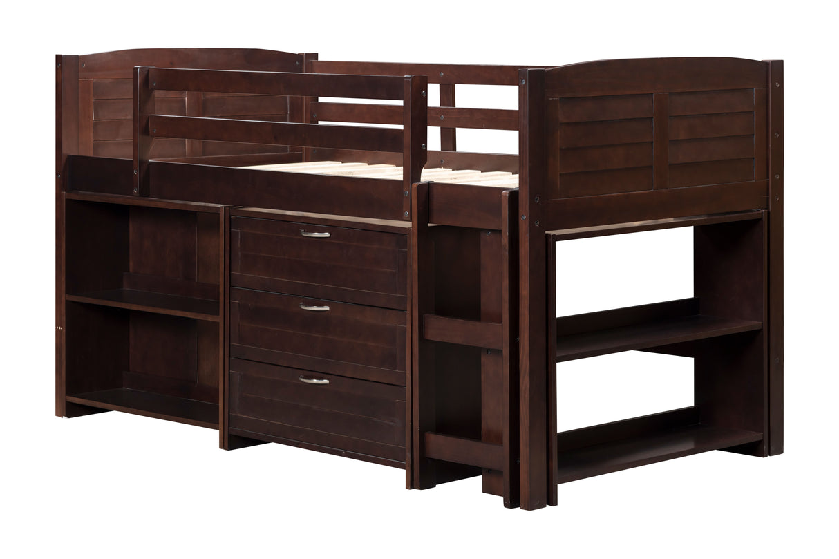 Includes: Low Loft Bed Louver, 3-drawer Chest, 2-drawer Chest with Shelves, Headboard Bookcase, Small Bookcase.