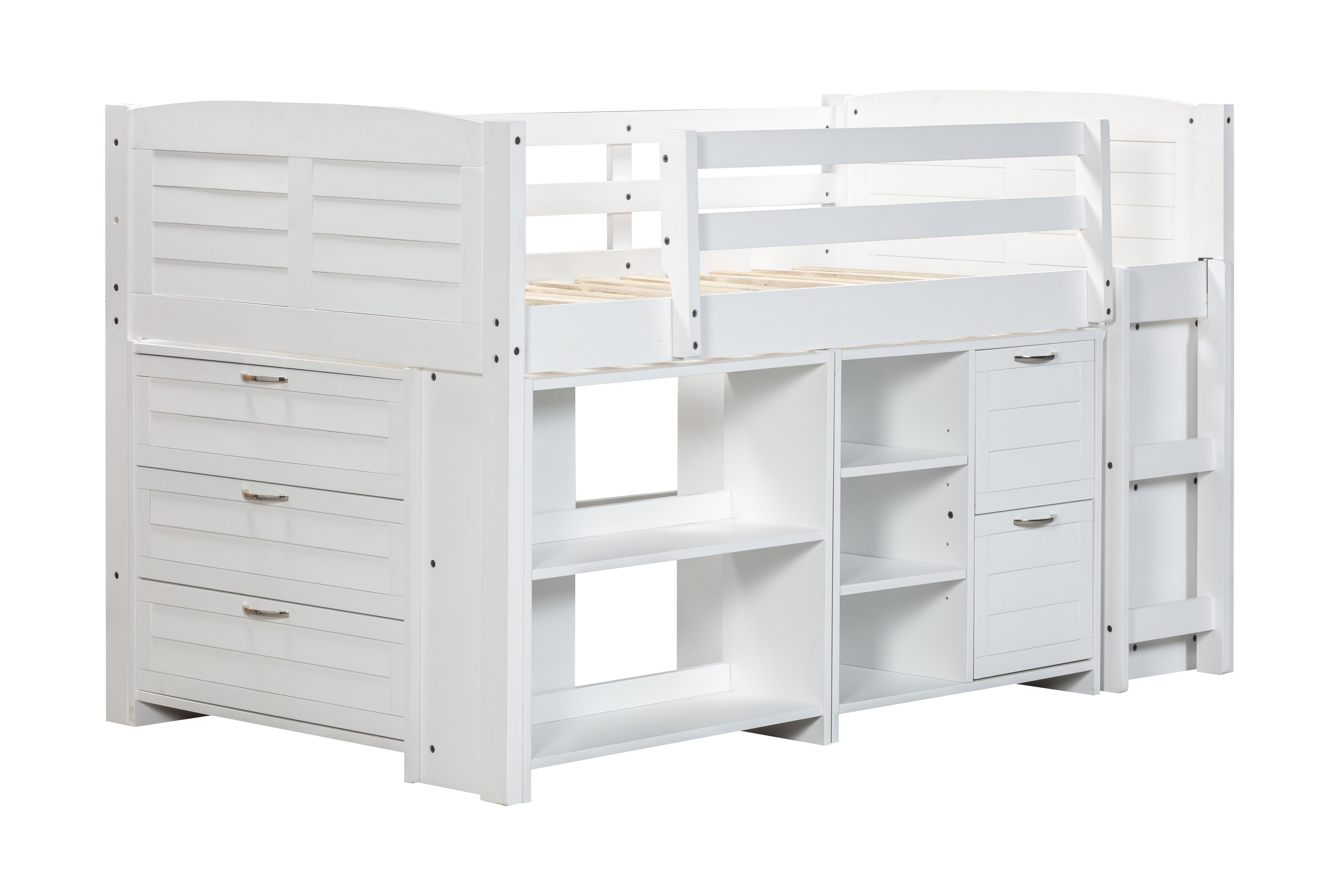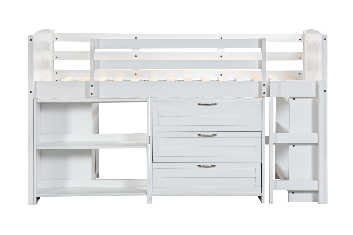 This Twin-size Loft Bed is a great addition to your child's room, as it not only brings imaginative play and fun, but also features solid pine wood construction and steel hardware connections that provide excellent strength, stability, and durability. The bed features a ladder for easy access, shelves and storage for organization, and a slat set for mattress stability. The bed comes with a beautiful White finish, adding elegance to any room. It also includes a three-drawer chest, a 2-drawer chest, a small bookcase, a ladder, guardrails, and slat mattress supports.