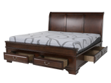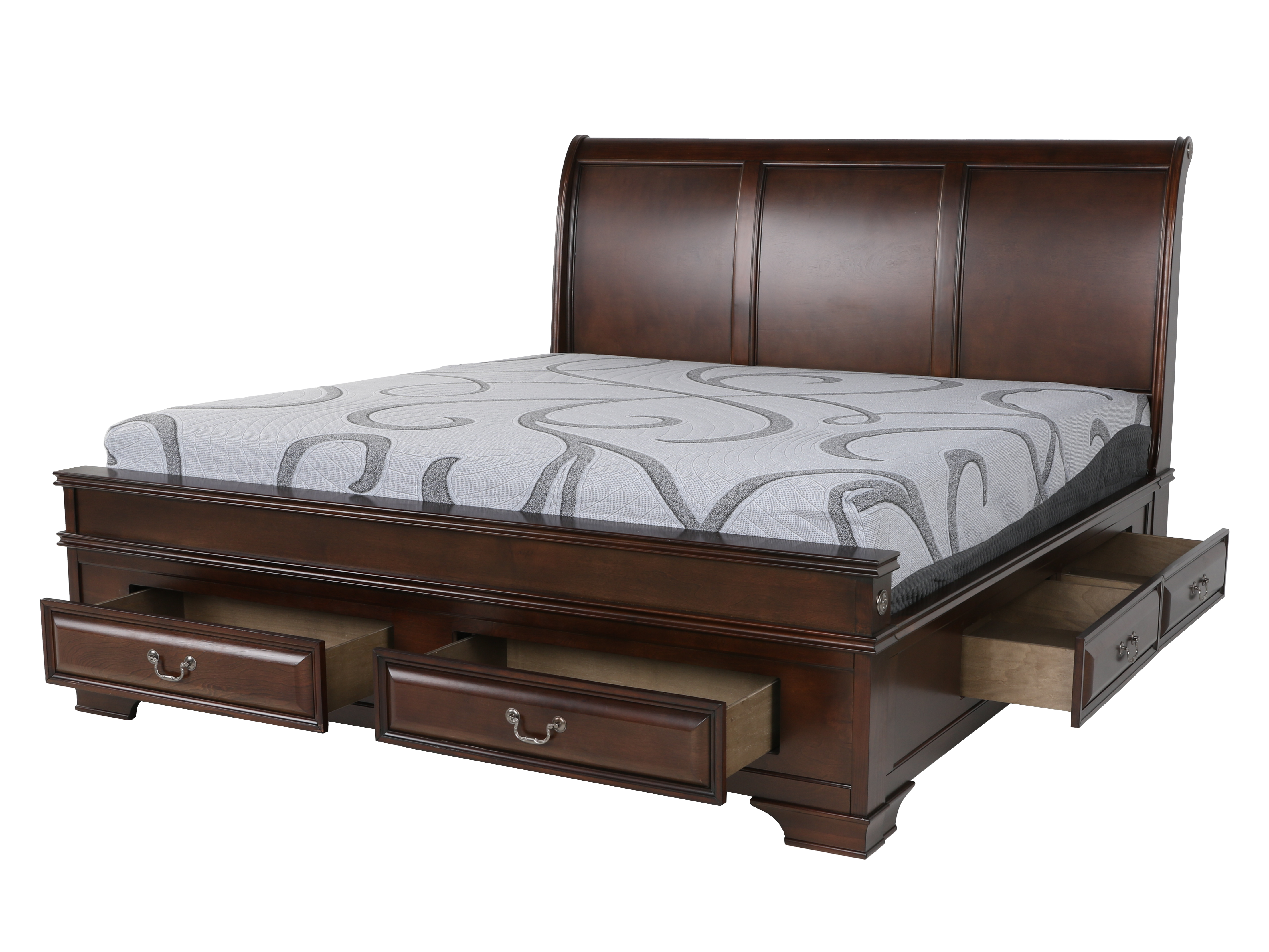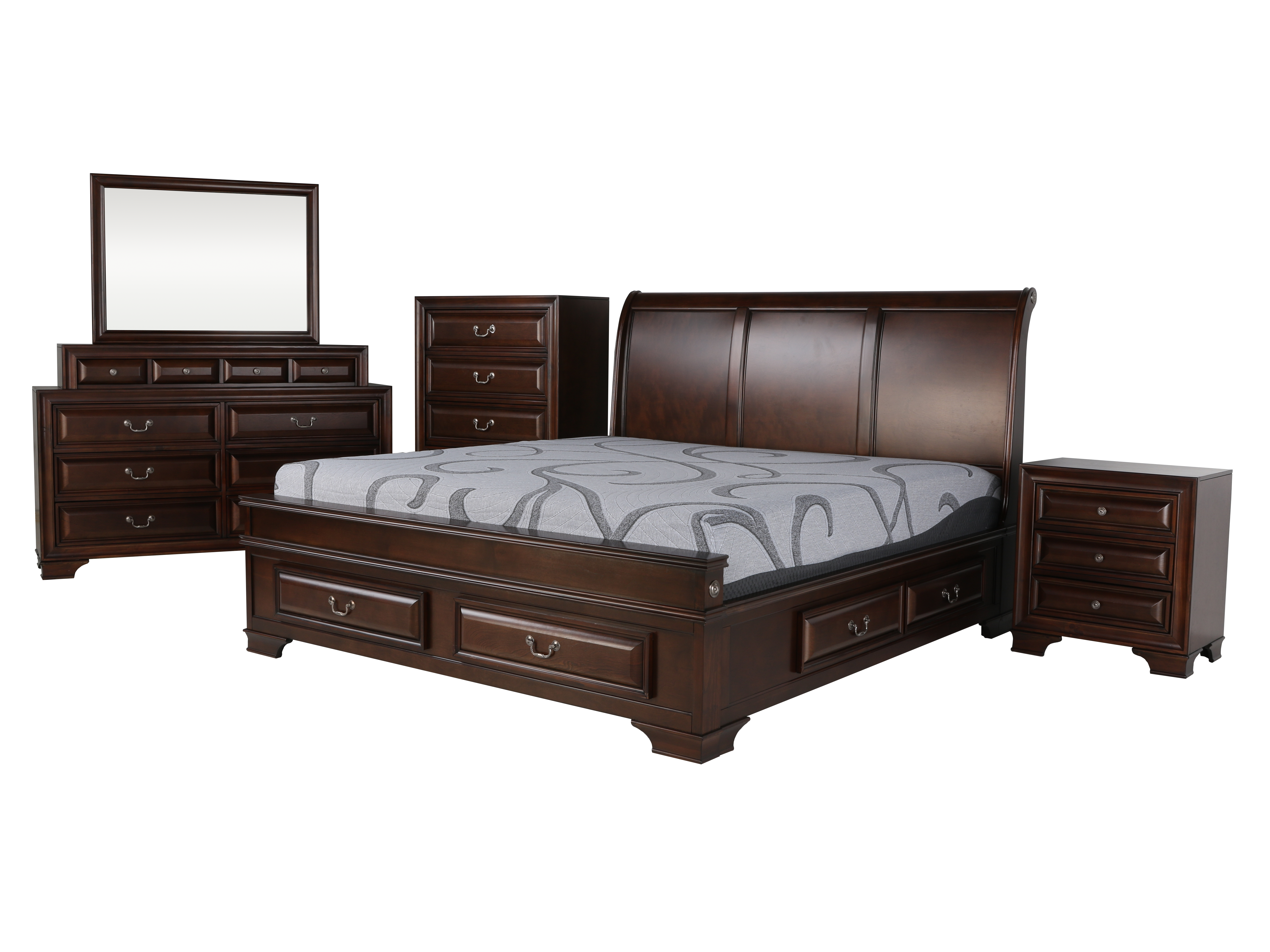 With its blend of elegant design and ample storage, achieving a restful night’s sleep has never been easier. Crafted from pine solids and birch veneers, this stylish bedroom set is finished in cherry, exuding a sophisticated and timeless appeal. The sleigh bed, a focal point of the collection, boasts six storage drawers adorned with antique silver finished hardware that complements the entire ensemble. Offering a serene ambiance infused with warmth and character, this remarkable collection is replete with practical features, including a storage footboard and drawers equipped with full extension drawer glides, providing versatile storage options. The bed set comprises a headboard, footboard, rails, and slats, along with a dresser, mirror, and nightstand.