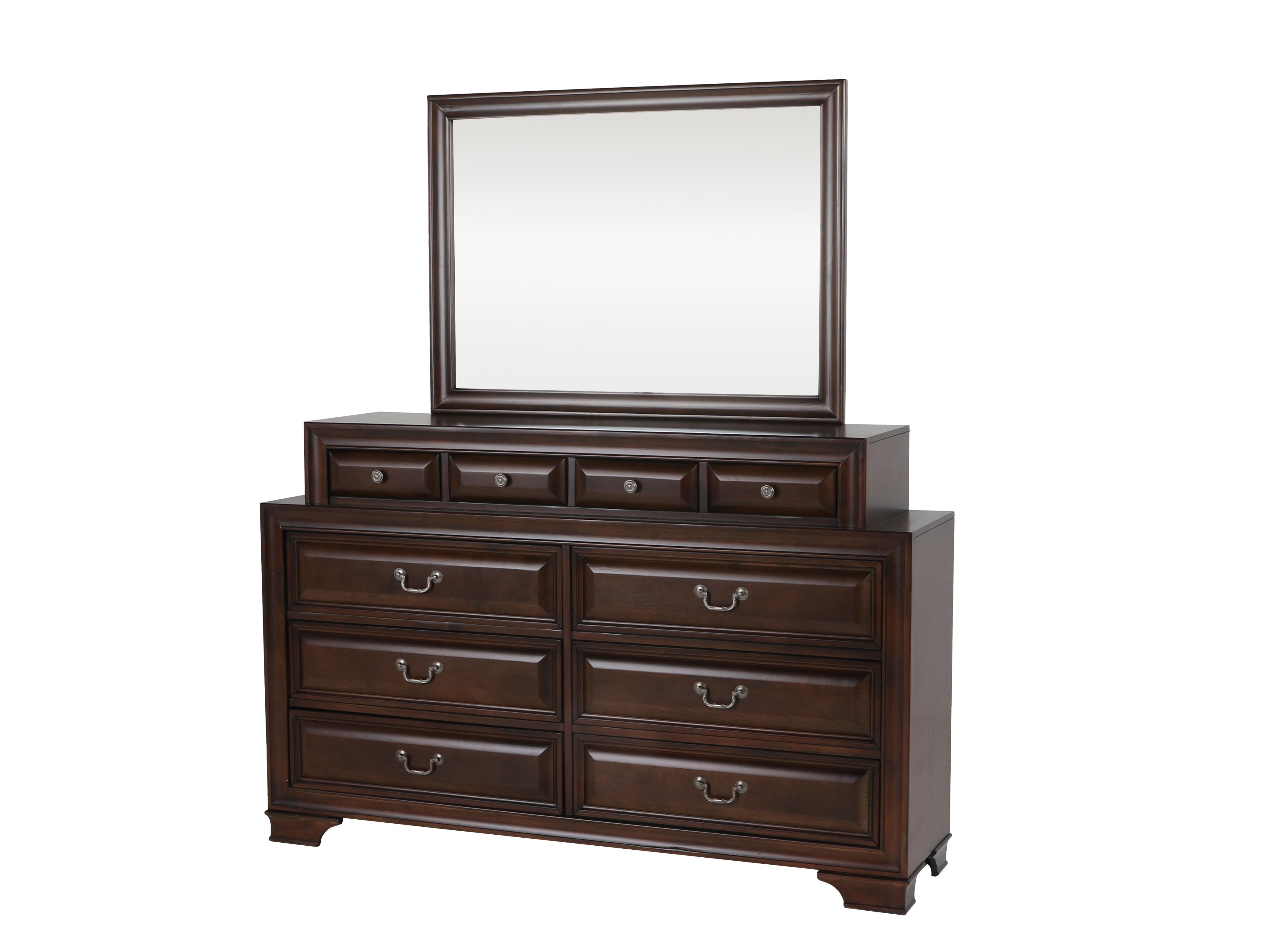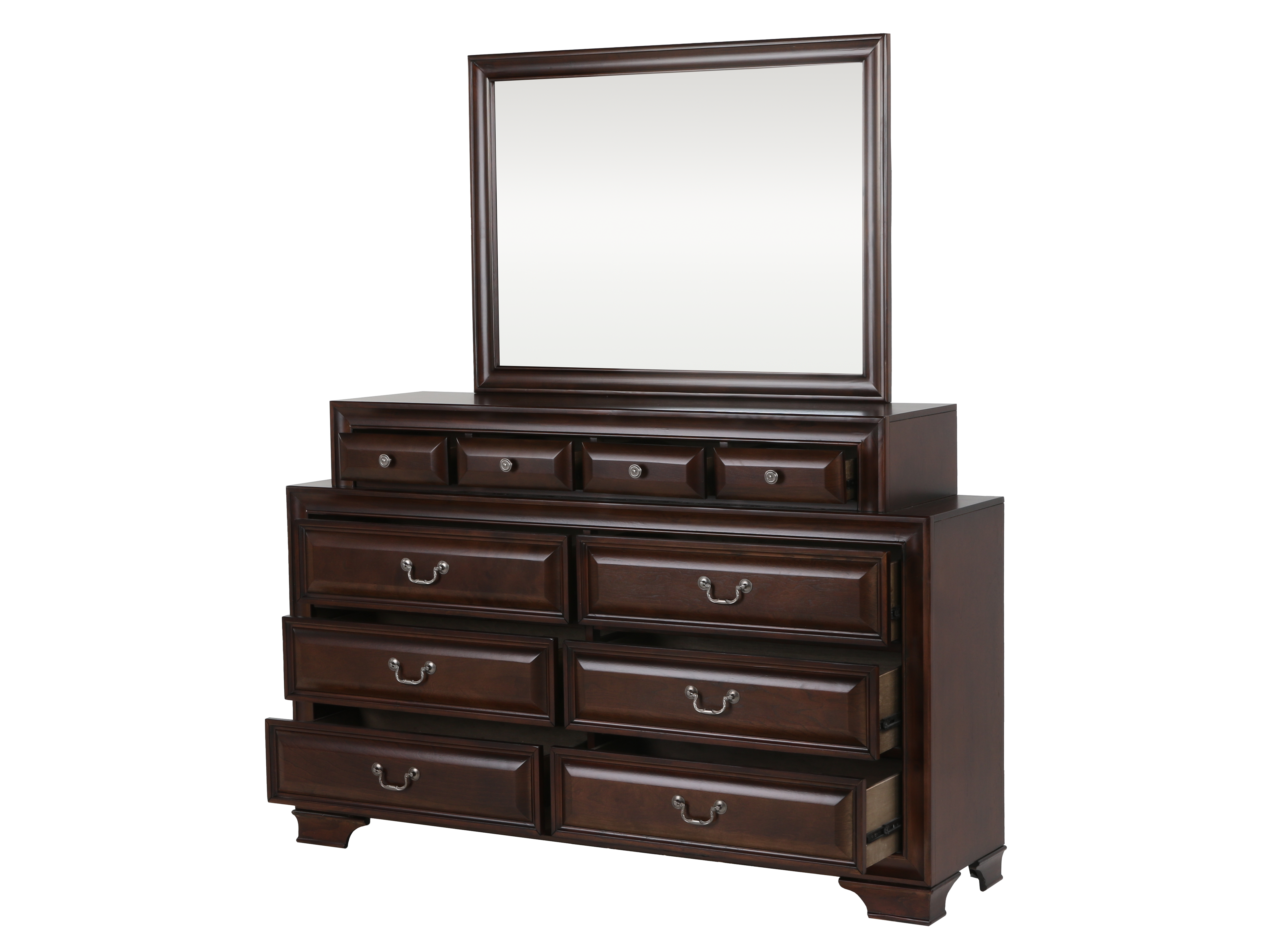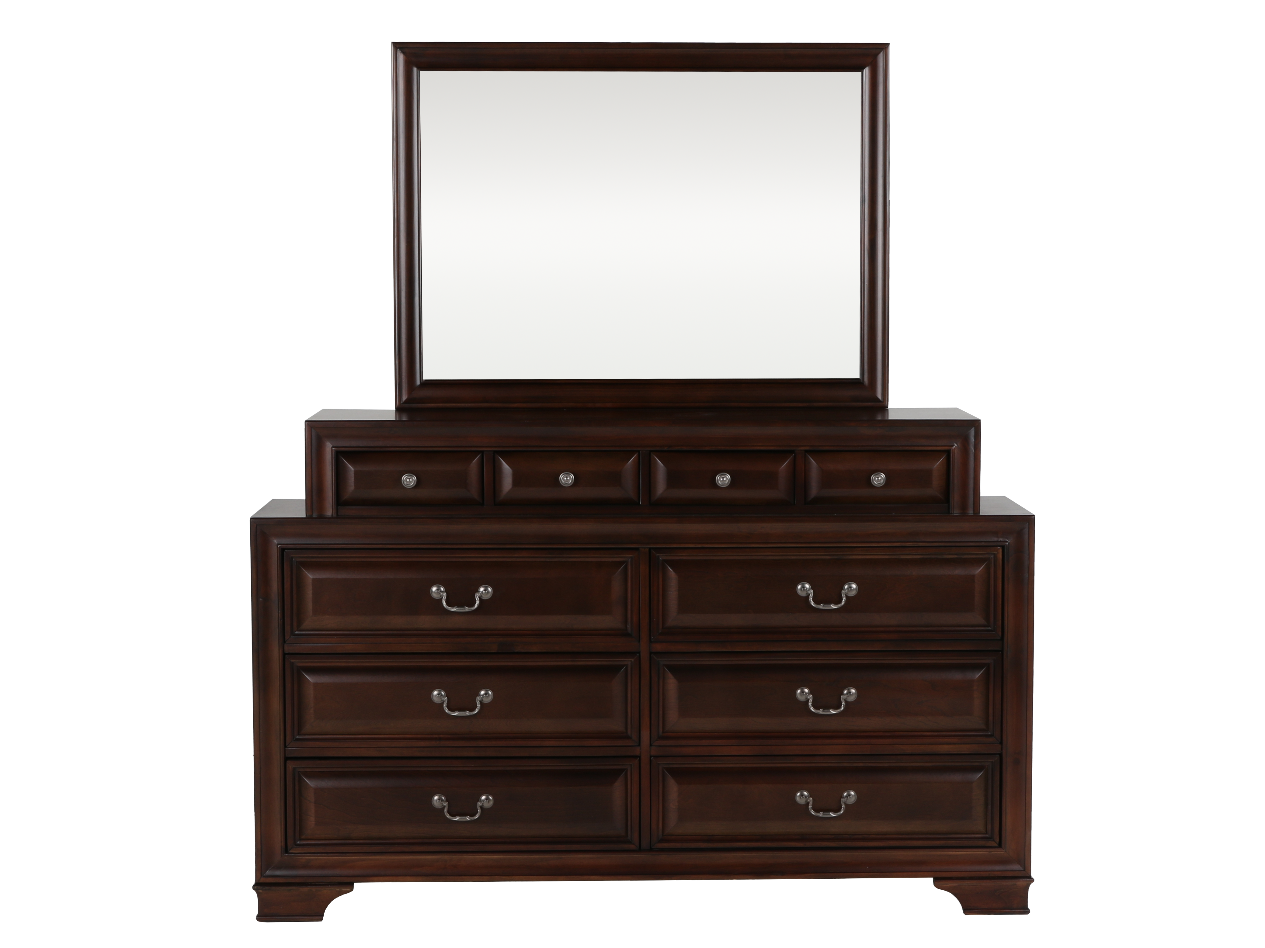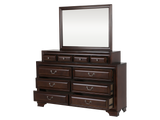 Includes: Headboard, Footboard, Rails & Slats, Dresser, Mirror, Nightstand.