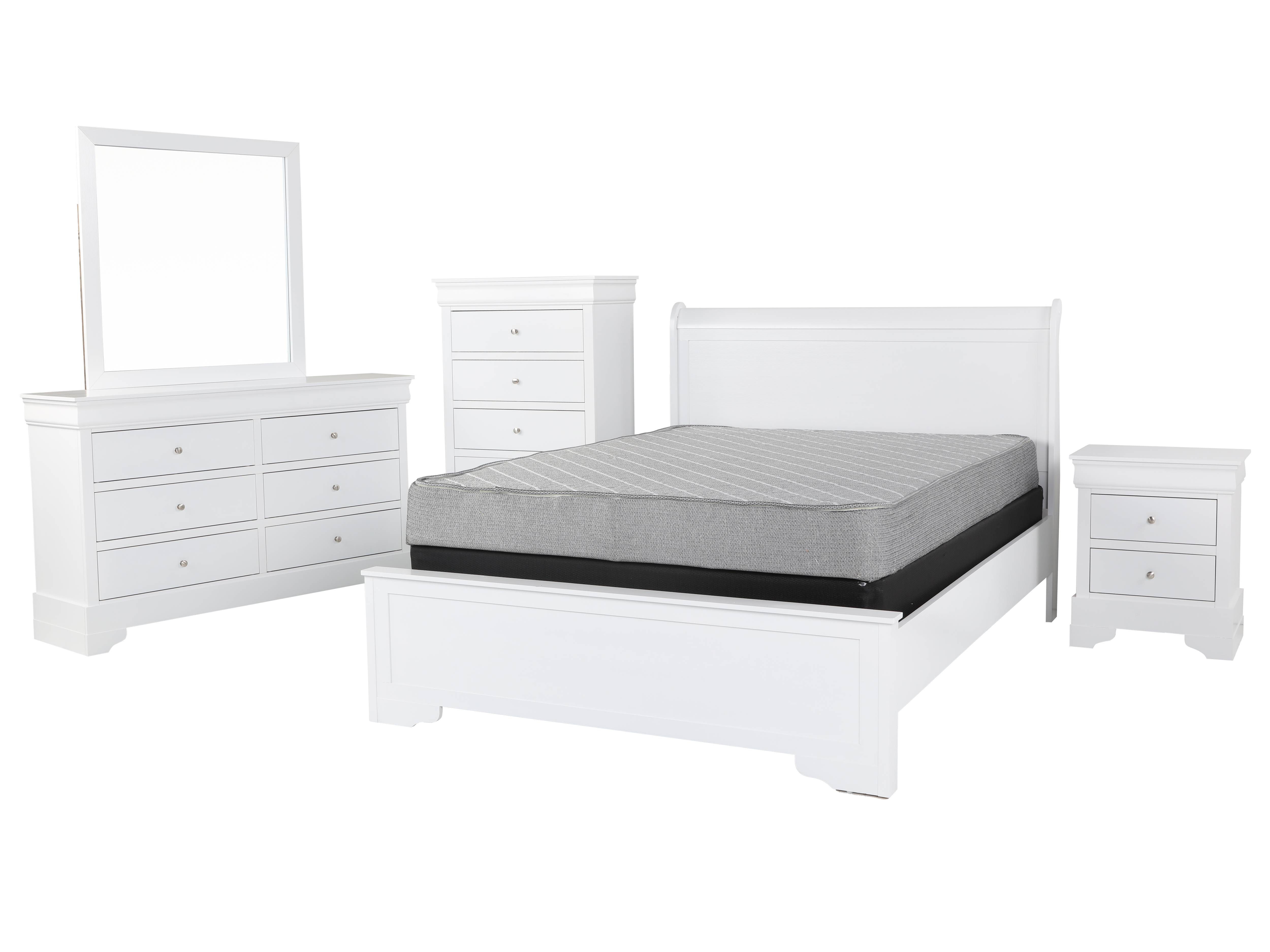 Includes: Headboard, Footboard, Side rails & slats, Dresser, Mirror, Nightstand.