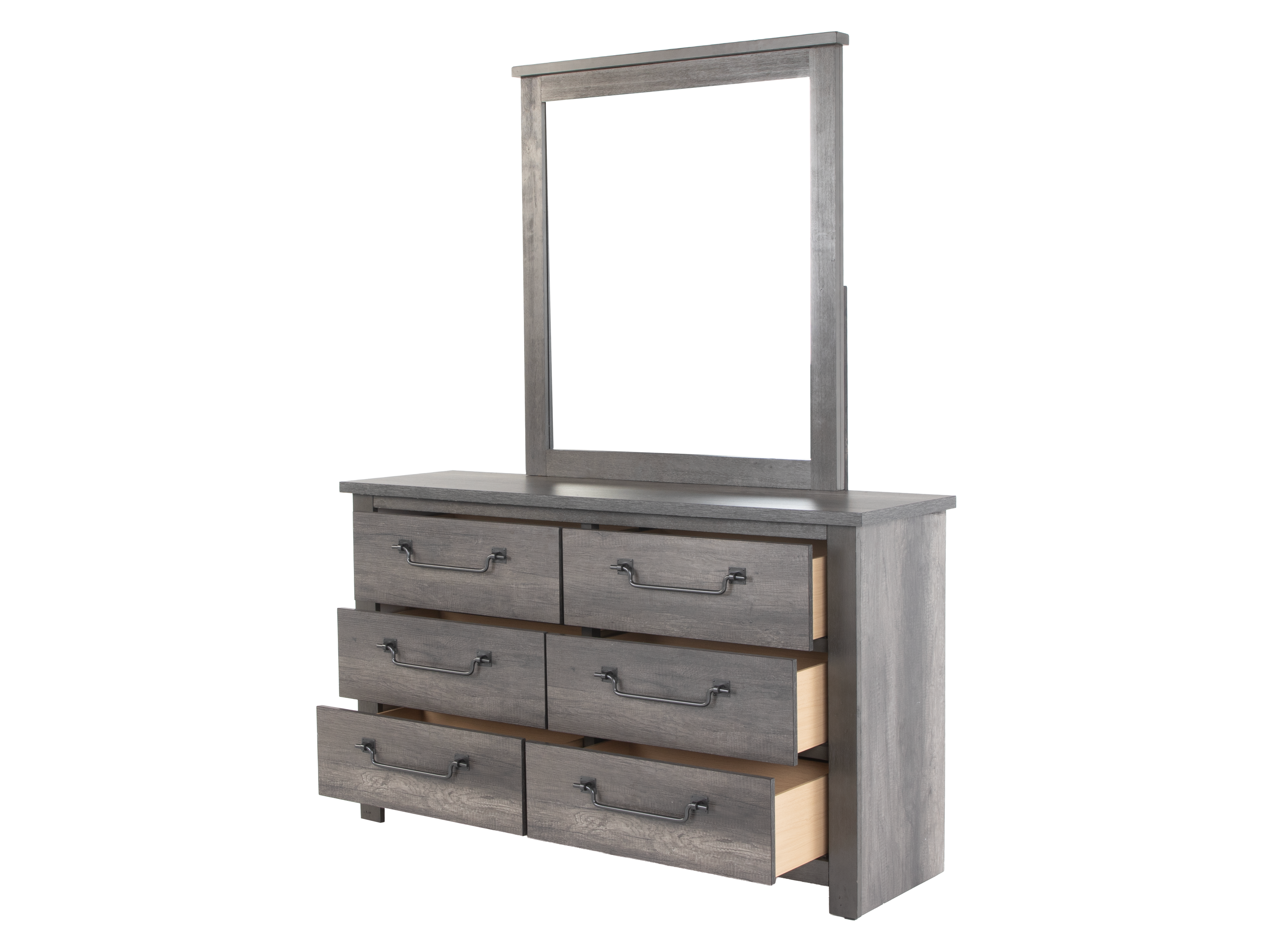 Includes: Headboard, Footboard, Side rails, Dresser, Mirror, Nightstand.