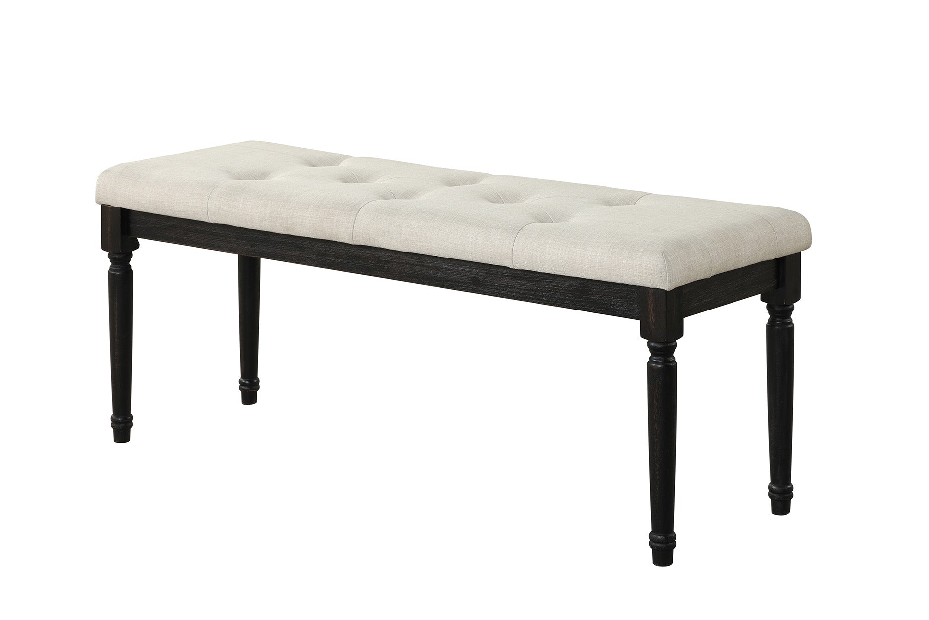 The set comes with four chairs, a bench, and a table, all featuring tufted upholstery and a dark brown wood dining table.
