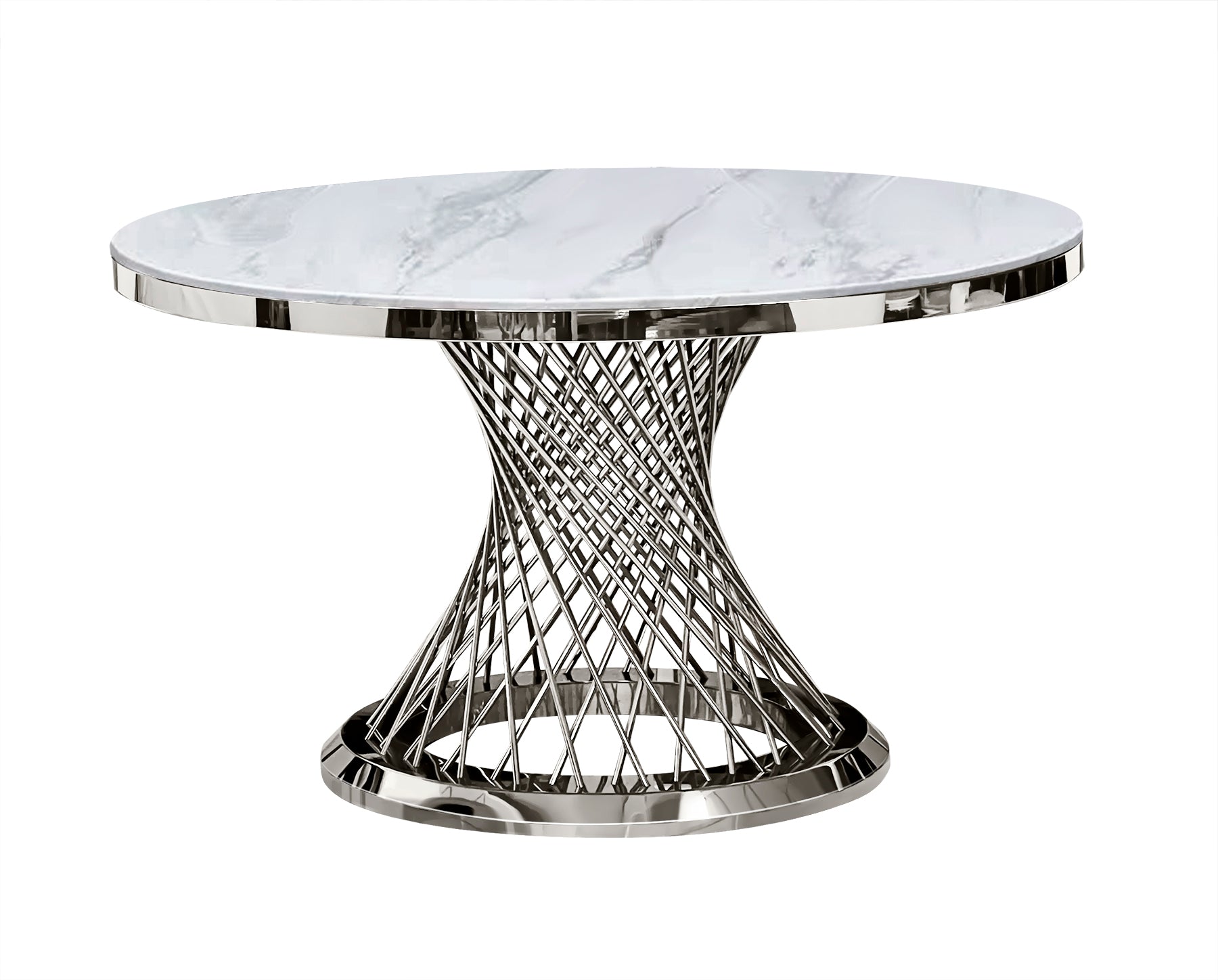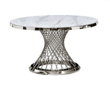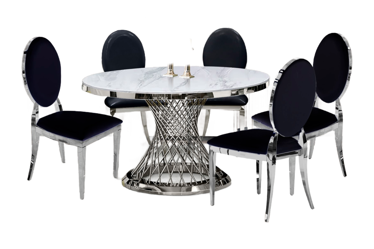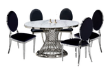 This modern 6-piece dining room set is a stylish and elegant addition to your dining room or eat-in kitchen. It features a beautiful white marble top with a chrome-finished base and a pedestal design to elevate the style of any space. The set comes with five matching chairs with comfortable black leatherette upholstery. Please note that this dining table includes one dining table and five chairs.