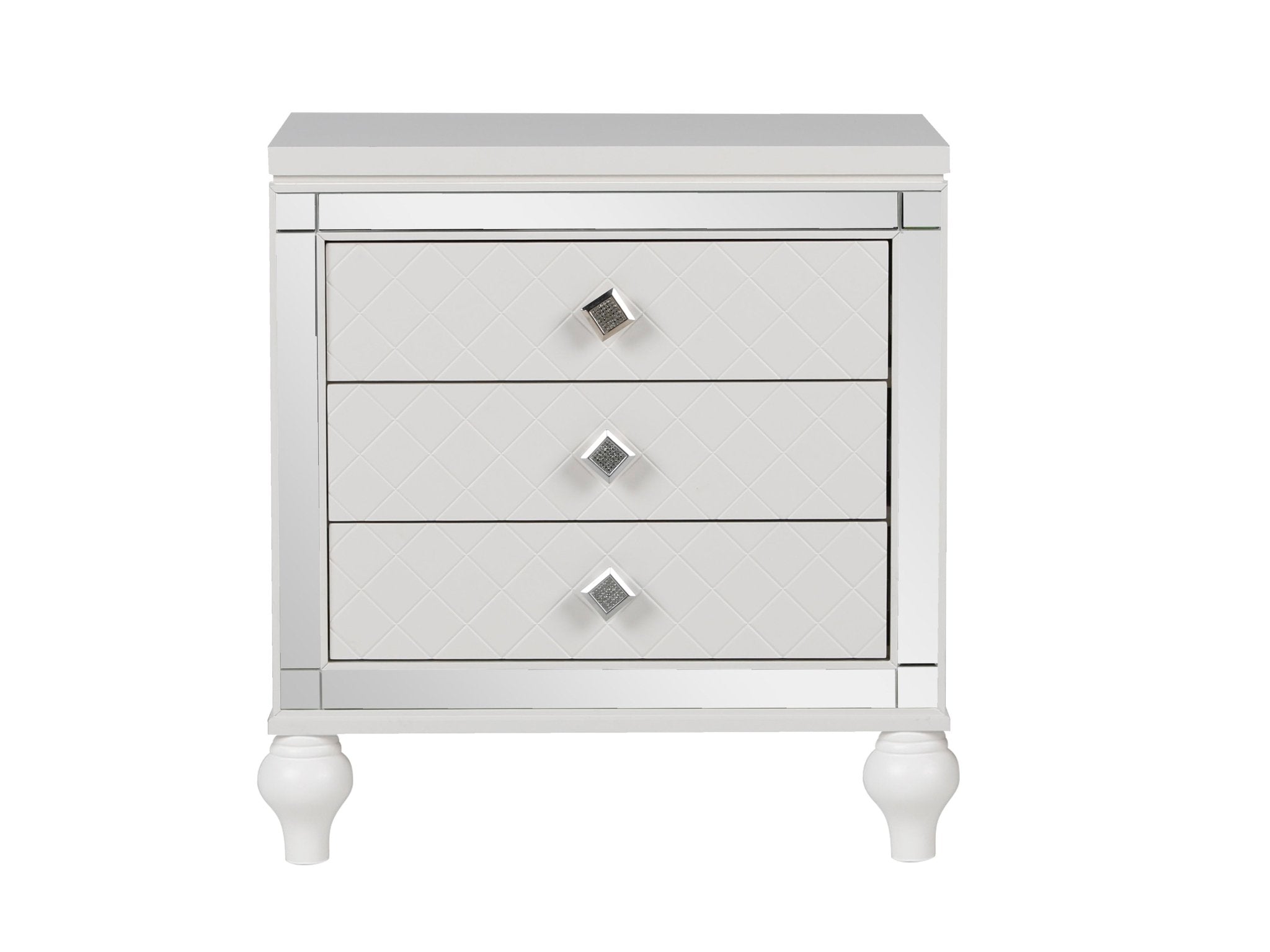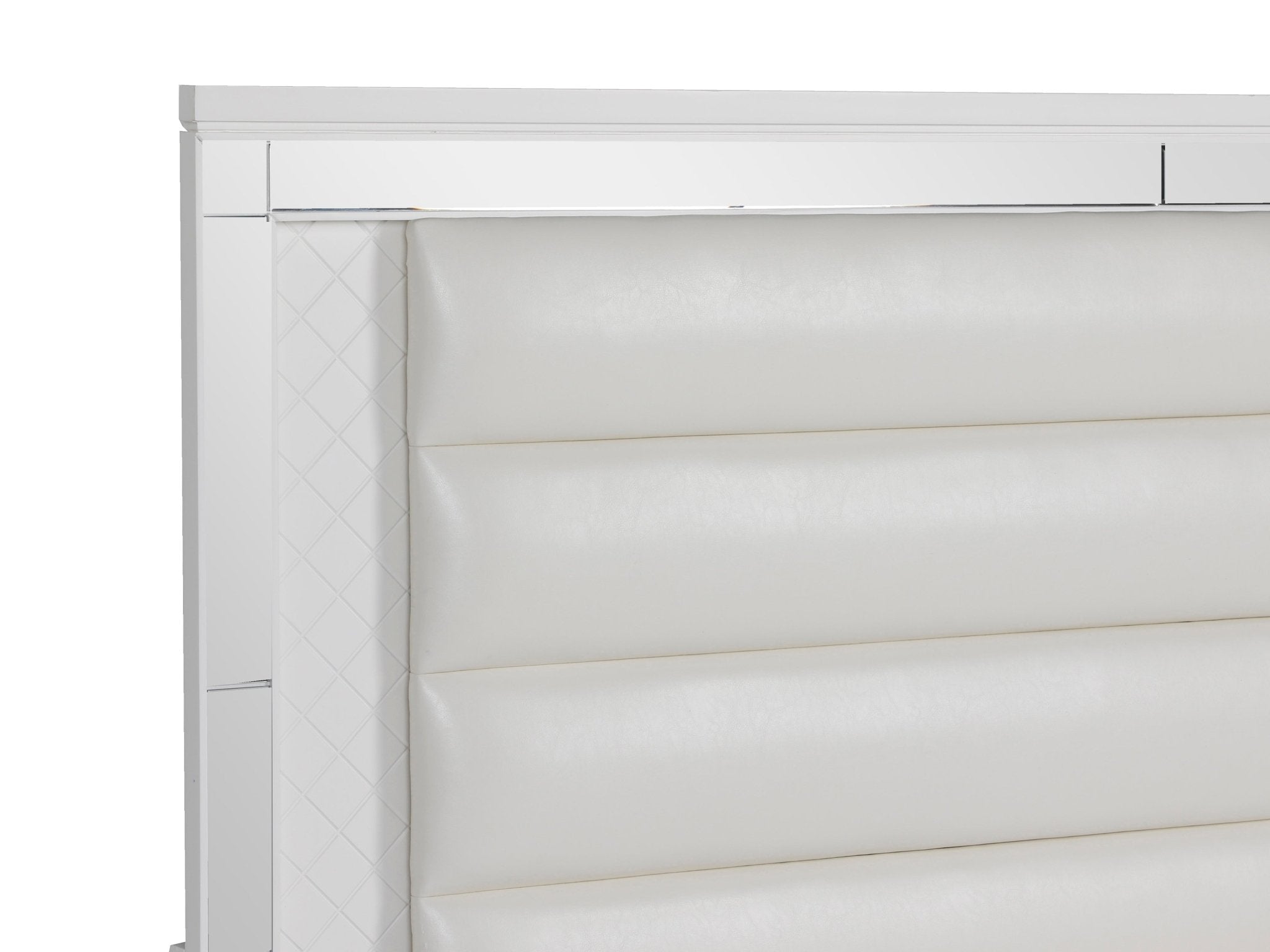 Adding a bold touch of glamour to your bedroom is this 6 piece bedroom set. Finished in a brilliant white, the embossed alligator board is reflected in the inlay mirrors of the bed and case pieces. Turned feet provide a distinct departure from the linear design of the collection, adding a distinctly flair. Drawer pulls add to the collection's allure with an inlay crystal and mirrored look.