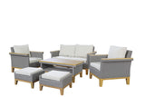 Upgrade your outdoor living space with this stylish and comfortable 6-piece patio set, designed for both relaxation and entertaining. Crafted with steel frame and wicker in an elegant gray finish, this set includes a spacious bench, two armchairs, two cushioned ottomans, and a coordinating table.
