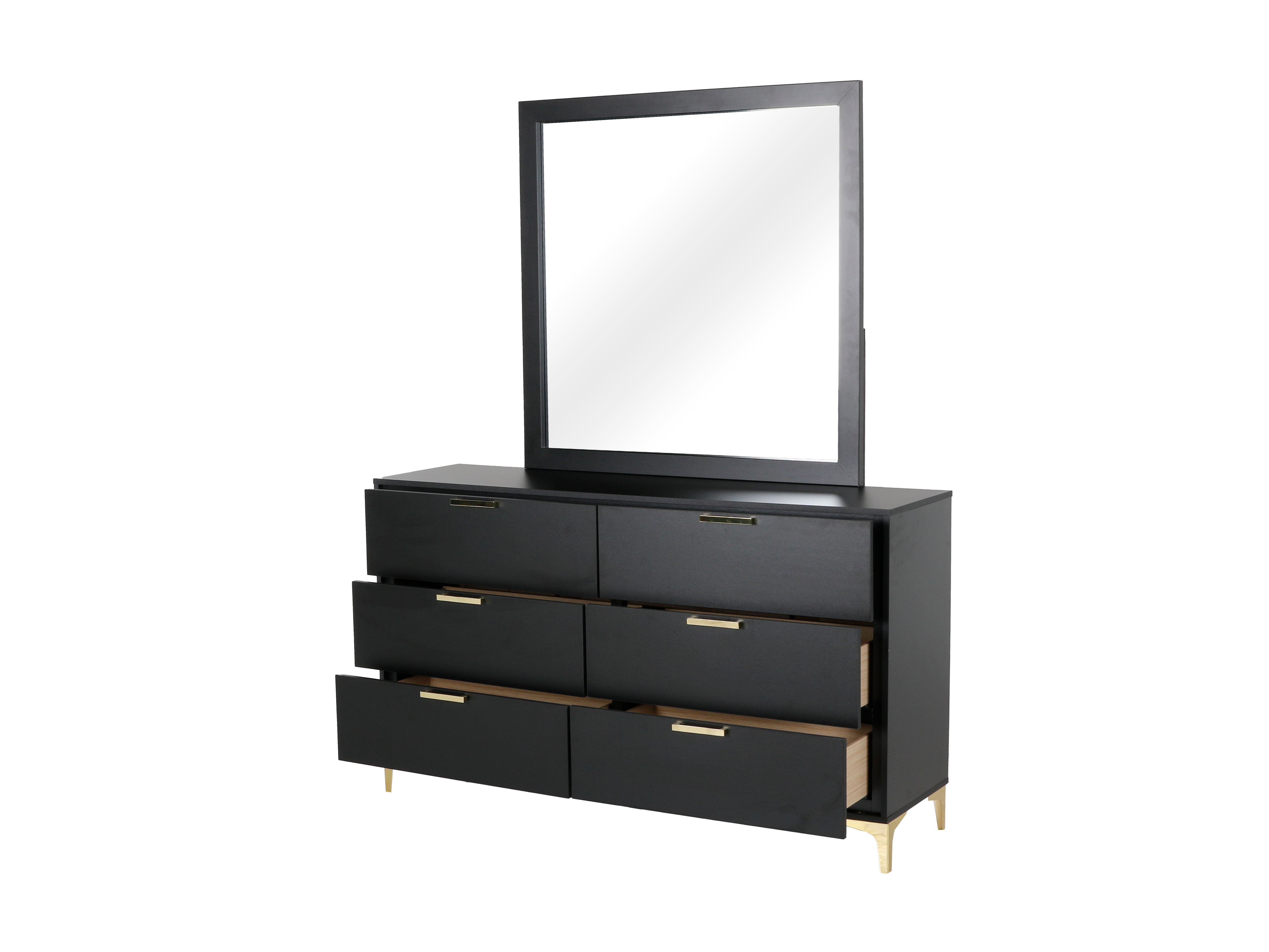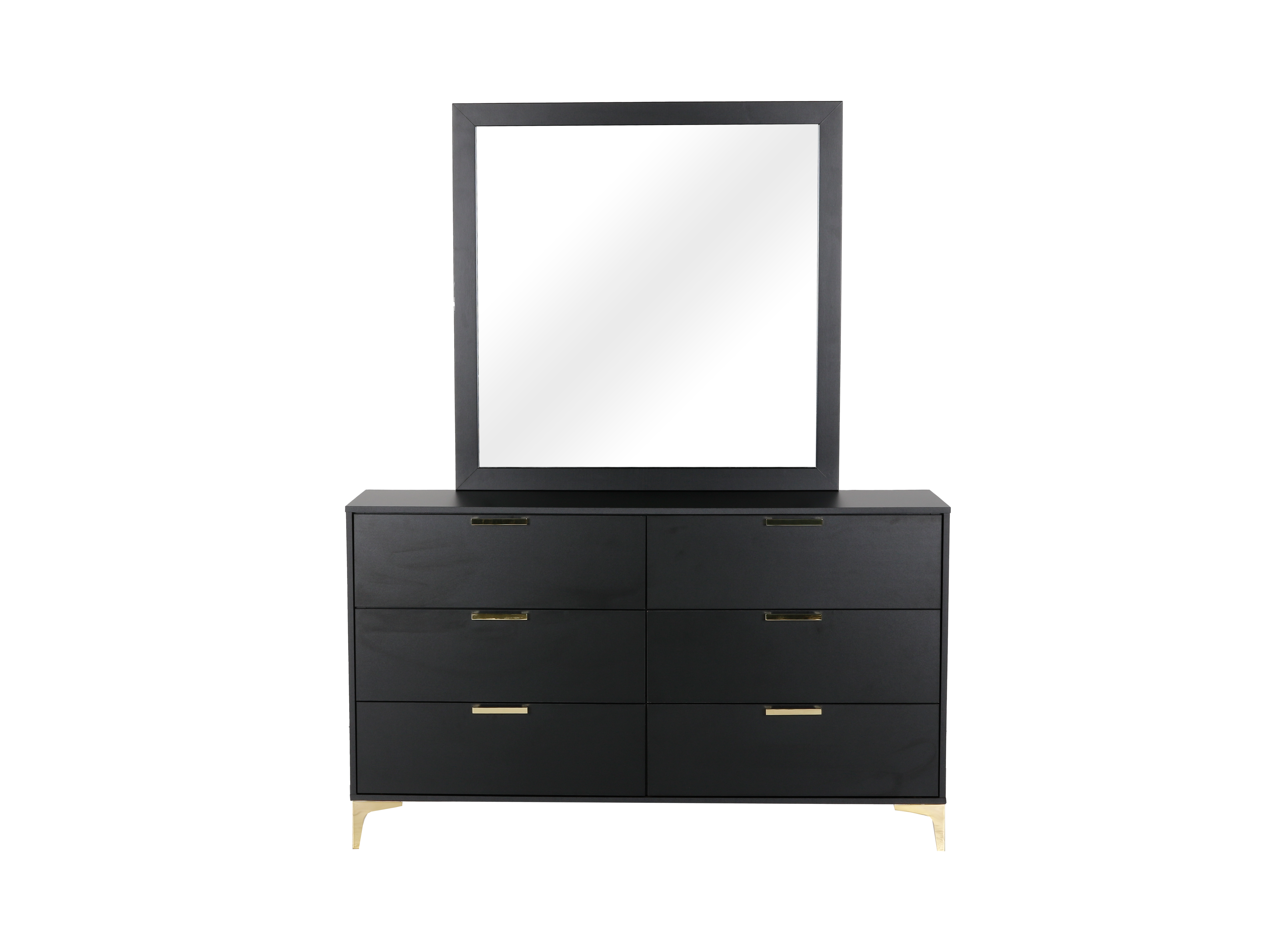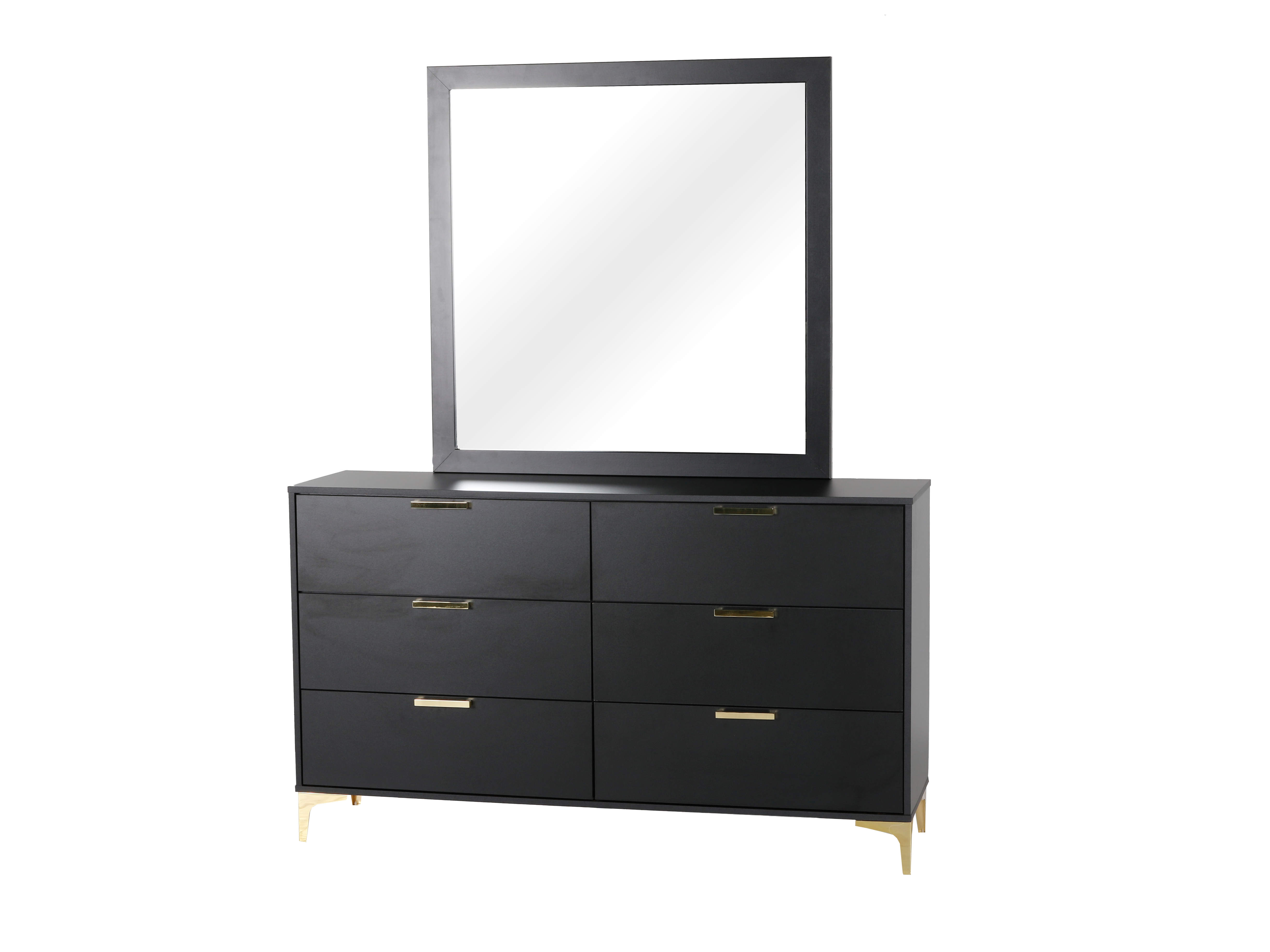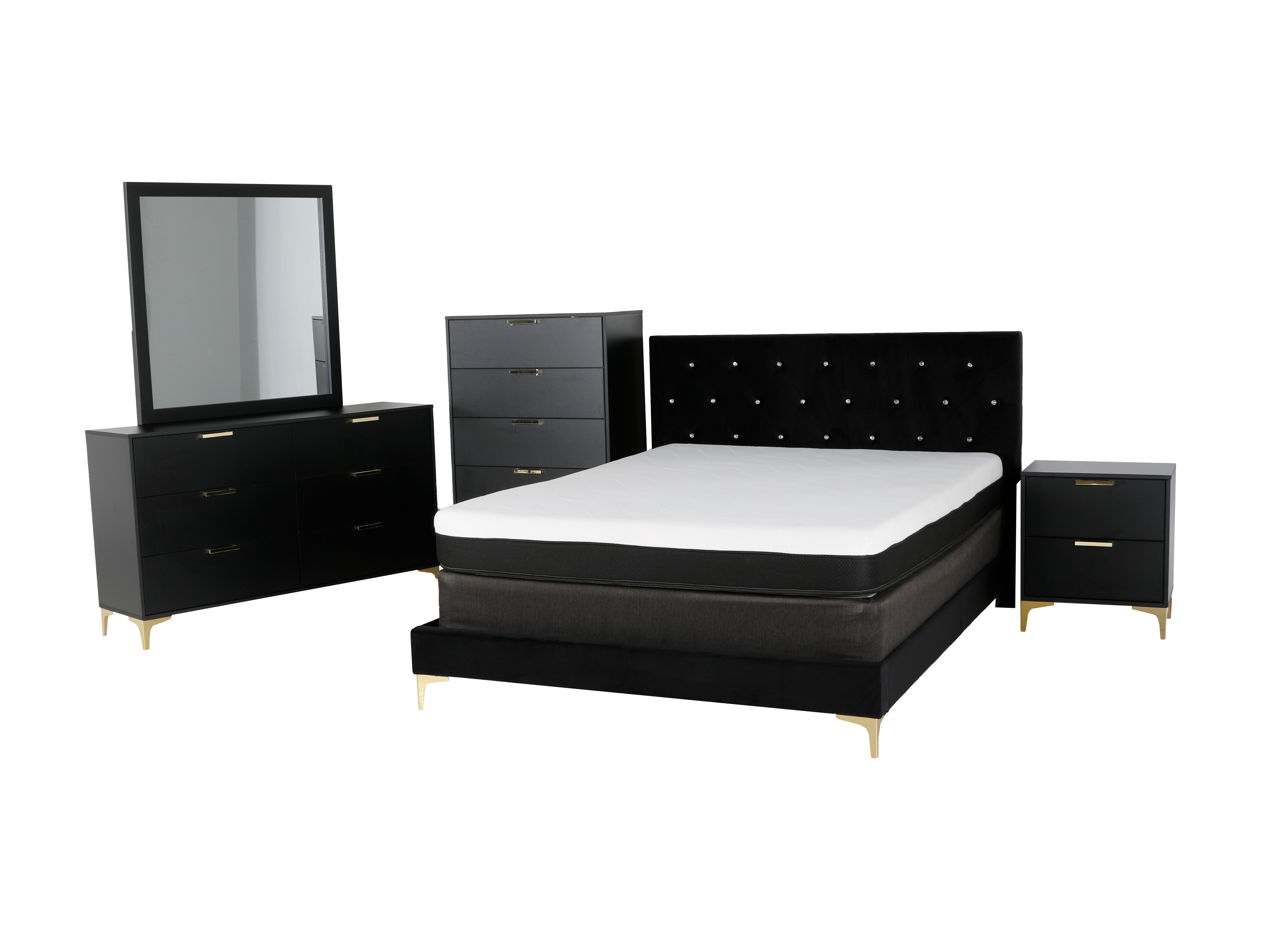 Transform your bedroom into a luxurious oasis with our 6 Piece Queen Bedroom Set. The foam padded bed, upholstered in black velvet, guarantees ultimate comfort while the chic black and gold design adds a touch of elegance. The modern style and durable materials, including MDF wood and velvet fabric, make this set a must-have for any bedroom. This bedroom set includes bed, dresser, mirror, and nightstand.