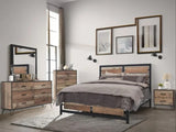 Enhance your space with this timeless rustic bedroom set. Combining cast iron framing and stained wood, it exudes a modern farmhouse feel that will instantly grab your attention. Constructed with top-tier solid woods for long-lasting use, and equipped with drawer glides for effortless drawer operation, this bed offers exceptional durability. The English Dovetailed Drawers add even more strength and stability, while the rustic brown finish adds warmth and personality to any bedroom. It includes a Queen bed, a nightstand, a mirror, and a 6-drawer dresser.