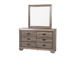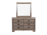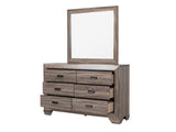 This bedroom set will be a great addition to a wide variety of decors. The collection features clean and refined lines and a subtle finish. Contemporary square bun feet and large frames containing recessed drawers and panels create a refined and stylish aesthetic. Contemporary rustic styling with grooved headboard and woodgrain finishing. Beveled picture frame detailing on all pieces. English dovetail drawer construction for strength. Kenlin metal center runners on drawers will not buckle with humidity changes. Dustproof bottoms on case pieces. The dresser features a heavy frame and flat recessed drawers creating a contemporary feeling. The smooth finish and dark pull hardware adds more modern touches. Pair this dresser with a nightstand and bed from this collection for a cohesive bedroom set.