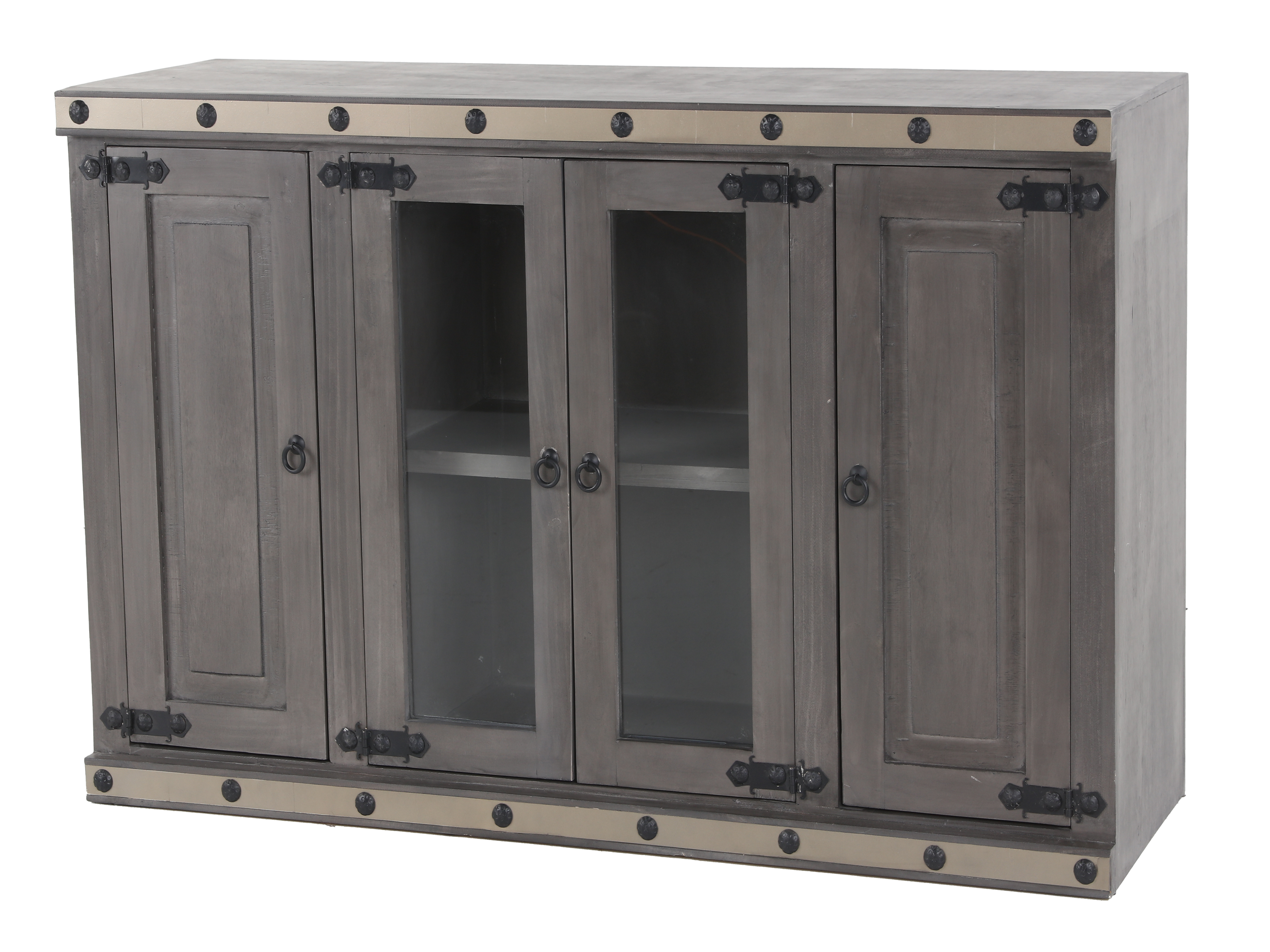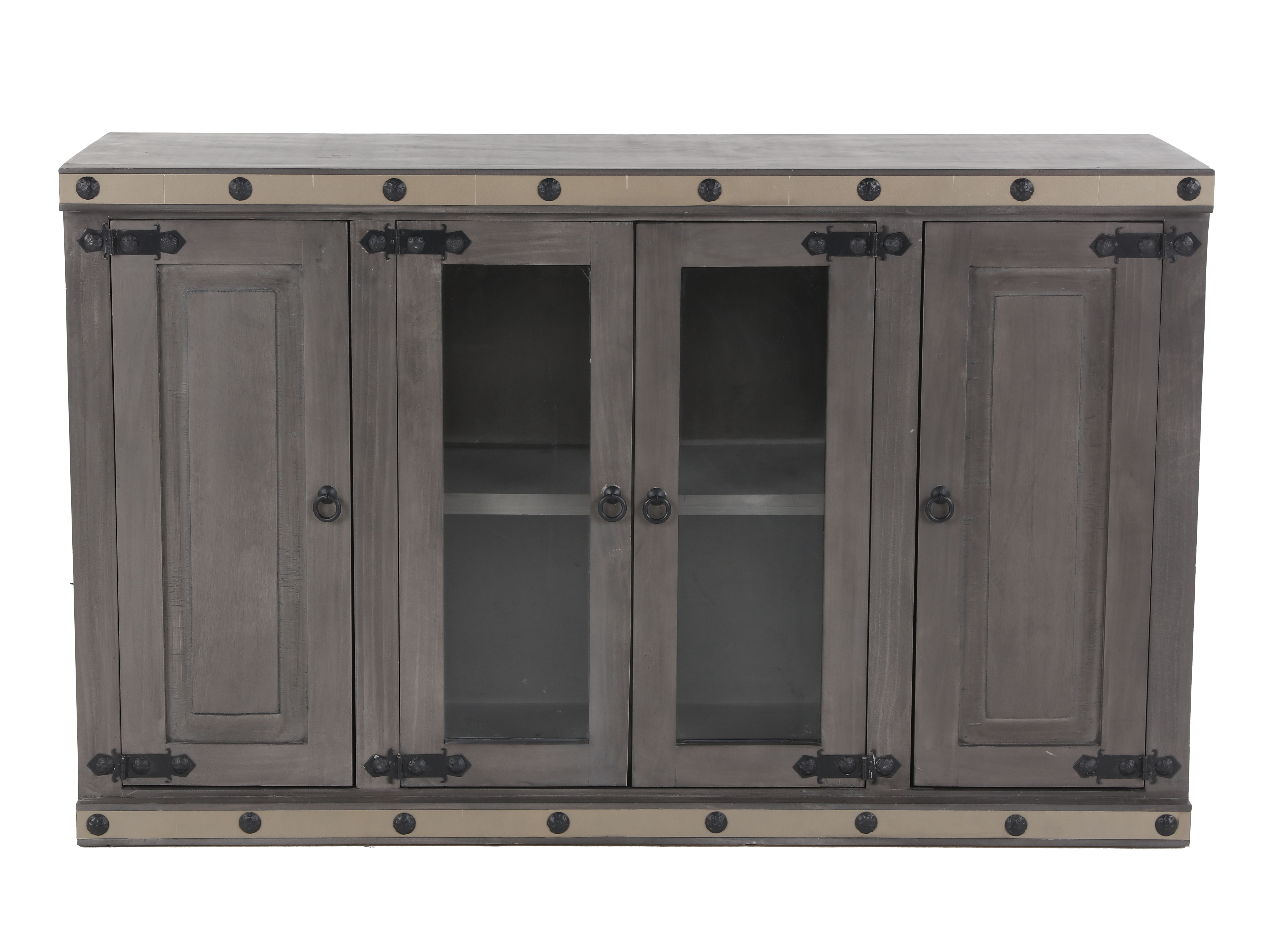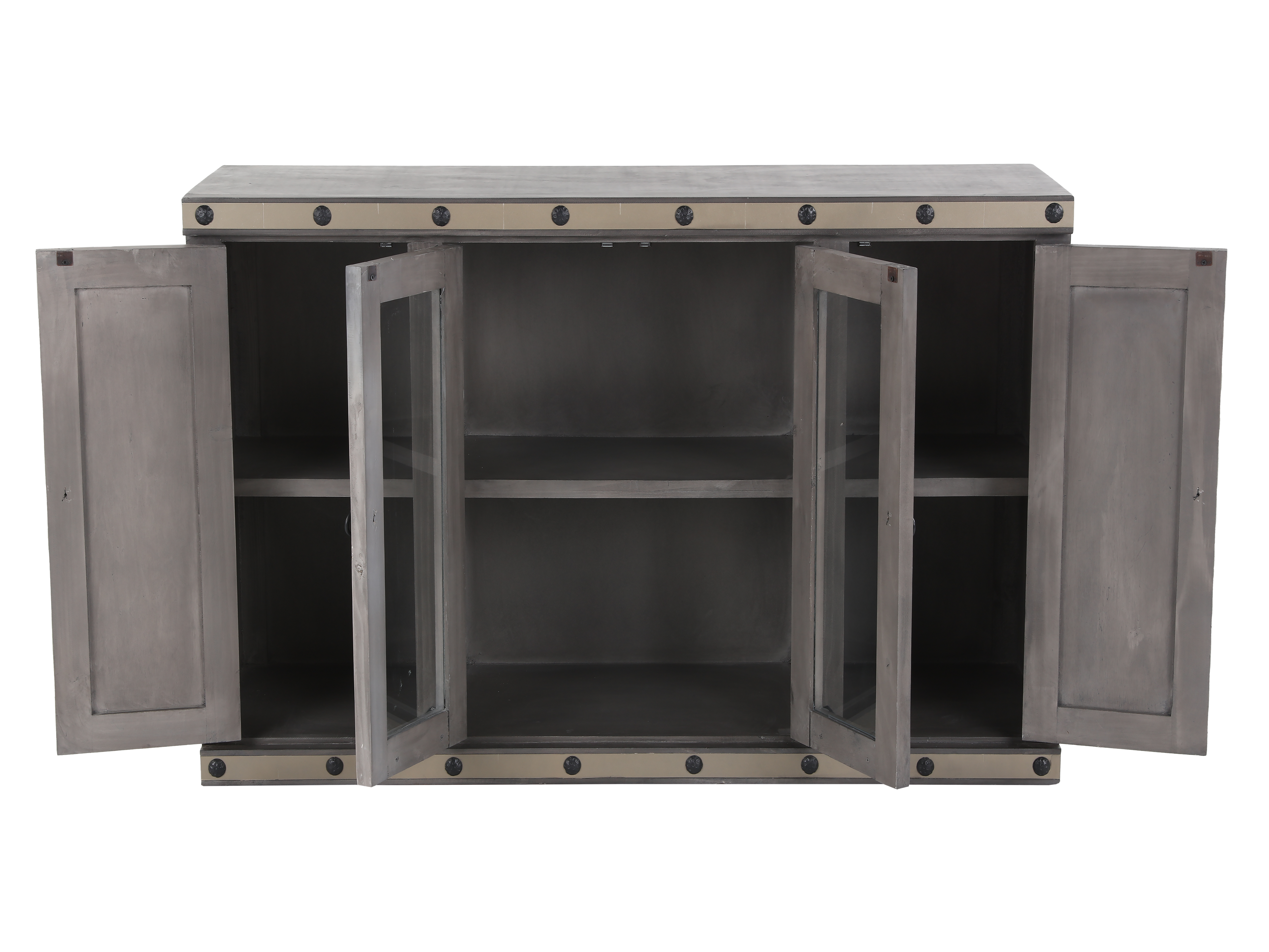 This industrial-style 60" TV stand combines functionality with a sleek, contemporary design. Crafted from solid wood with a matte finish, it features a rectangular shape with a flat top surface perfect for your television. The stand includes four doors—two glass panels for easy visibility of your media devices and two solid ones for concealed storage. Inside, two shelves offer ample space for organizing all your accessories and electronics. Rivet details along the edges enhance its industrial aesthetic, making it a stylish addition to any modern living room. This TV stand not only provides practical storage solutions but also adds a touch of edgy sophistication to your space.