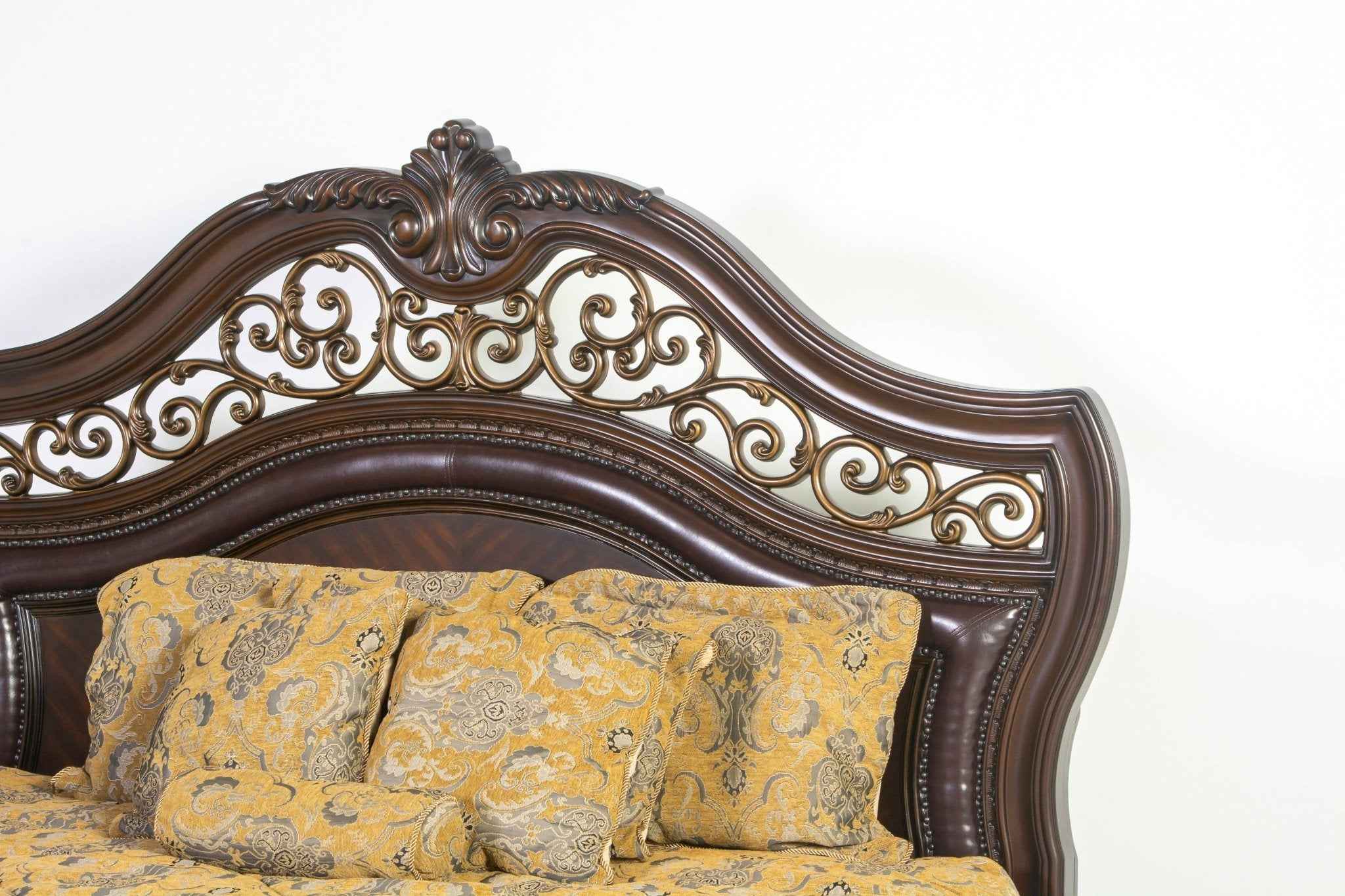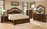 This traditional Bed room set inspired 6 Piece Queen Bedroom Set is built from fine hardwood and walnut burled wood veneers. It has an acanthus leaf shell trim on the headboard that matches the trim on the mirror. The triple dresser and extra-large nightstand have solid marble tops that add an extra layer of elegance to the overall set.