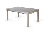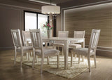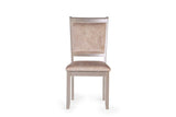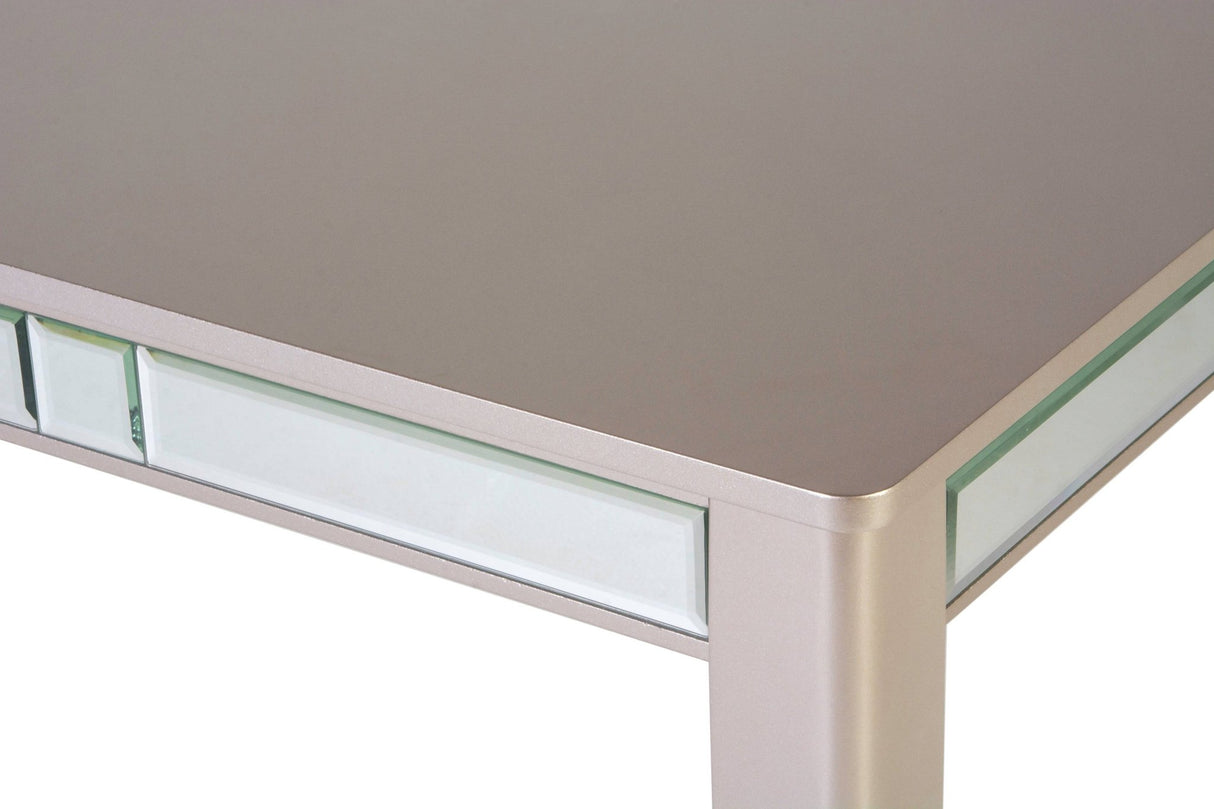 Bring subtle glamour to every meal with this 7-piece dining set, featuring a sleek rectangular table wrapped in a radiant rose-gold metallic finish with mirror-inset aprons, plus six comfortably cushioned side chairs. Clean lines keep the look contemporary while the mirrored accents add just the right sparkle. Seats are upholstered in a soft, easy-to-maintain fabric for everyday comfort.