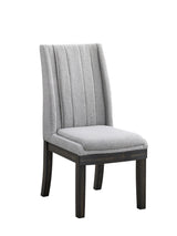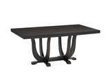Upgrade your dining space with this sleek and sophisticated dining room set, designed to blend timeless elegance with modern functionality. Featuring a rectangular table with a dark woodgrain MDF tabletop and a sturdy curved pedestal base crafted from durable rubberwood. The centerpiece of the set is a rectangular table with a dark woodgrain finish and a unique curved pedestal base, creating a dramatic yet inviting focal point for your dining area. The set includes six high-back chairs upholstered in soft, light-gray fabric with subtle vertical stitching for added texture and a refined touch. The chairs feature padded seats for exceptional comfort, ensuring you and your guests can enjoy hours of dining in style.