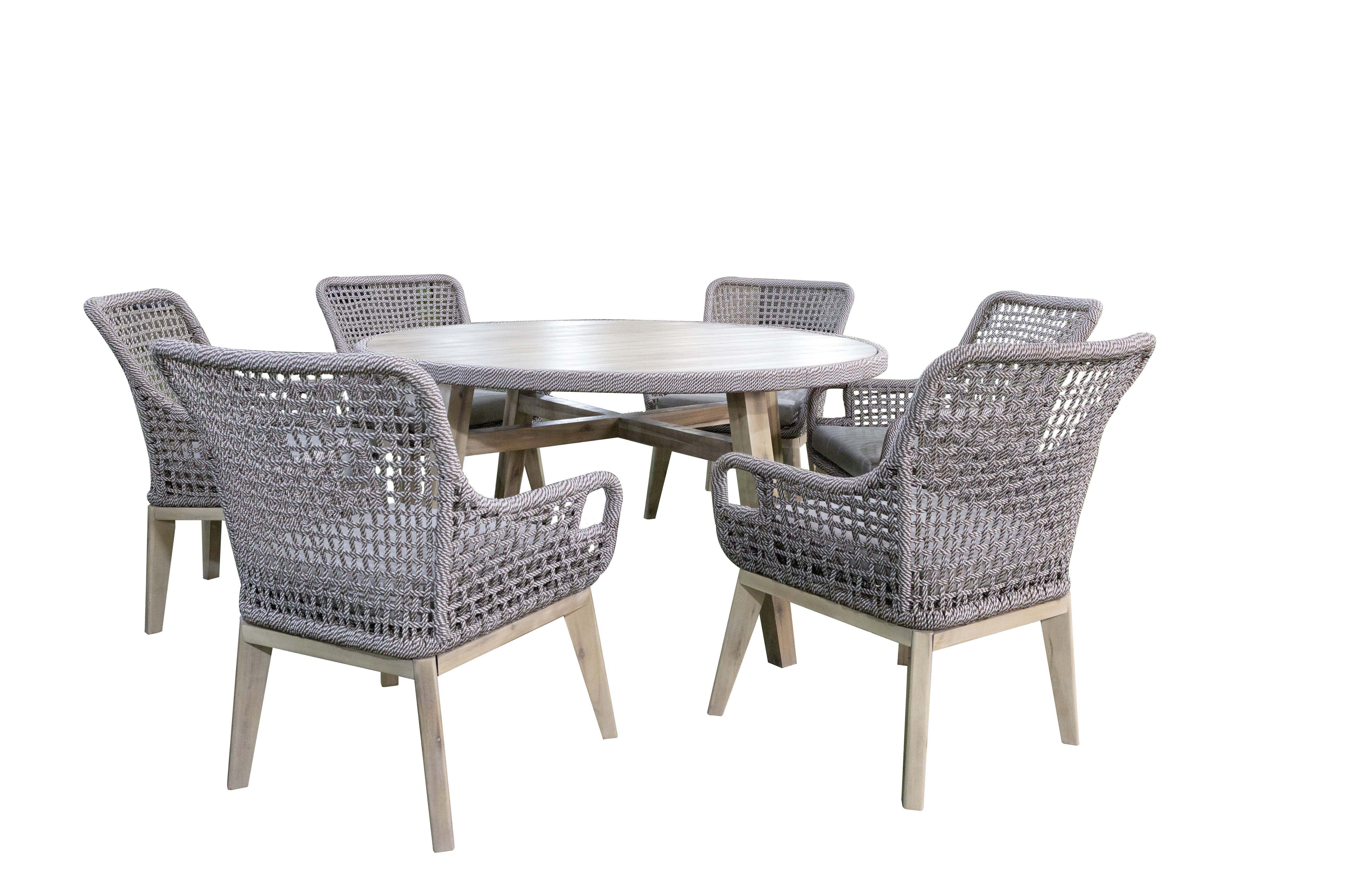 Elevate your outdoor living space with this stylish and functional 7-piece outdoor dining set. The set includes a sturdy acacia wooden round table with a charming wicker rim and six comfortable armchairs featuring steel frames. Each chair is expertly woven with durable rope, ensuring both comfort and support, and comes with a plush seat cushion for added relaxation. Perfect for patios, gardens, or any outdoor area, this dining set seamlessly combines modern aesthetics with practical functionality, making it a must-have for your outdoor entertaining needs.