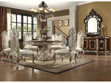 This dining table set has a beautifully carved and lacquered wooden design with intricate detailing. The curves and carvings are accurate and endearing, while the silver-tone finish adds to the elegance of the piece. This luxurious design reflects classic European furniture and embodies refined contemporary elegance.