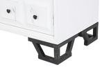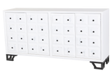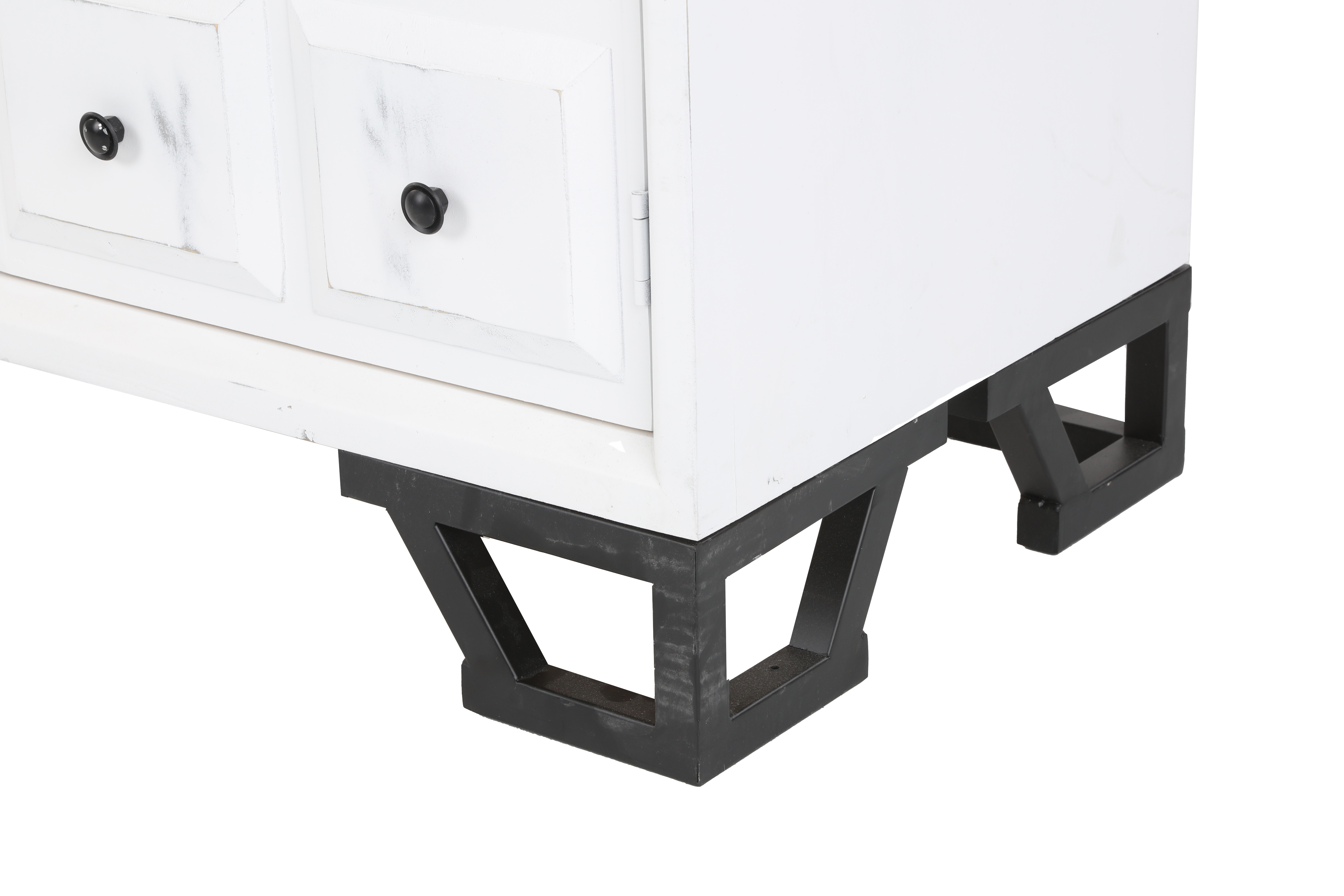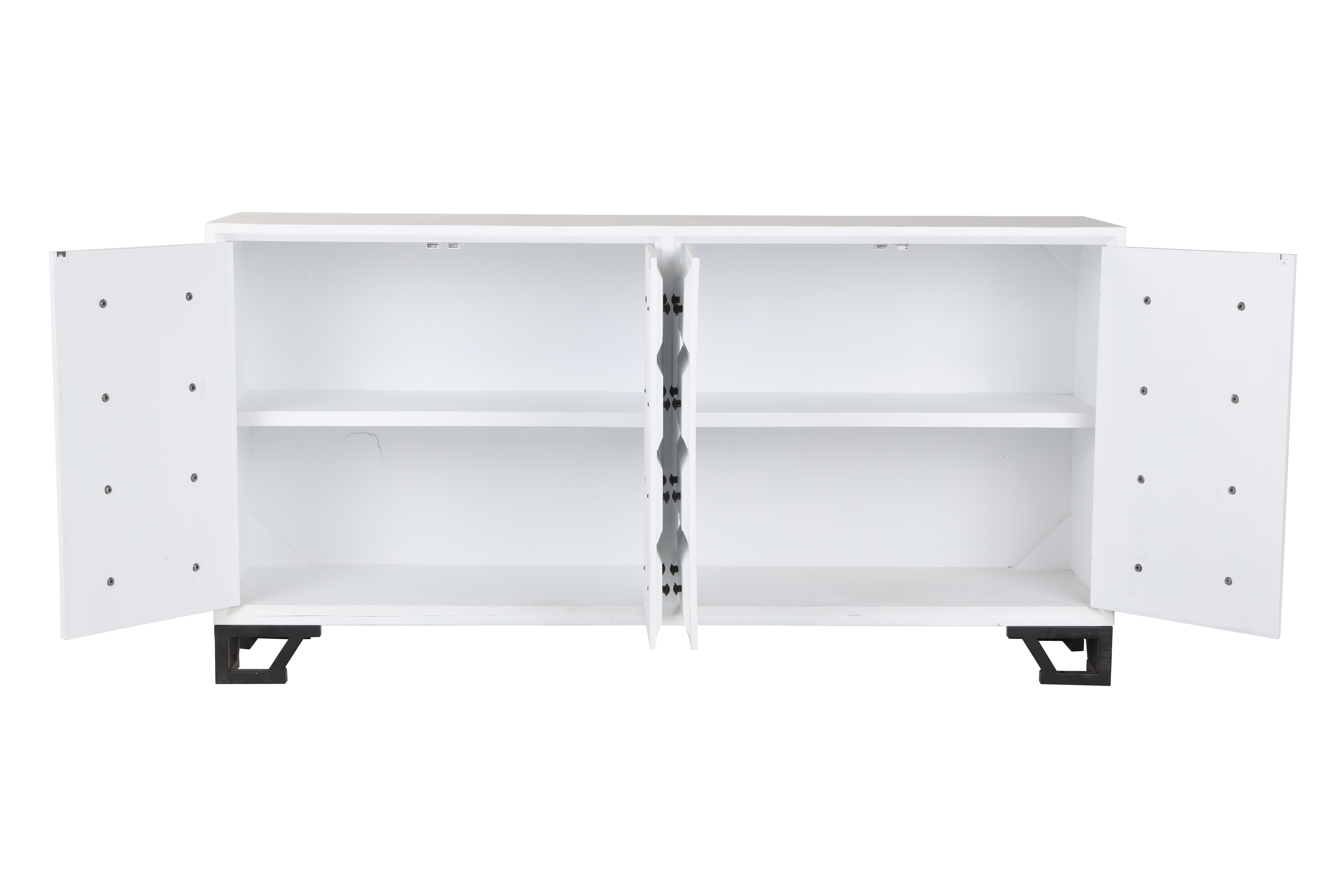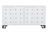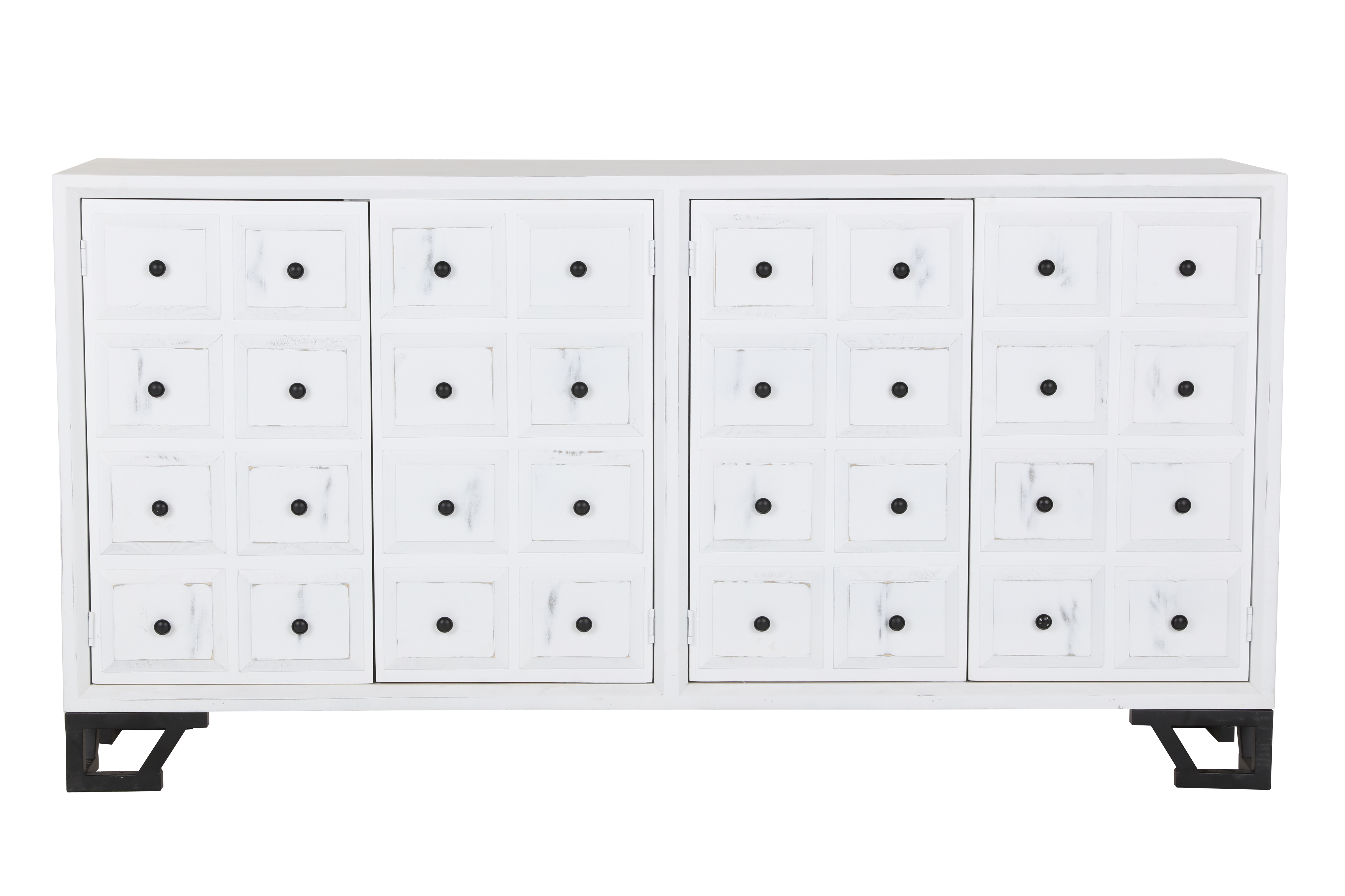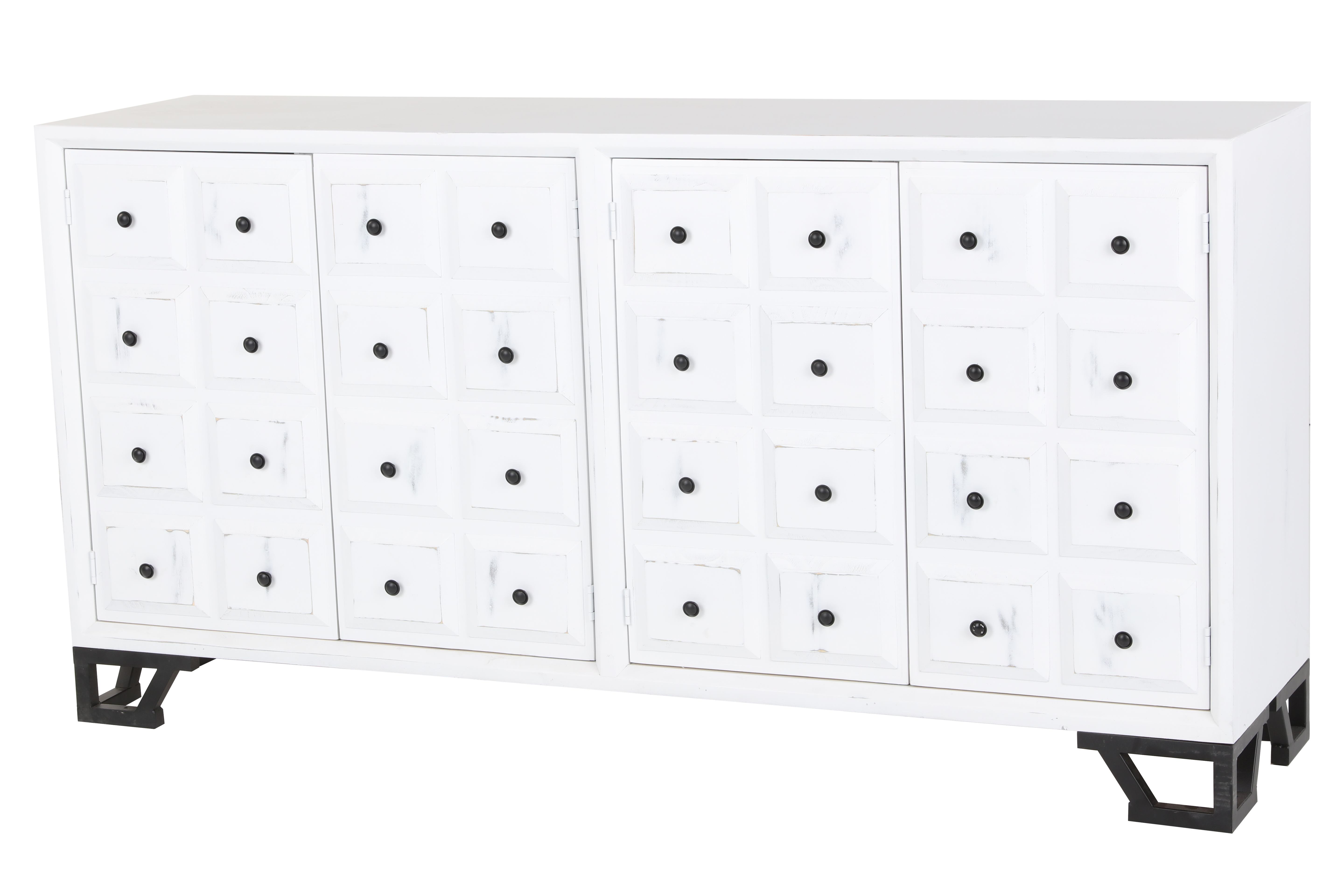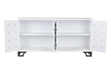 Elevate your entertainment space with this modern white TV console, designed to bring both functionality and charm to your home. This console features a crisp white finish that effortlessly complements any decor, with 2 doors opening to reveal 4 spacious shelves for ample storage. Its sturdy construction and minimalist design add a touch of elegance to your home entertainment setup. The front of doors boasts a unique distressed white finish with 24 small drawers, each with a black knob, arranged in a grid pattern. Black geometric legs complete the modern aesthetic, creating a harmonious blend of vintage charm and contemporary style, making it a standout piece in any living room.