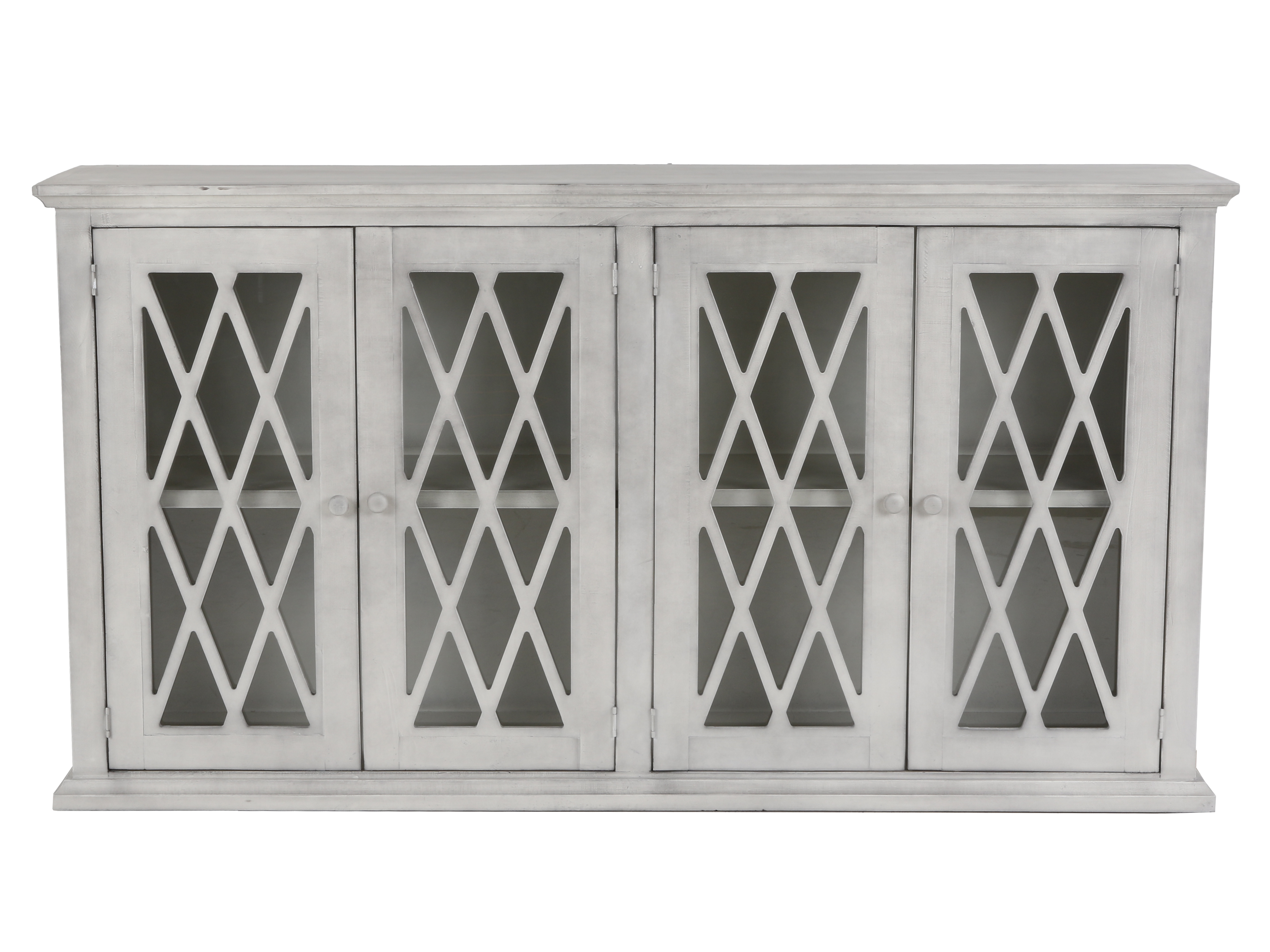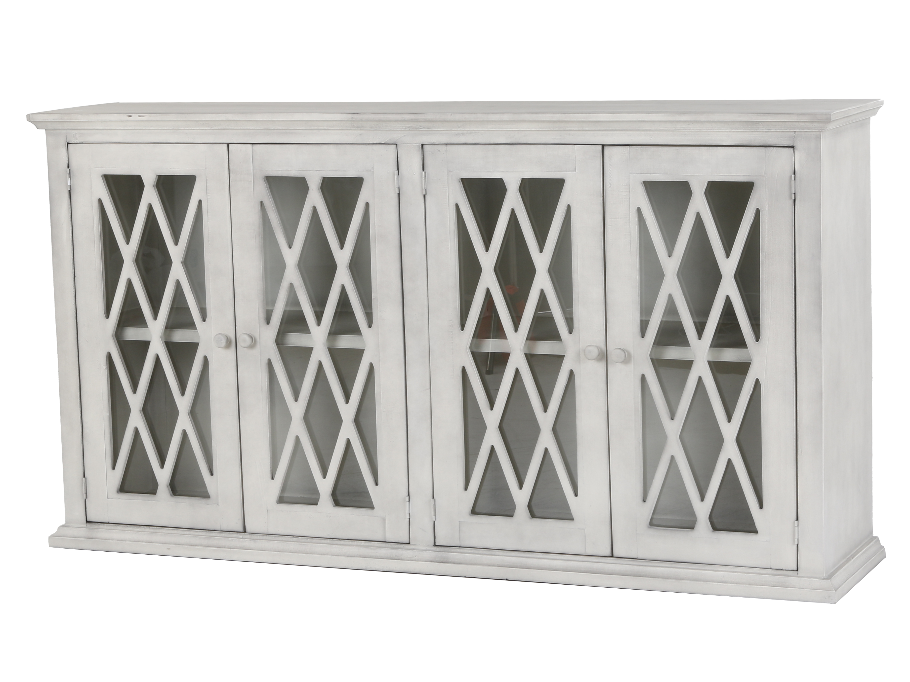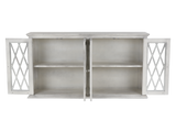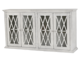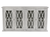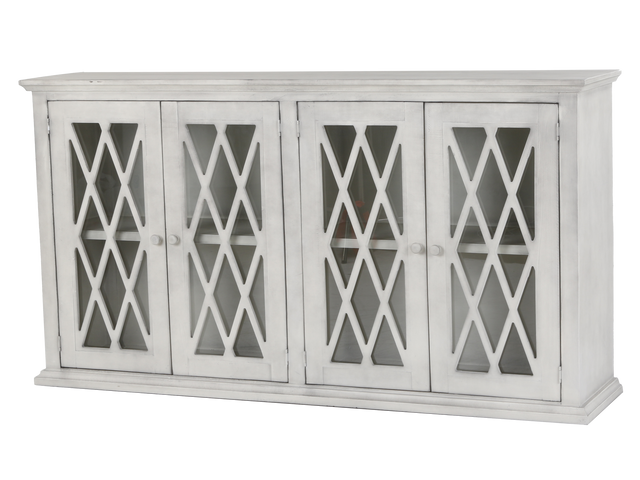 This 77-inch TV console combines rustic charm with modern elegance. Its whitewashed finish adds a touch of warmth to any room, while the intricate diamond-shaped glass doors offer a unique and stylish touch. The console features four glass doors with interior shelves, providing ample storage for media devices, game consoles, and other essentials. The neutral color and classic style make this console a perfect fit for a variety of home decor styles. Crafted from durable materials and easy to assemble, this console is a stylish and functional addition to any living room.