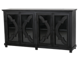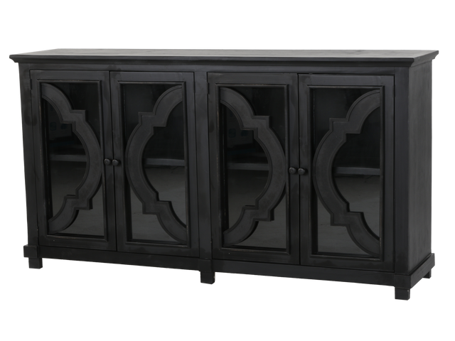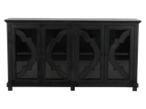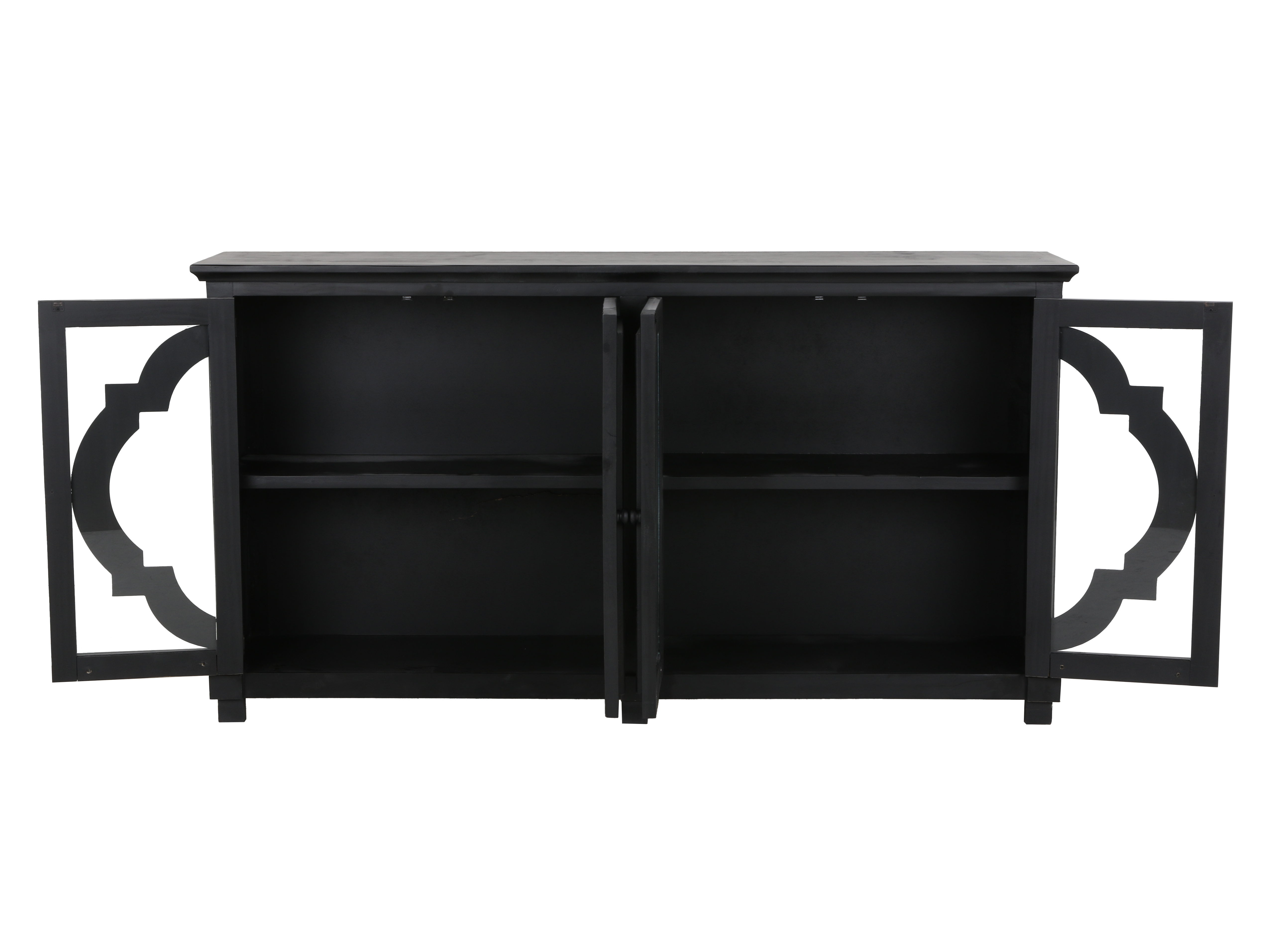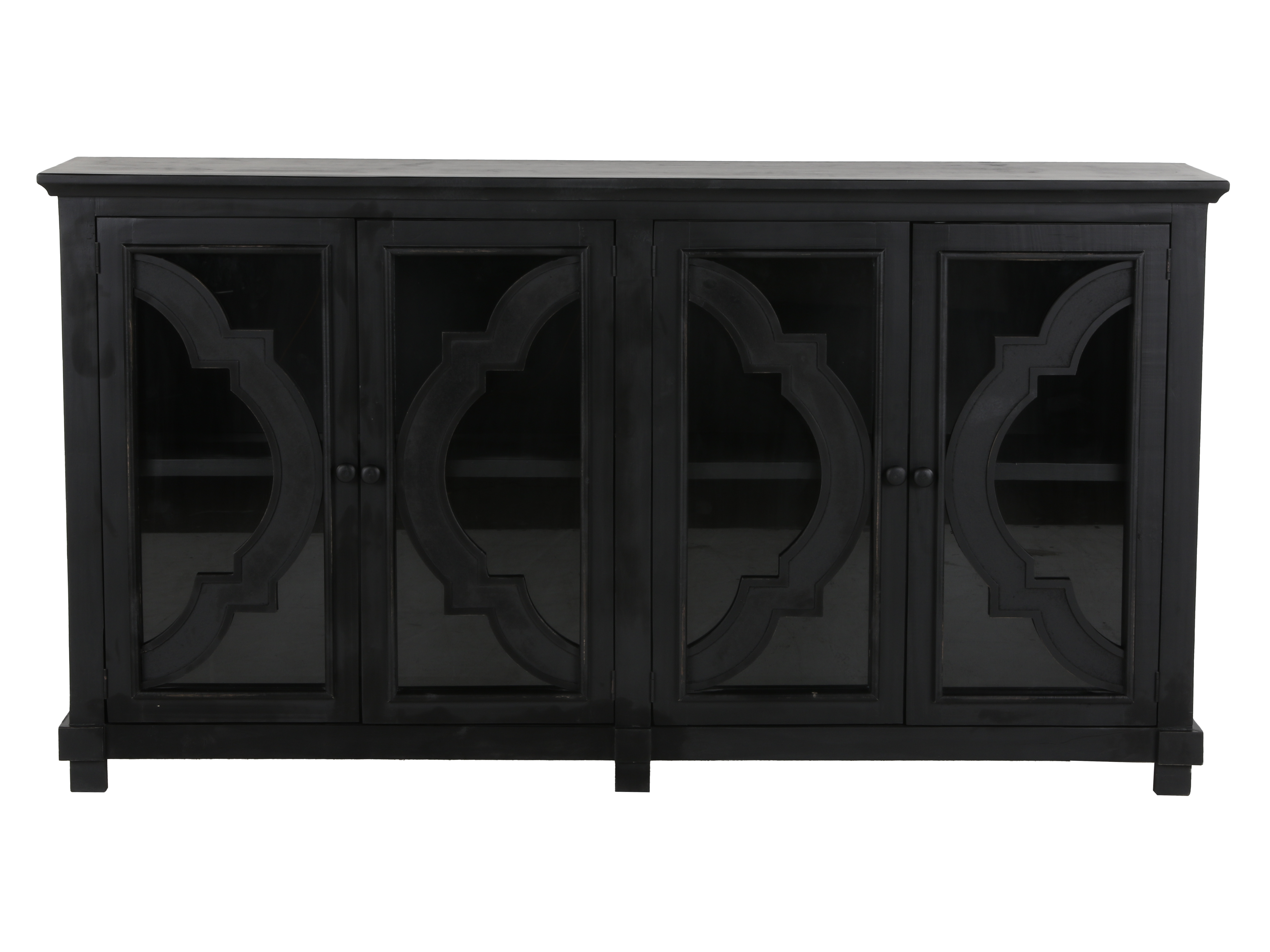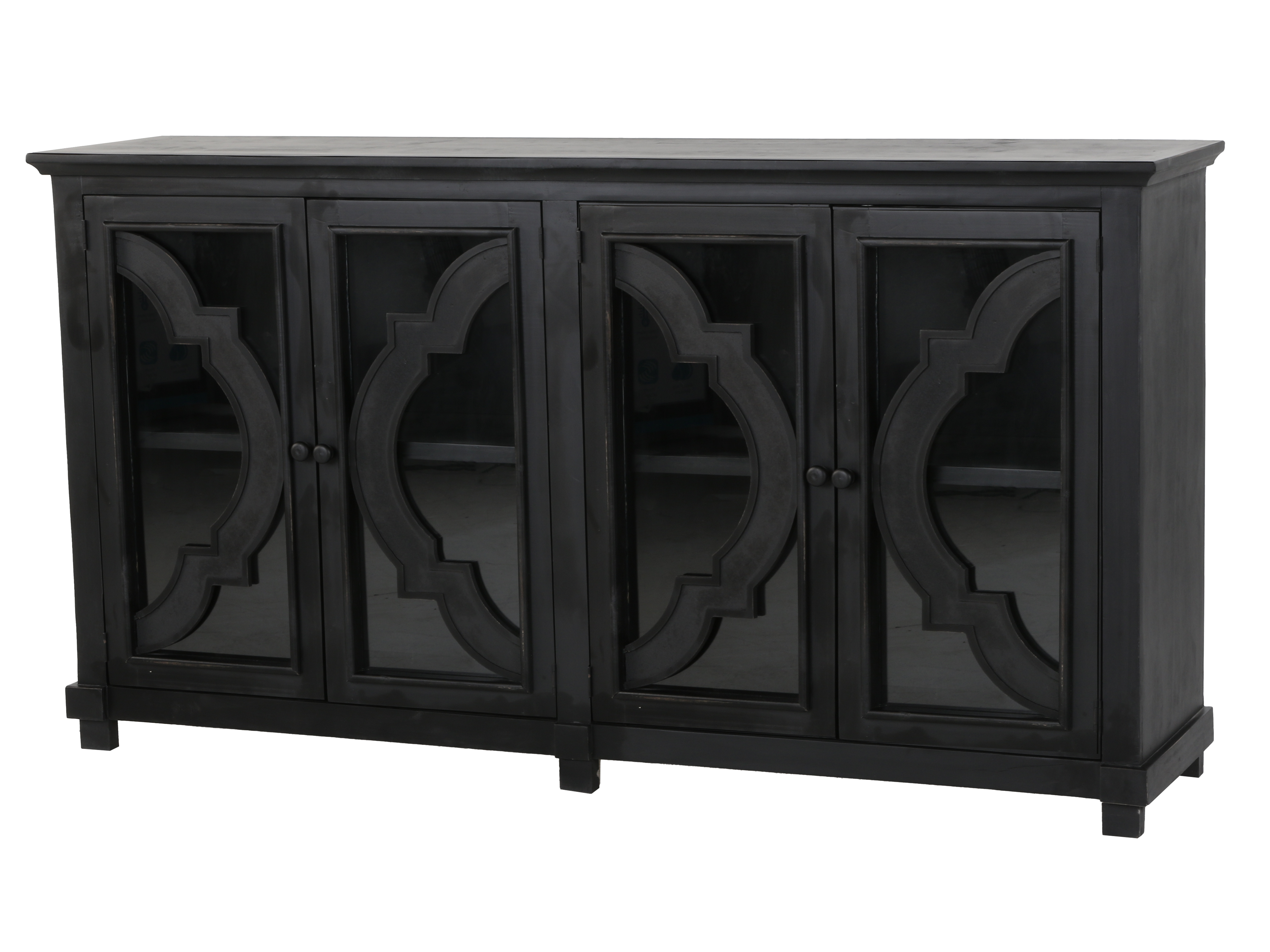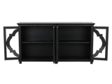 Transform your living room with this stunning 78" TV console, designed to blend functionality with modern elegance. Finished in a sleek black, this console features four doors adorned with an intricate geometric pattern of overlapping circles, adding a touch of sophistication to any space. The clear glass panels behind the doors allow for easy remote access to your electronic devices while keeping them neatly out of sight. Crafted from high-quality wood or wood composite materials, this console offers a sturdy and stylish solution for your entertainment needs.