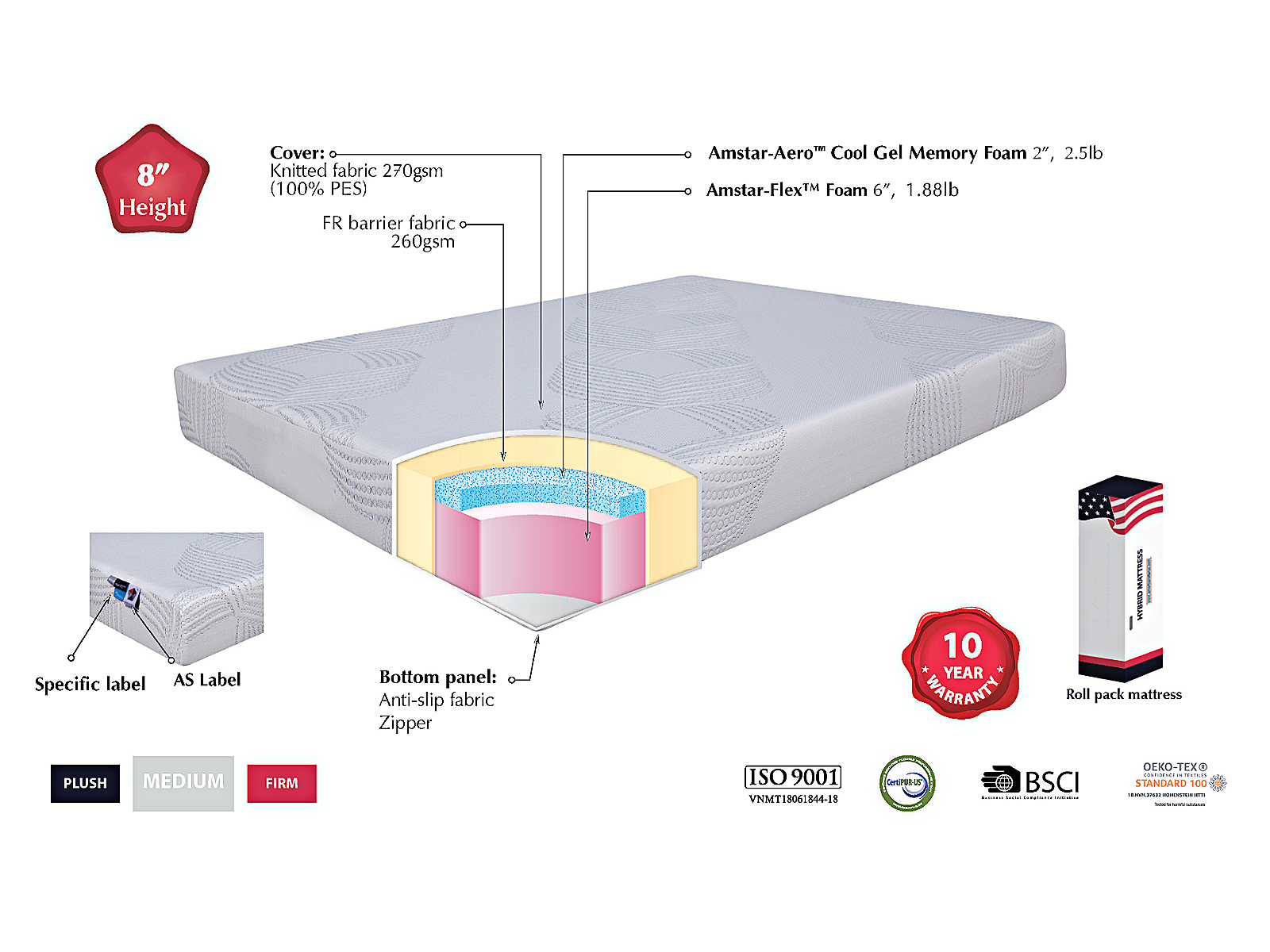• Amstar-Aero™ Cool Gel Memory Foam (2 inches, 2.5lb): This top layer is designed to keep you cool throughout the night by regulating body temperature, ensuring you wake up feeling refreshed.