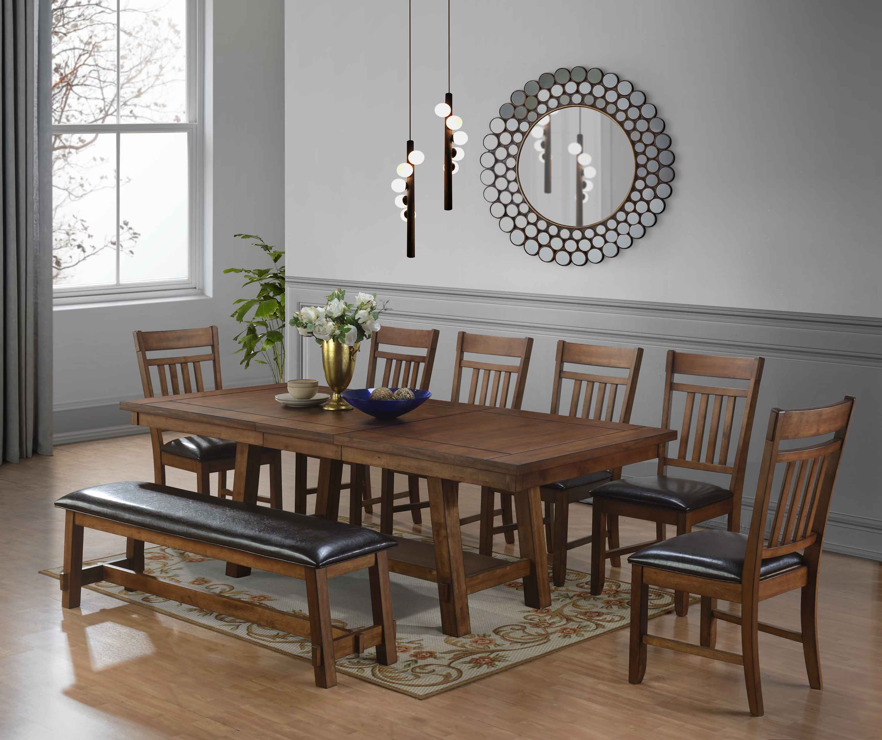 Complete your dining room with this 8-piece extendable dining room set. With a 72-inch table that can extend up to 90 inches, this walnut set comfortably accommodates 8 people. The high-slat back chairs and cushioned bench in PU leather add comfort and style. Upgrade your dinner parties with this elegant set.