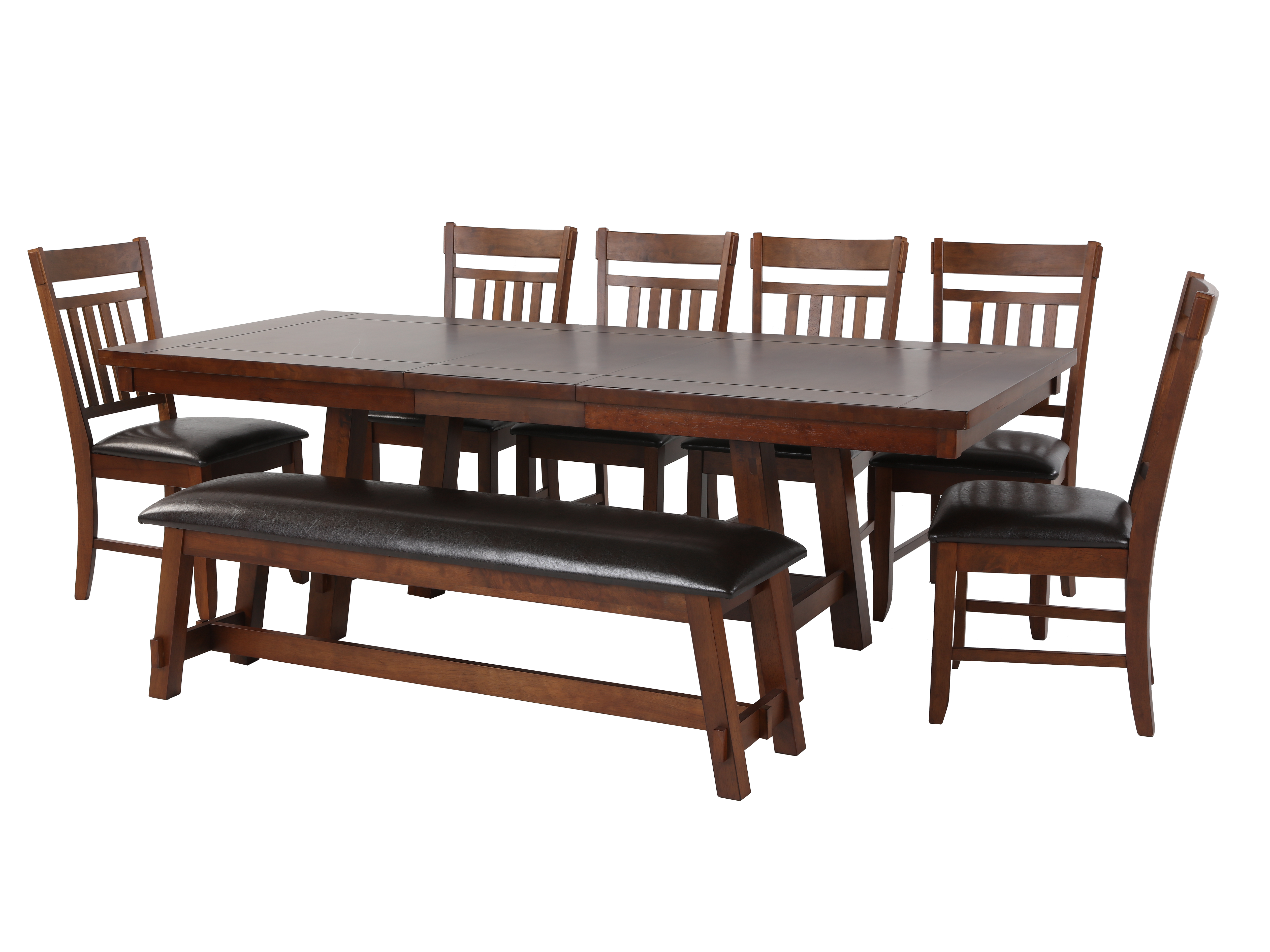 Includes: Dining table, 6 dining chairs, 1 bench.