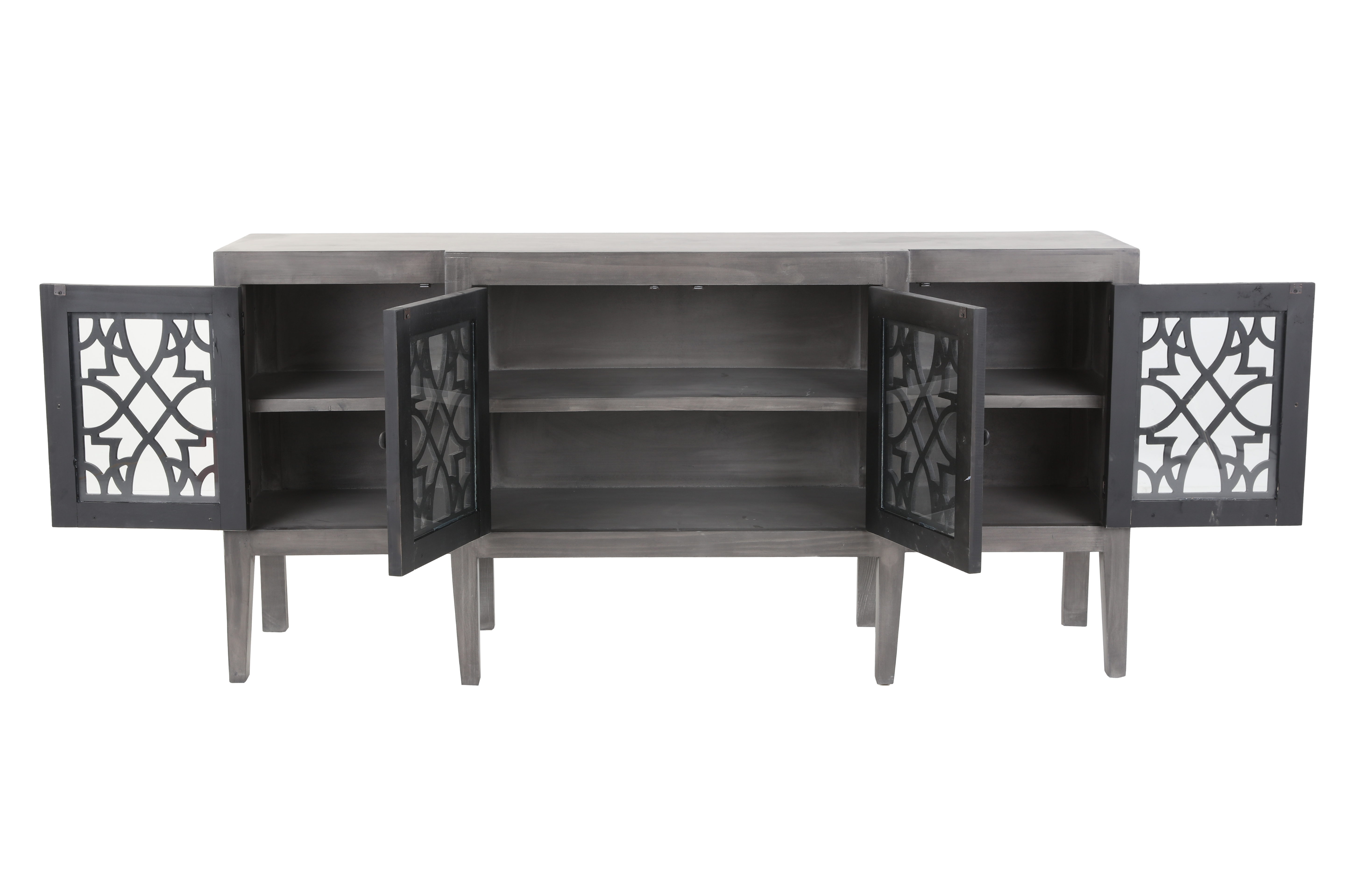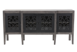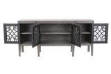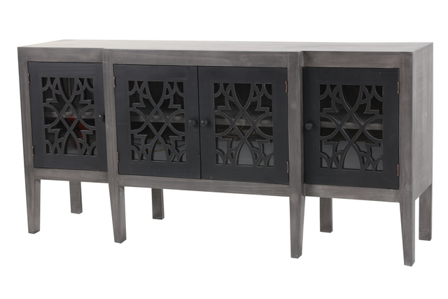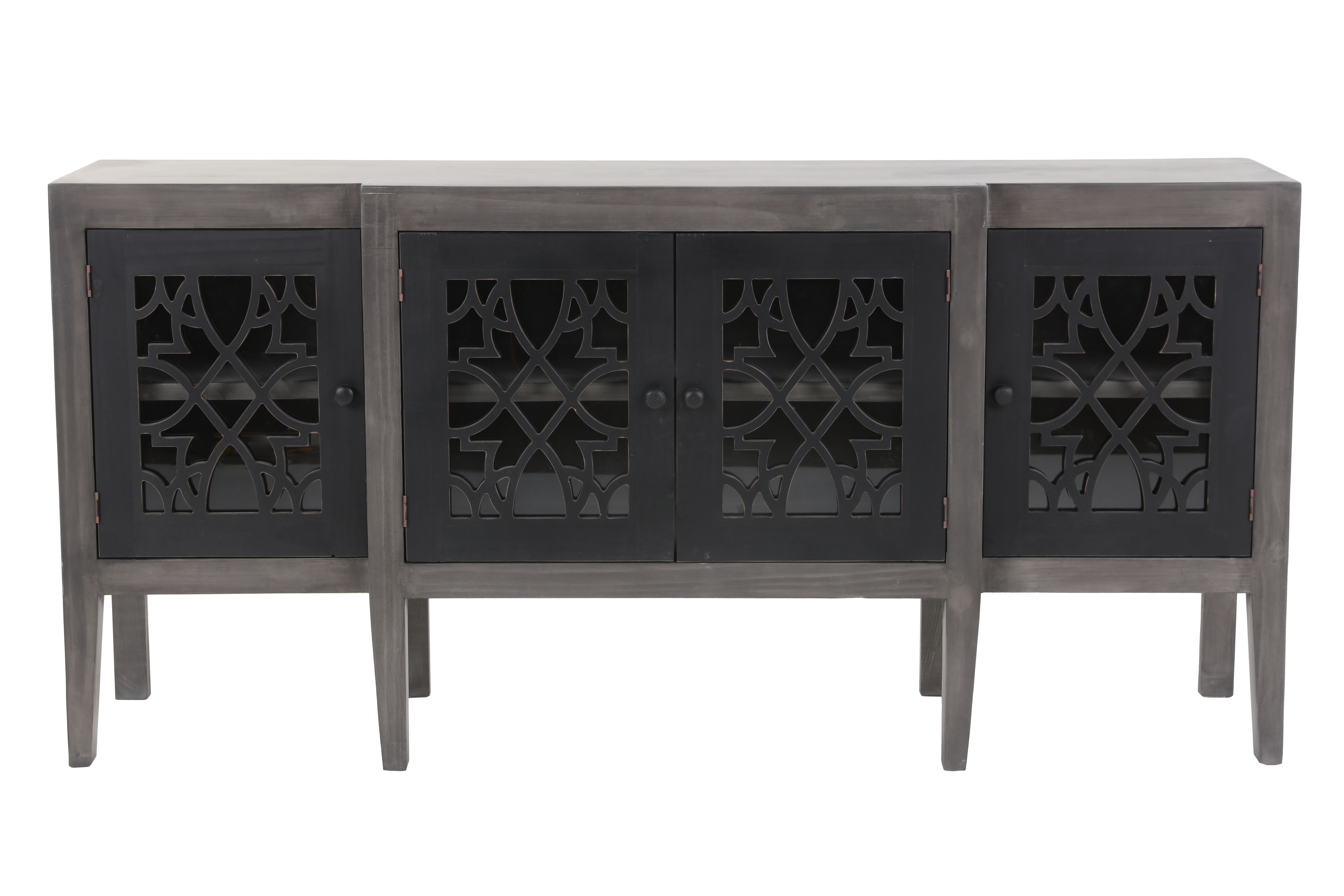Upgrade your entertainment space with this elegant TV console, designed to blend style and functionality seamlessly. The console features a dark gray wood finish, complemented by intricately patterned black metal doors that provide a modern, sophisticated look. With four spacious doors, this console offers ample storage for all your media essentials, from gaming consoles to streaming devices, while keeping them neatly hidden. Its sturdy construction ensures stability, making it suitable for supporting a large TV. Perfect for a living room or media room, this TV console combines practical storage with an eye-catching design that enhances any decor.
